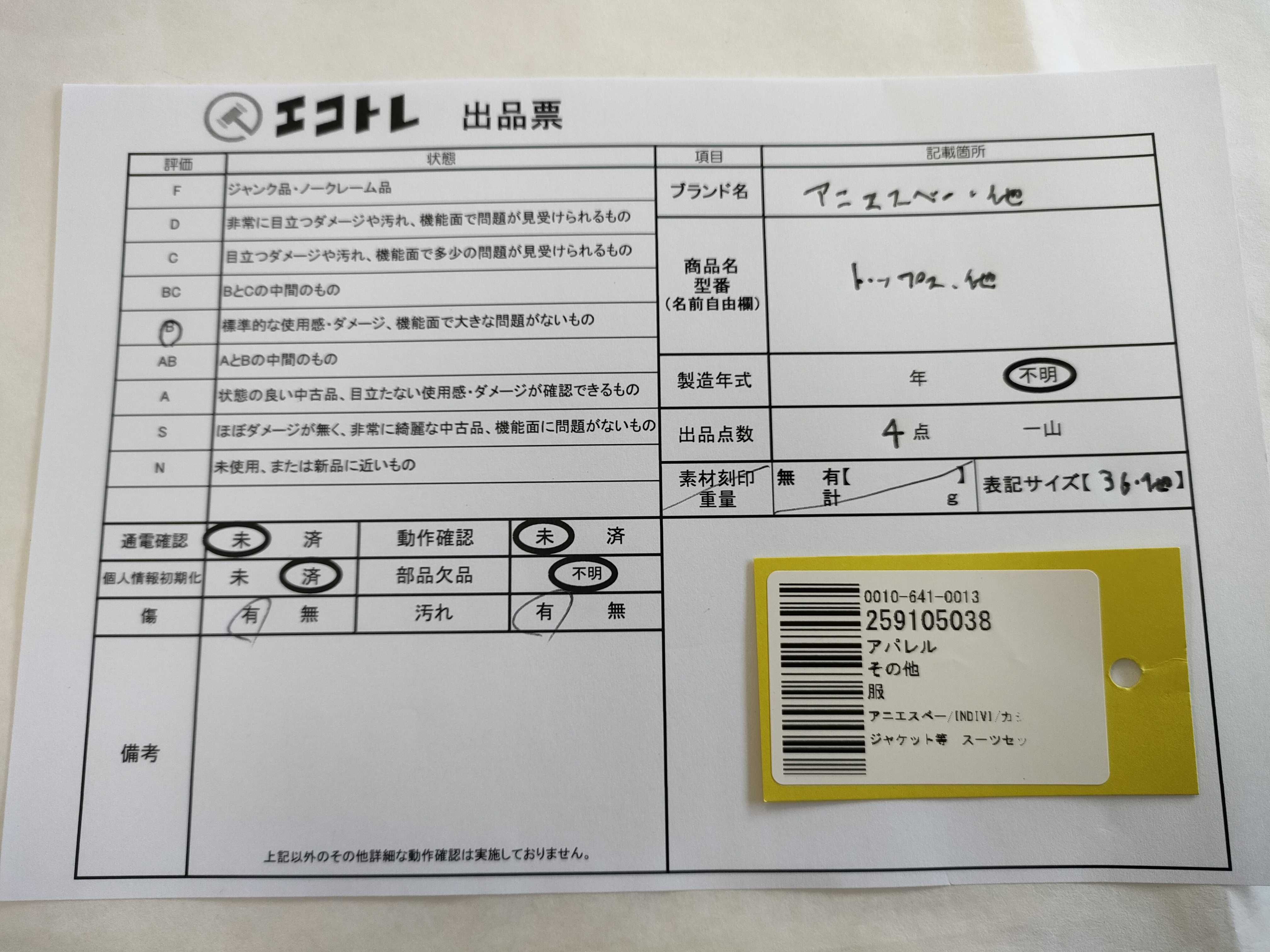 商品内容によって、JITBOXなどでの発送となる可能性がございます事ご理解下さい。年式などの商品情報詳細は写真にてご確認願います。※ご入札の際はご利用規約をよくお読みになってからのご参加お願いします。","タイプライン":"","カテゴリ":"アパレル","形状コード":"トップス","付属品コード":"","シリアル・シール・型番":""
