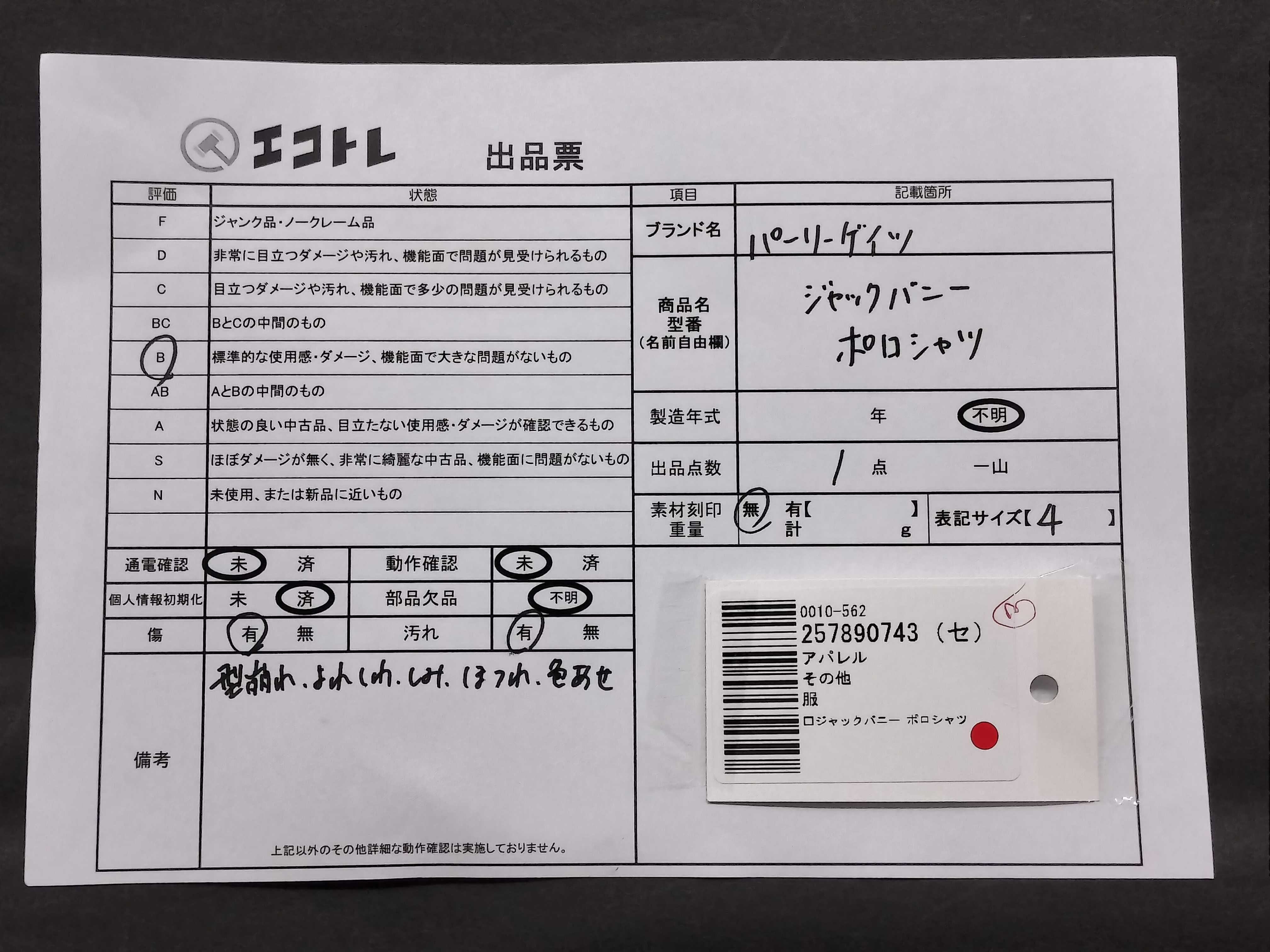 商品内容によって、JITBOXなどでの発送となる可能性がございます事ご理解下さい。年式などの商品情報詳細は写真にてご確認願います。※ご入札の際はご利用規約をよくお読みになってからのご参加お願いします。","タイプライン":"","カテゴリ":"アパレル","形状コード":"トップス","付属品コード":"","シリアル・シール・型番":""