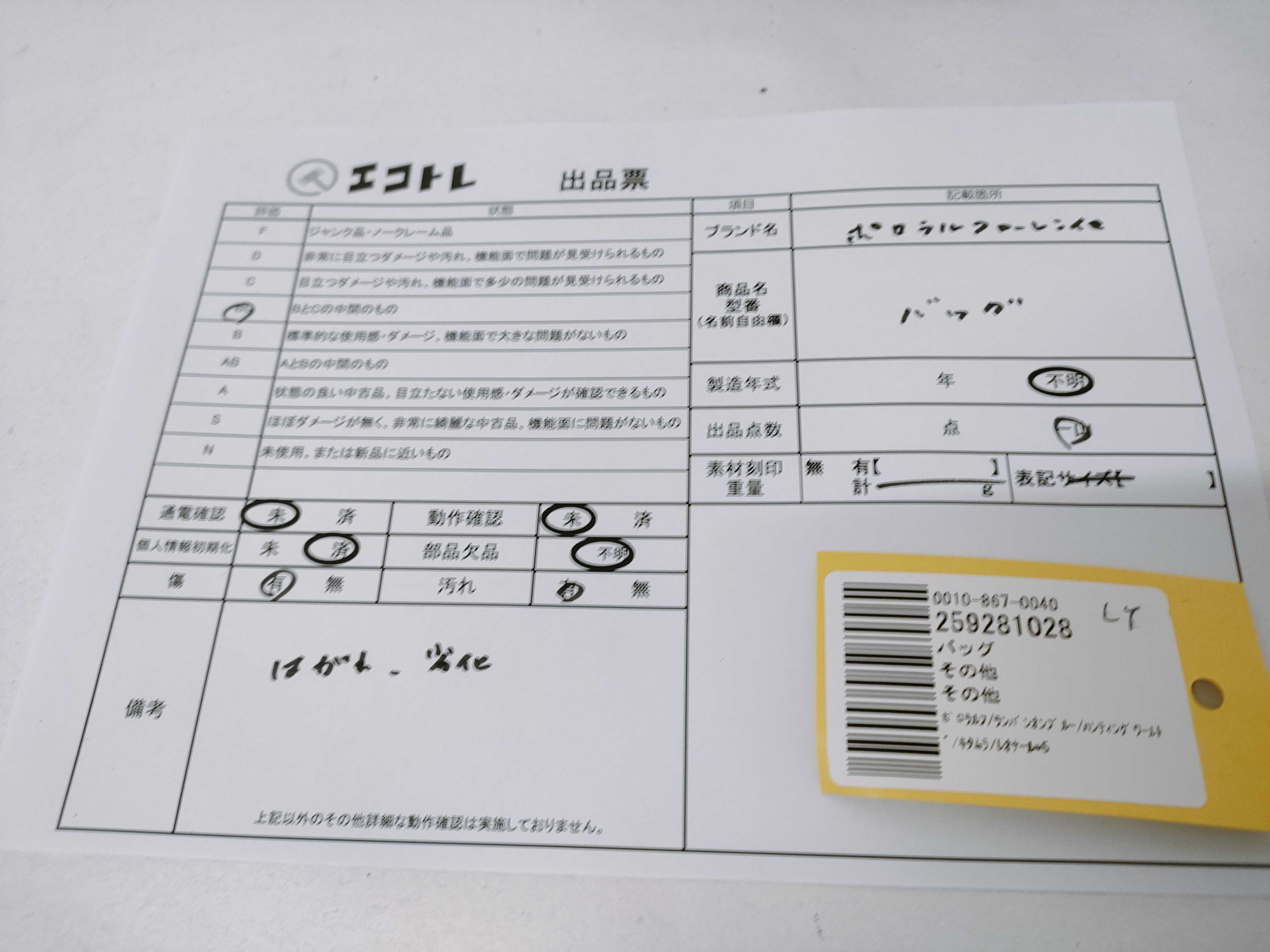 商品内容によって、JITBOXなどでの発送となる可能性がございます事ご理解下さい。年式などの商品情報詳細は写真にてご確認願います。※ご入札の際はご利用規約をよくお読みになってからのご参加お願いします。","タイプライン":"","カテゴリ":"バッグ","形状コード":"トートバッグ","付属品コード":"","シリアル・シール・型番":""
