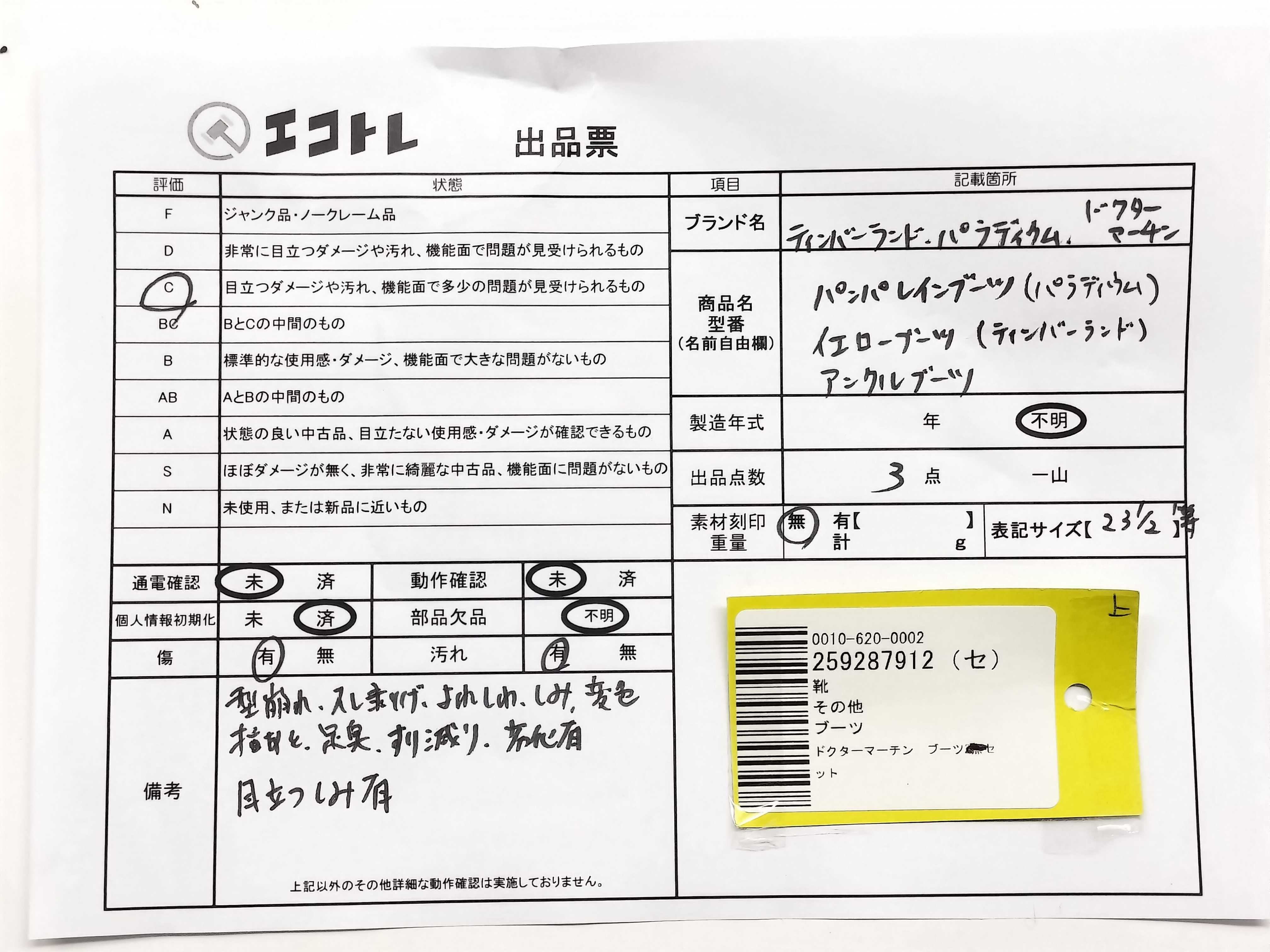 商品内容によって、JITBOXなどでの発送となる可能性がございます事ご理解下さい。年式などの商品情報詳細は写真にてご確認願います。※ご入札の際はご利用規約をよくお読みになってからのご参加お願いします。","タイプライン":"","カテゴリ":"靴","形状コード":"その他靴","付属品コード":"","シリアル・シール・型番":""