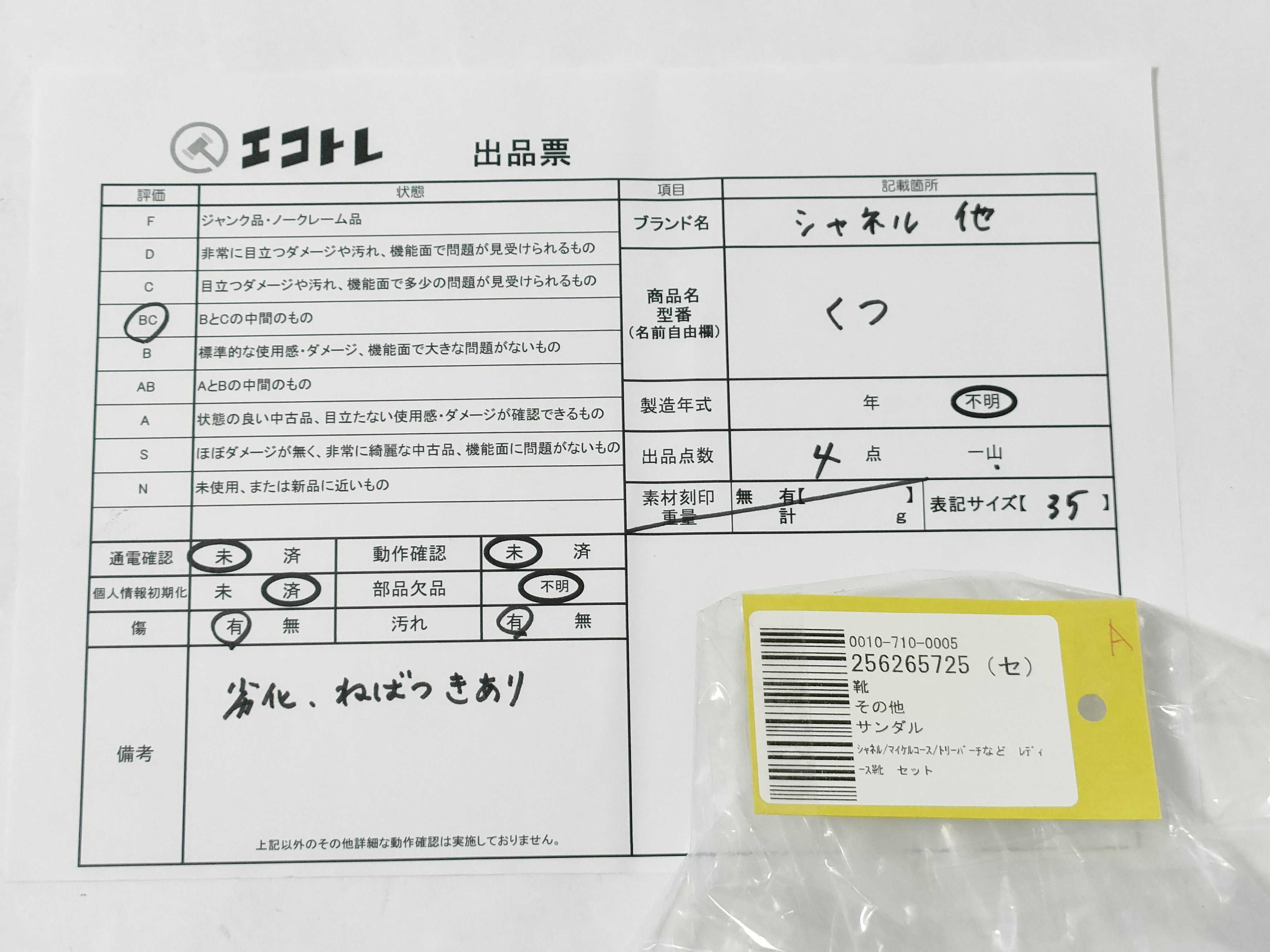 商品内容によって、JITBOXなどでの発送となる可能性がございます事ご理解下さい。年式などの商品情報詳細は写真にてご確認願います。※ご入札の際はご利用規約をよくお読みになってからのご参加お願いします。","タイプライン":"","カテゴリ":"靴","形状コード":"サンダル","付属品コード":"","シリアル・シール・型番":""