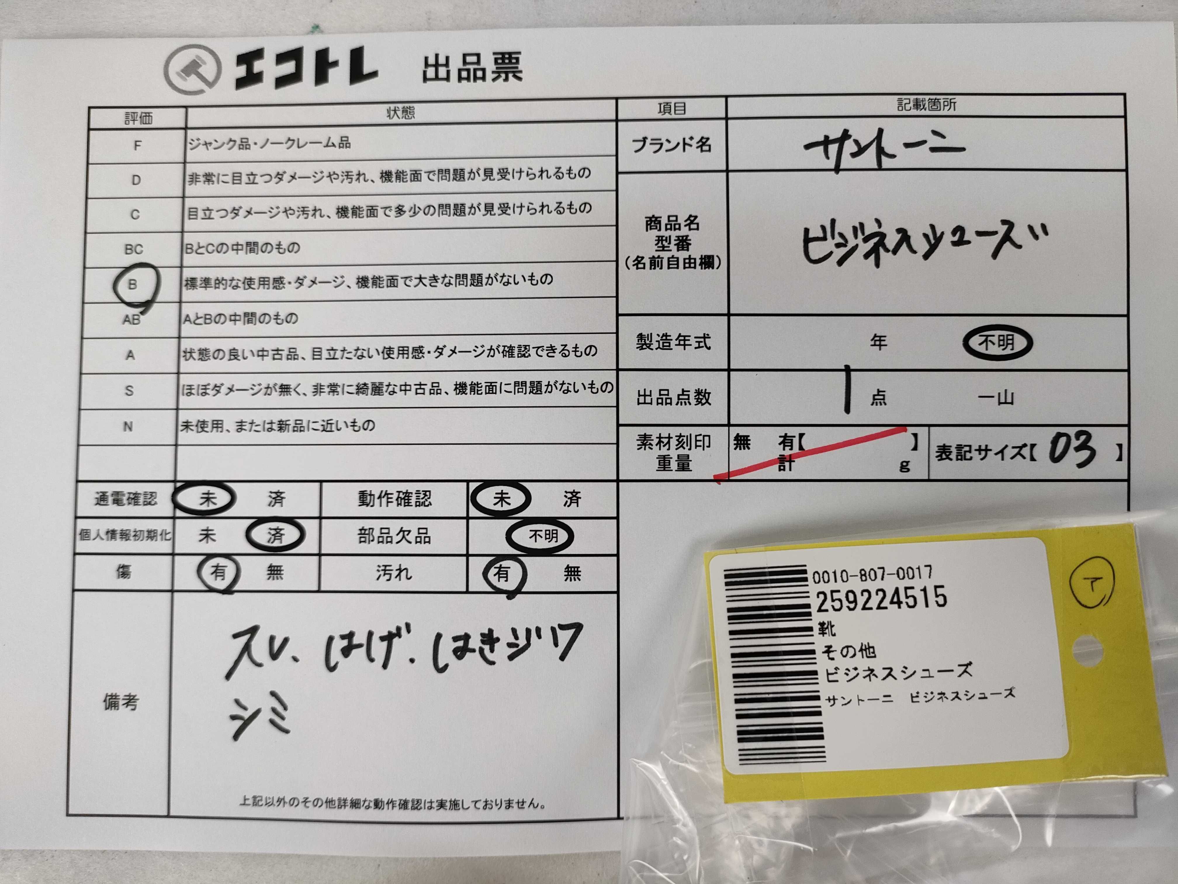 商品内容によって、JITBOXなどでの発送となる可能性がございます事ご理解下さい。年式などの商品情報詳細は写真にてご確認願います。※ご入札の際はご利用規約をよくお読みになってからのご参加お願いします。","タイプライン":"","カテゴリ":"靴","形状コード":"ビジネスシューズ","付属品コード":"","シリアル・シール・型番":""