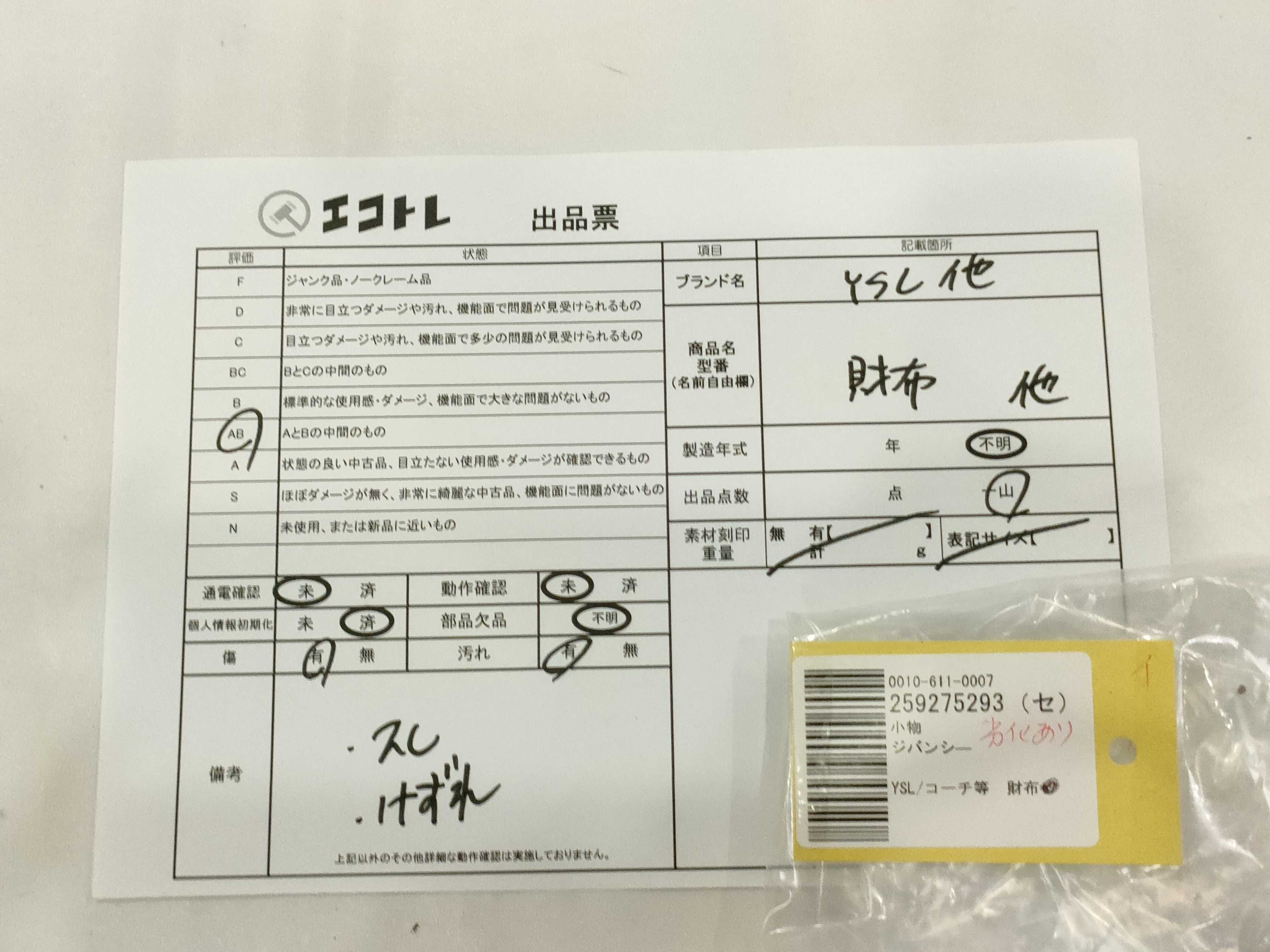 商品内容によって、JITBOXなどでの発送となる可能性がございます事ご理解下さい。年式などの商品情報詳細は写真にてご確認願います。※ご入札の際はご利用規約をよくお読みになってからのご参加お願いします。","タイプライン":"","カテゴリ":"小物","形状コード":"財布","付属品コード":"","シリアル・シール・型番":""