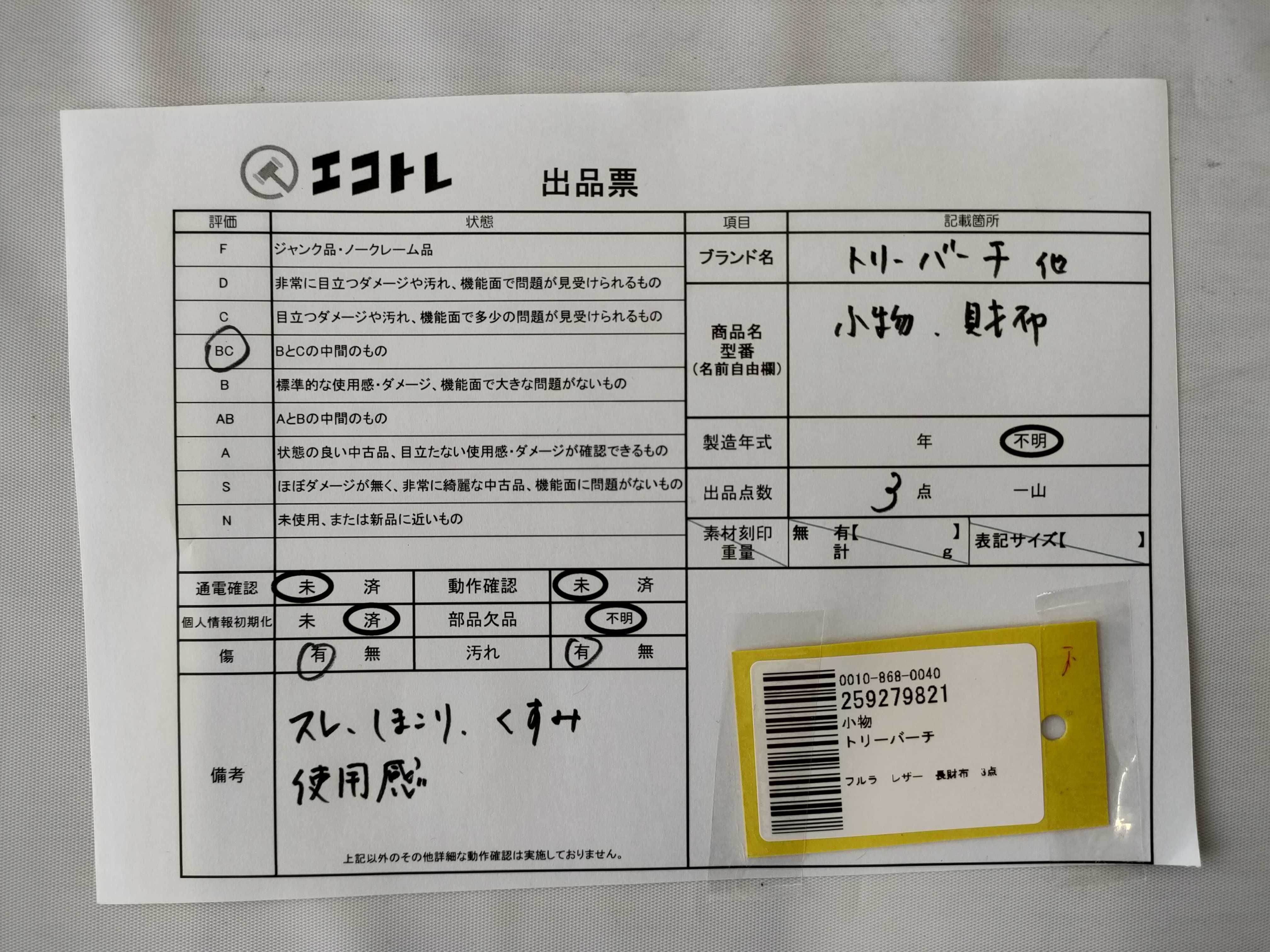 商品内容によって、JITBOXなどでの発送となる可能性がございます事ご理解下さい。年式などの商品情報詳細は写真にてご確認願います。※ご入札の際はご利用規約をよくお読みになってからのご参加お願いします。","タイプライン":"","カテゴリ":"小物","形状コード":"財布","付属品コード":"","シリアル・シール・型番":""