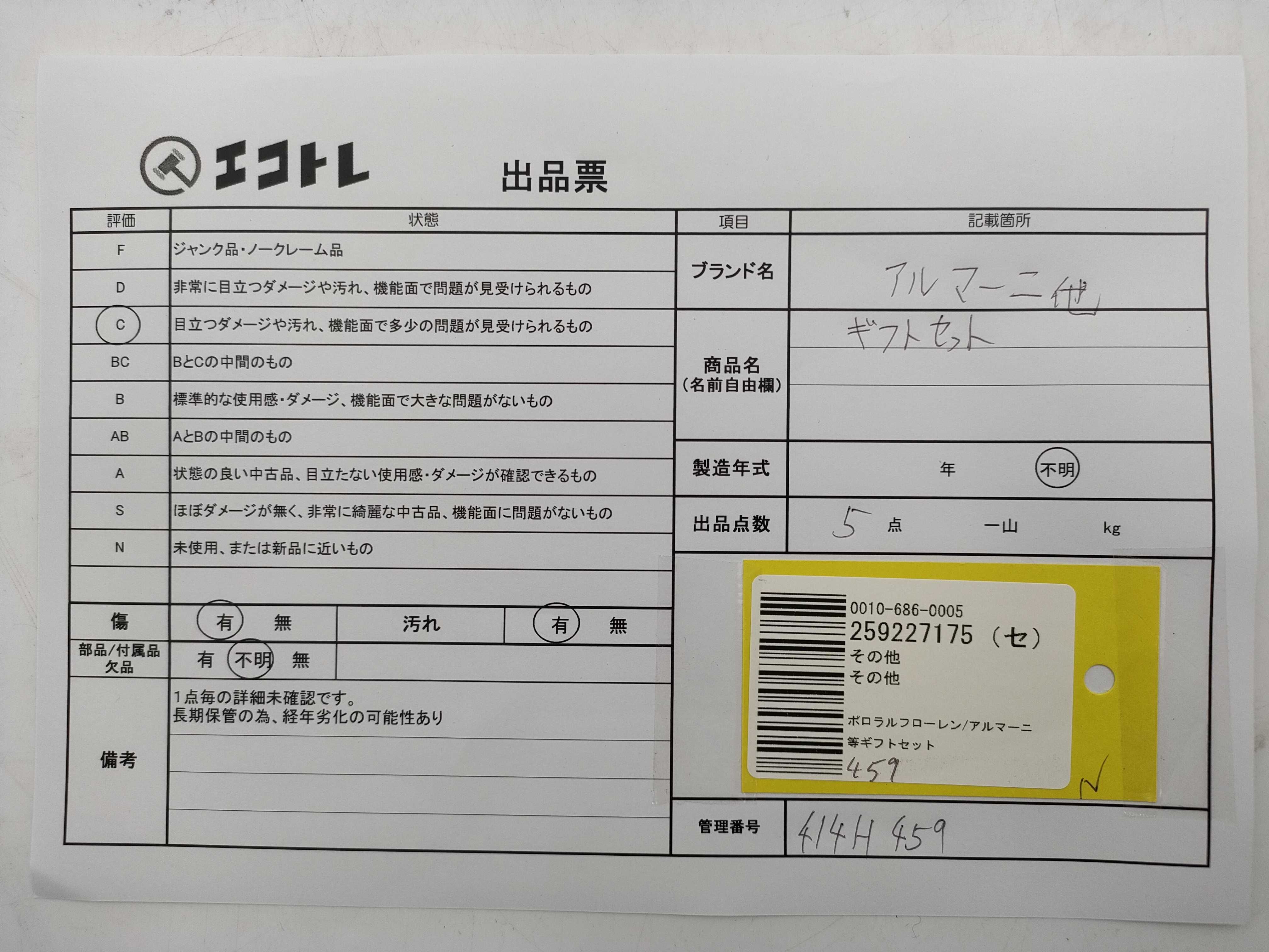 商品内容によって、JITBOXなどでの発送となる可能性がございます事ご理解下さい。年式などの商品情報詳細は写真にてご確認願います。※ご入札の際はご利用規約をよくお読みになってからのご参加お願いします。","タイプライン":"","カテゴリ":"小物","形状コード":"ギフト","付属品コード":"","シリアル・シール・型番":""