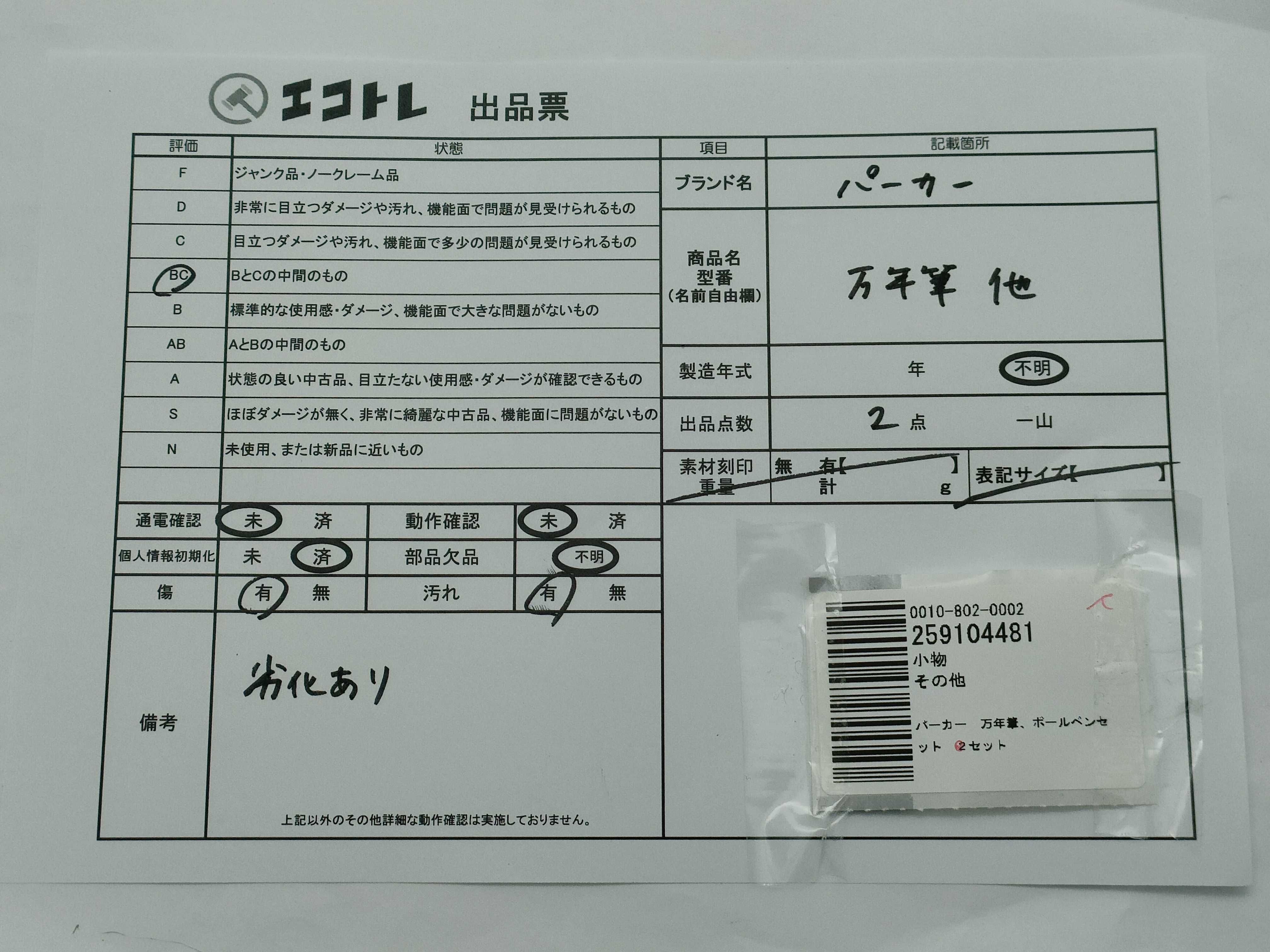 商品内容によって、JITBOXなどでの発送となる可能性がございます事ご理解下さい。年式などの商品情報詳細は写真にてご確認願います。※ご入札の際はご利用規約をよくお読みになってからのご参加お願いします。","タイプライン":"","カテゴリ":"小物","形状コード":"ペン・万年筆","付属品コード":"","シリアル・シール・型番":""