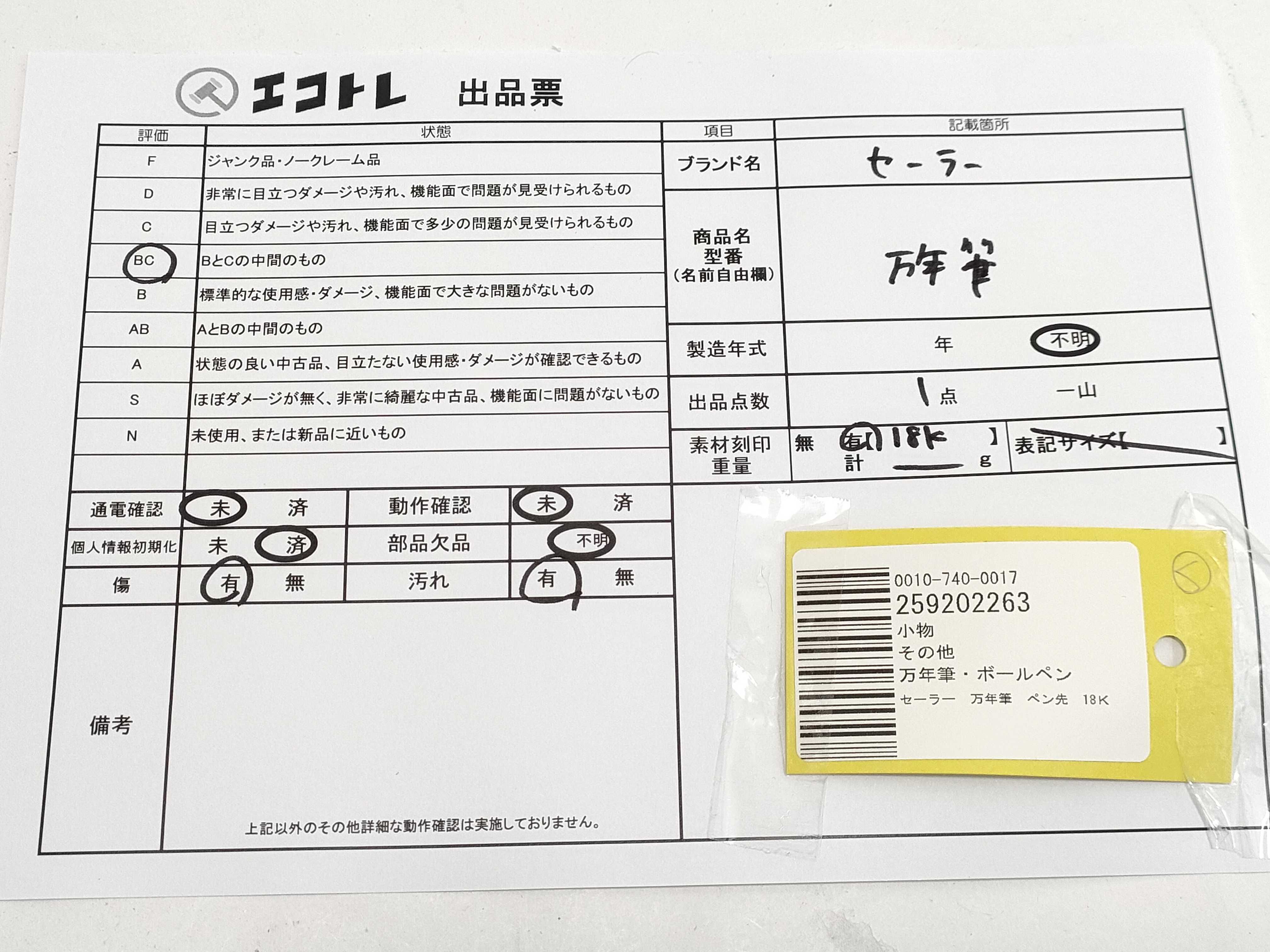 商品内容によって、JITBOXなどでの発送となる可能性がございます事ご理解下さい。年式などの商品情報詳細は写真にてご確認願います。※ご入札の際はご利用規約をよくお読みになってからのご参加お願いします。","タイプライン":"","カテゴリ":"小物","形状コード":"ペン・万年筆","付属品コード":"","シリアル・シール・型番":""