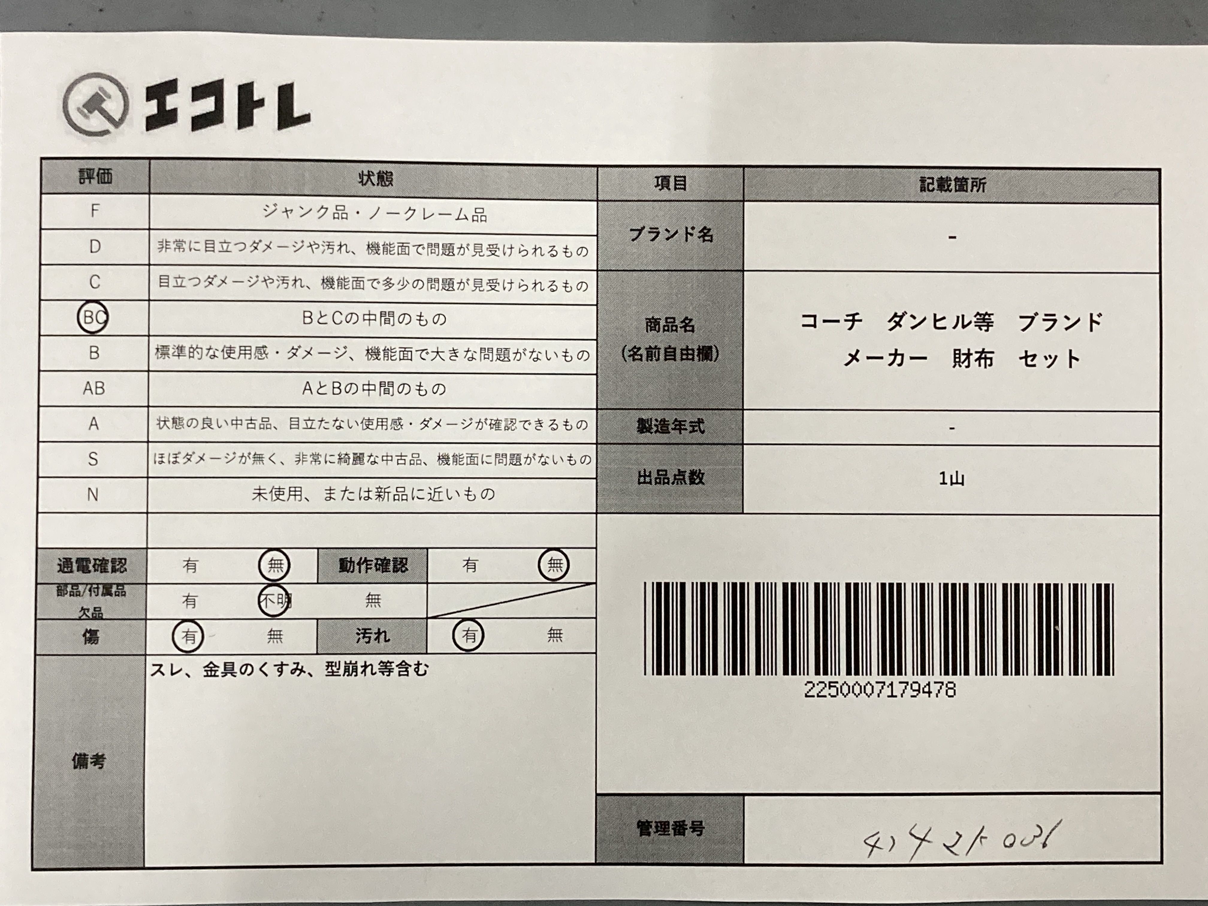 商品内容によって、JITBOXなどでの発送となる可能性がございます事ご理解下さい。年式などの商品情報詳細は写真にてご確認願います。※ご入札の際はご利用規約をよくお読みになってからのご参加お願いします。","タイプライン":"","カテゴリ":"小物","形状コード":"財布","付属品コード":"","シリアル・シール・型番":""