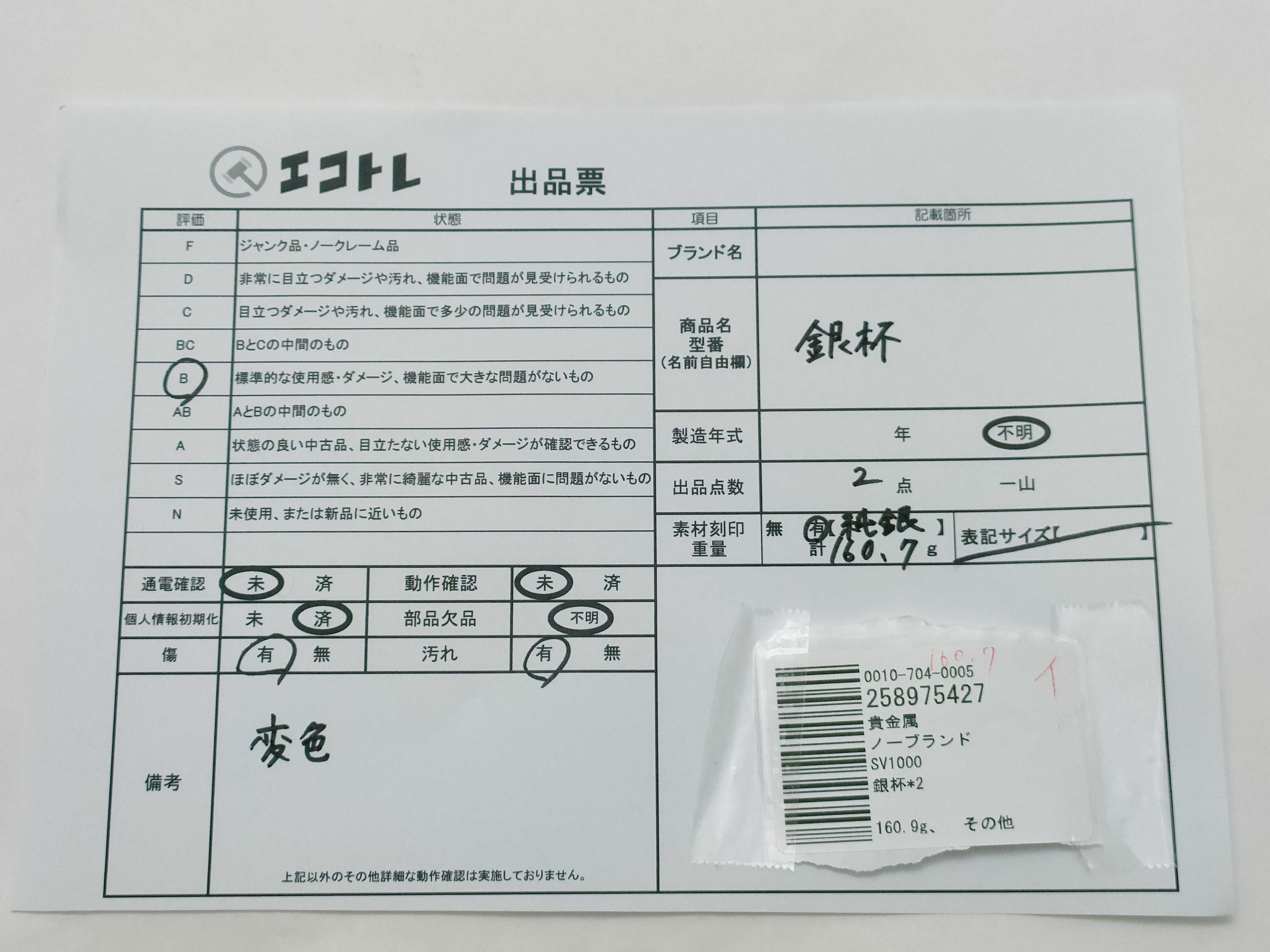 (J_0576)▼銀杯*2 SV1000 160.9g その他小物