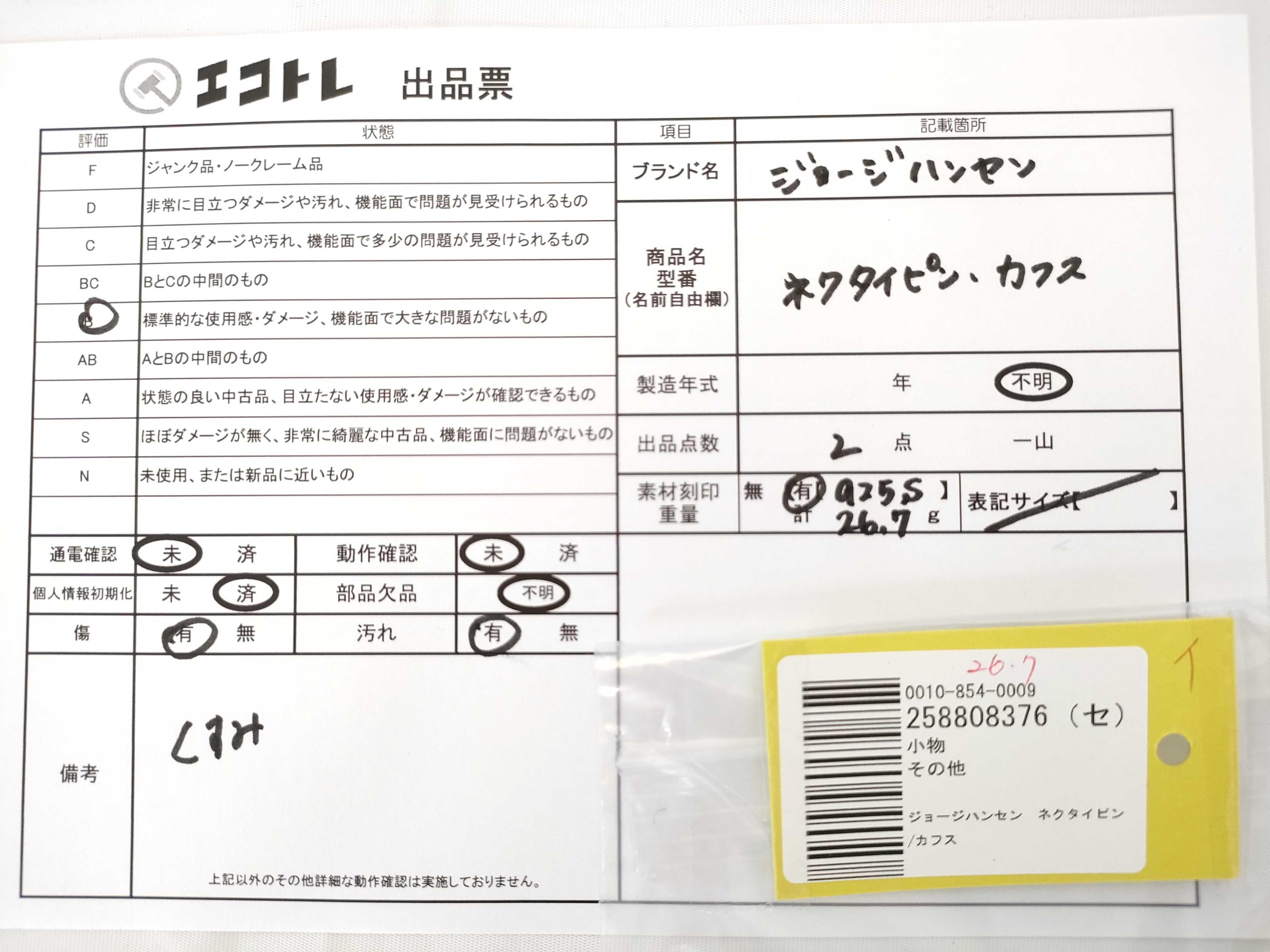 商品内容によって、JITBOXなどでの発送となる可能性がございます事ご理解下さい。年式などの商品情報詳細は写真にてご確認願います。※ご入札の際はご利用規約をよくお読みになってからのご参加お願いします。","タイプライン":"","カテゴリ":"小物","形状コード":"ネクタイピン・カフス","付属品コード":"","シリアル・シール・型番":""