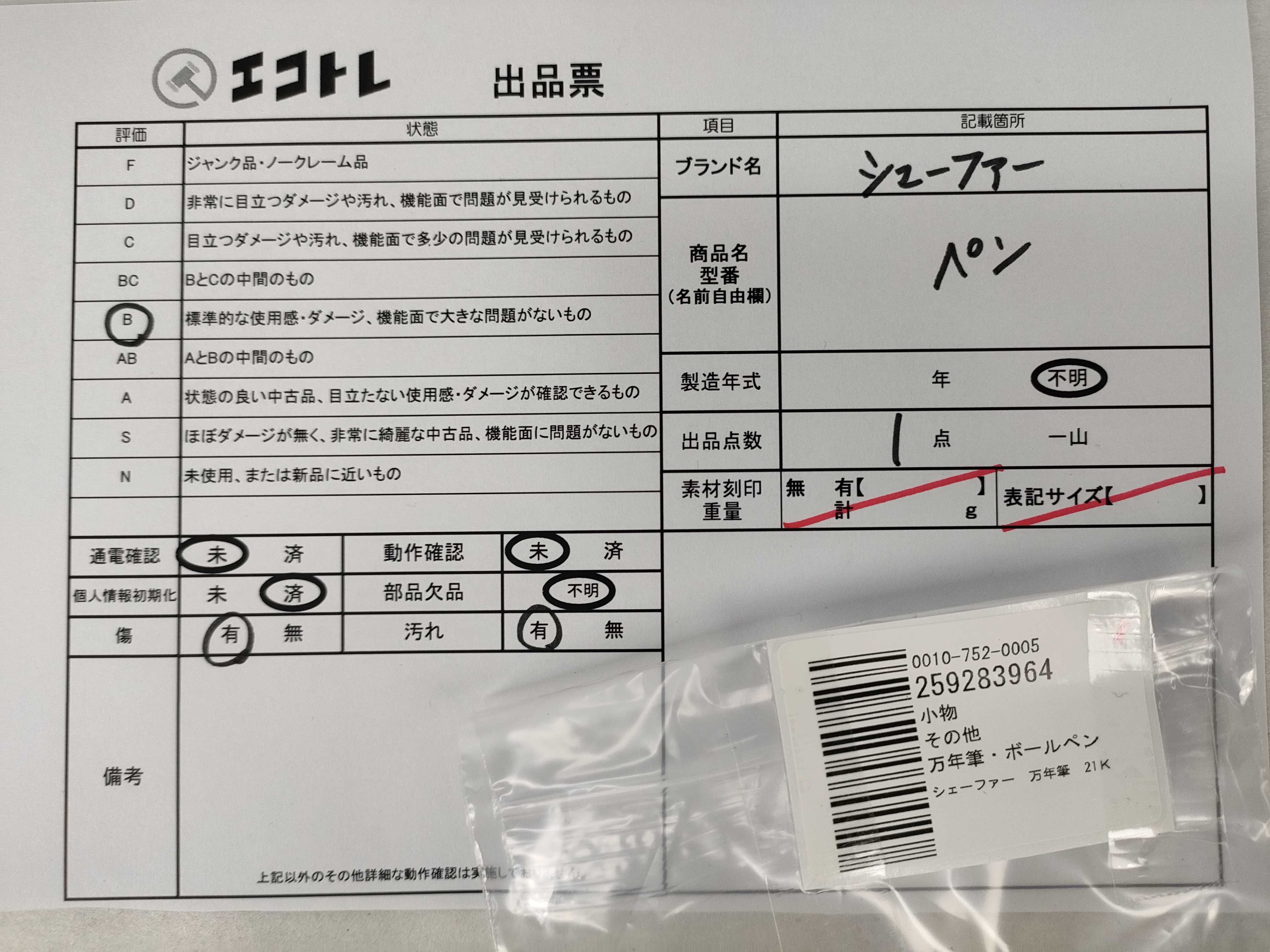 商品内容によって、JITBOXなどでの発送となる可能性がございます事ご理解下さい。年式などの商品情報詳細は写真にてご確認願います。※ご入札の際はご利用規約をよくお読みになってからのご参加お願いします。","タイプライン":"","カテゴリ":"小物","形状コード":"ペン・万年筆","付属品コード":"","シリアル・シール・型番":""