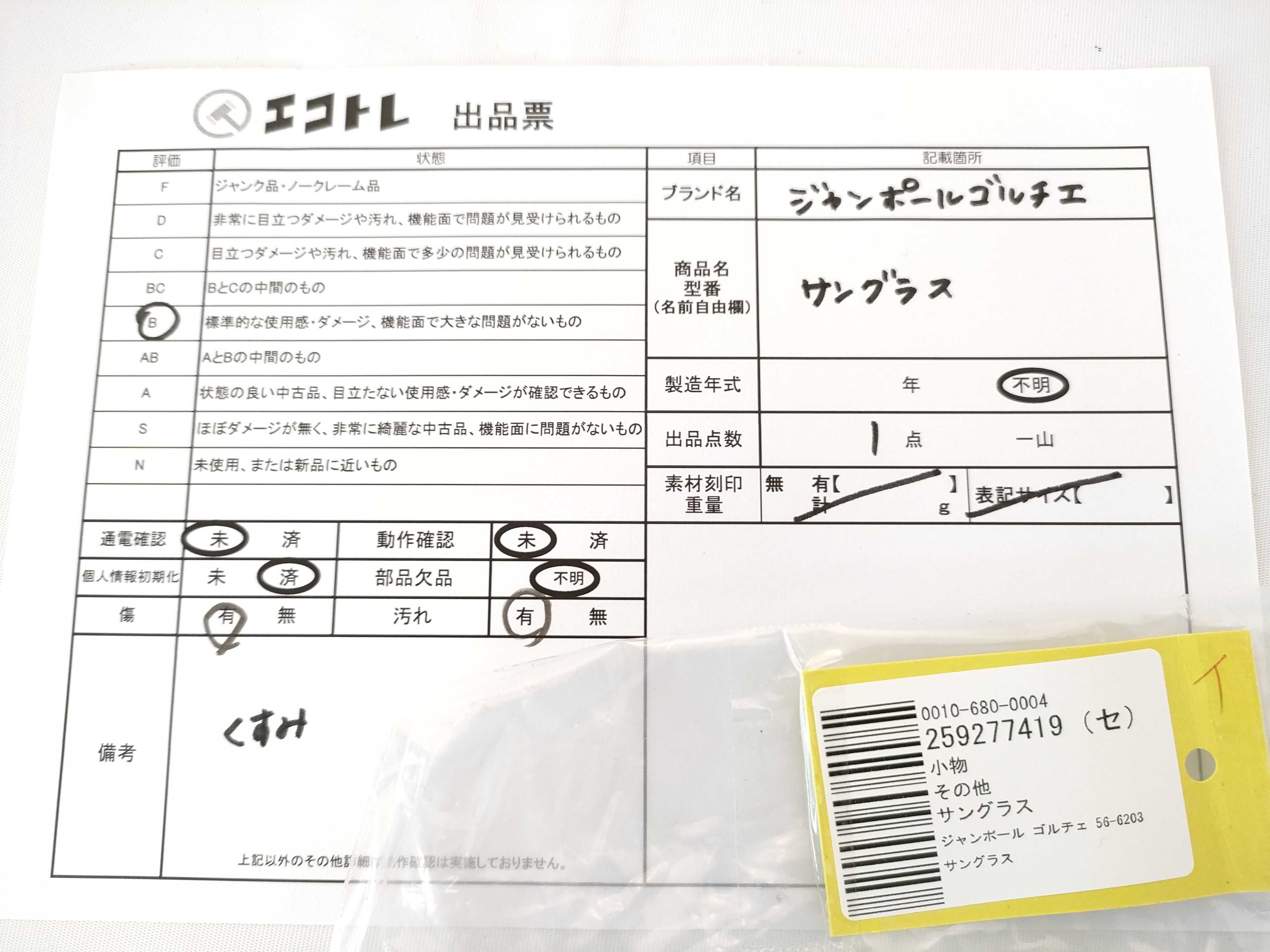 ◆CAN’T SHIPPING TO USA◆商品内容によって、JITBOXなどでの発送となる可能性がございます事ご理解下さい。年式などの商品情報詳細は写真にてご確認願います。※ご入札の際はご利用規約をよくお読みになってからのご参加お願いします。","タイプライン":"","カテゴリ":"小物","形状コード":"サングラス・メガネ","付属品コード":"","シリアル・シール・型番":""