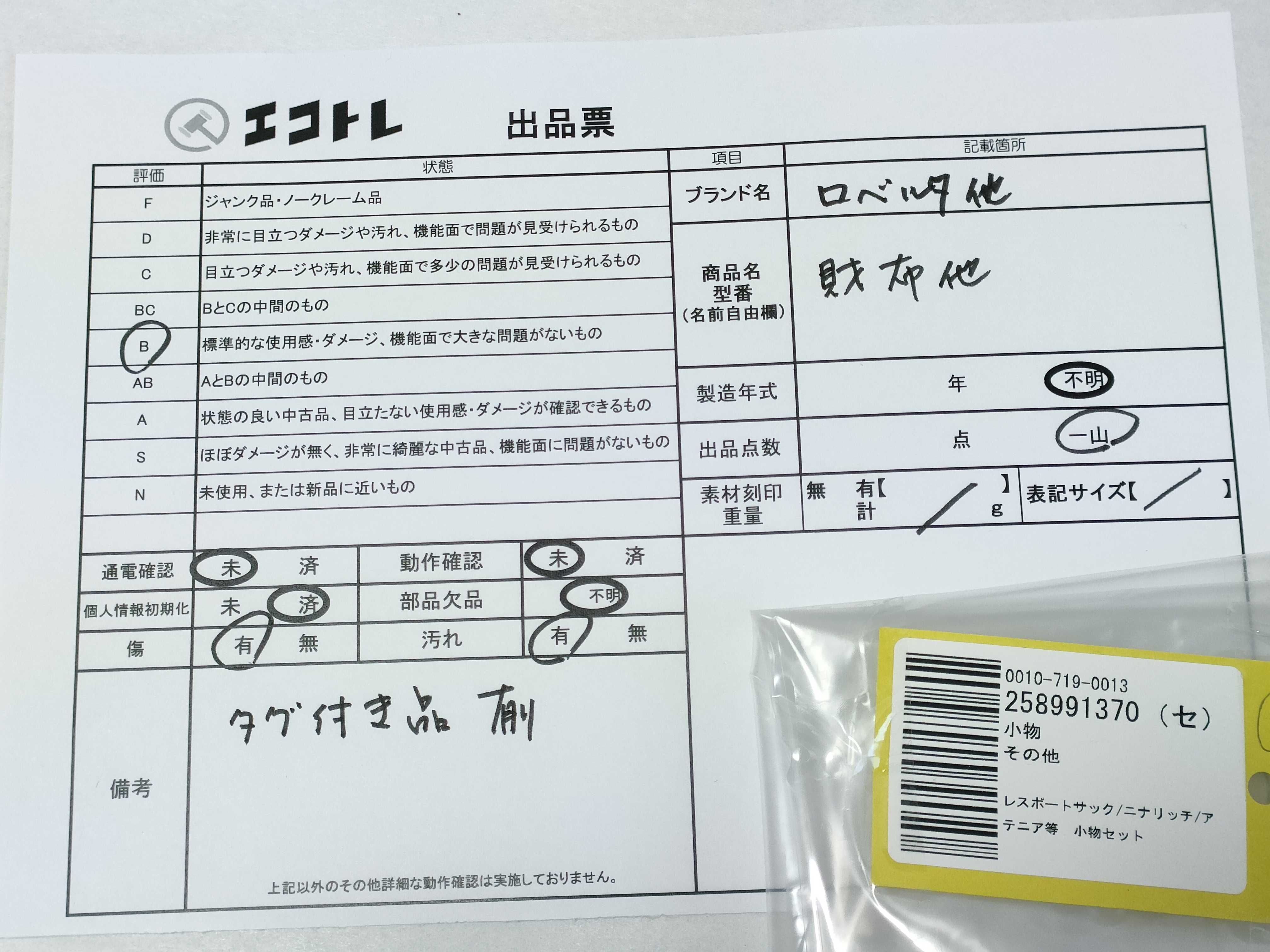 商品内容によって、JITBOXなどでの発送となる可能性がございます事ご理解下さい。年式などの商品情報詳細は写真にてご確認願います。※ご入札の際はご利用規約をよくお読みになってからのご参加お願いします。","タイプライン":"","カテゴリ":"小物","形状コード":"財布","付属品コード":"","シリアル・シール・型番":""
