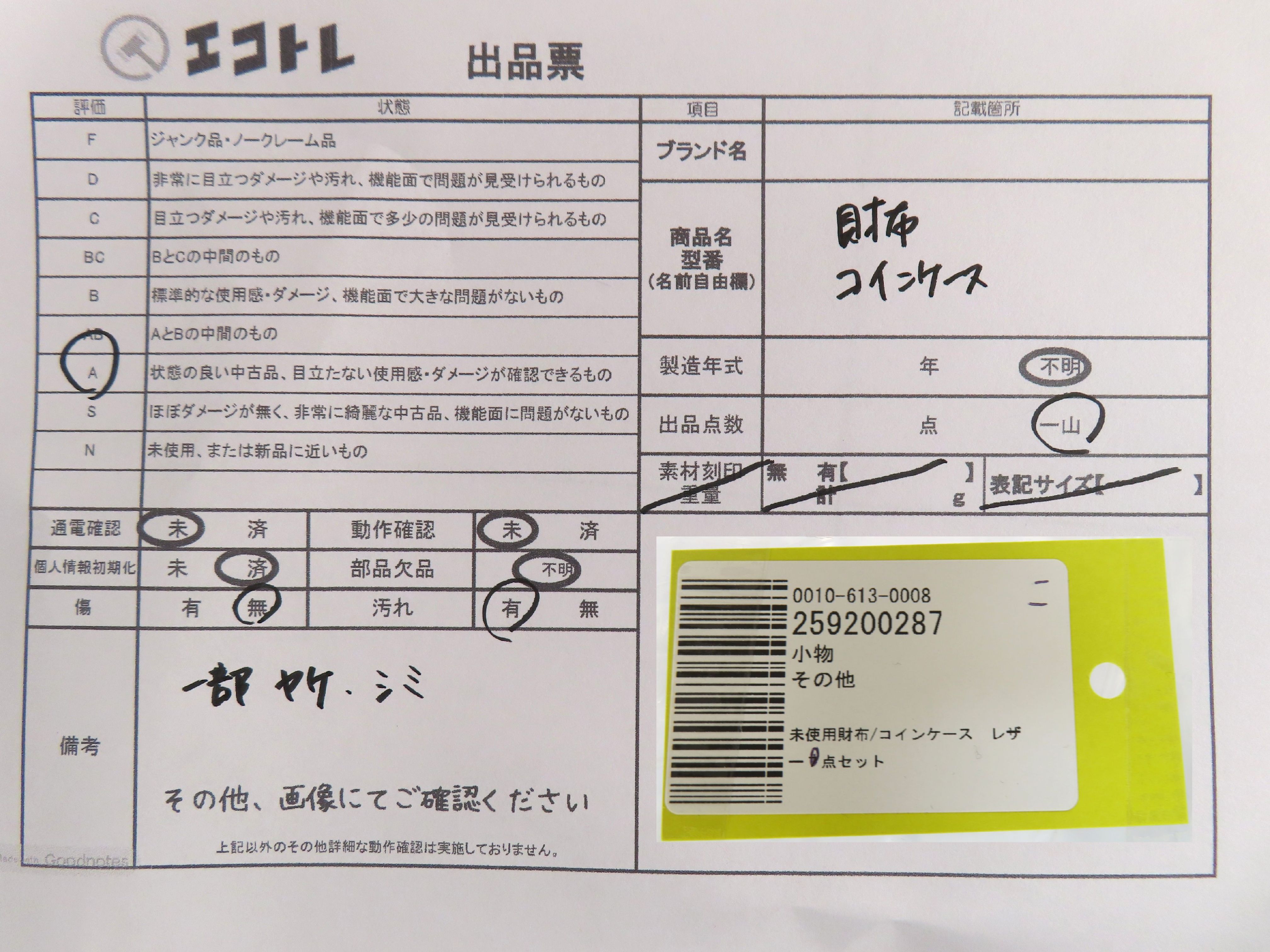 商品内容によって、JITBOXなどでの発送となる可能性がございます事ご理解下さい。年式などの商品情報詳細は写真にてご確認願います。※ご入札の際はご利用規約をよくお読みになってからのご参加お願いします。","タイプライン":"","カテゴリ":"小物","形状コード":"財布","付属品コード":"","シリアル・シール・型番":""
