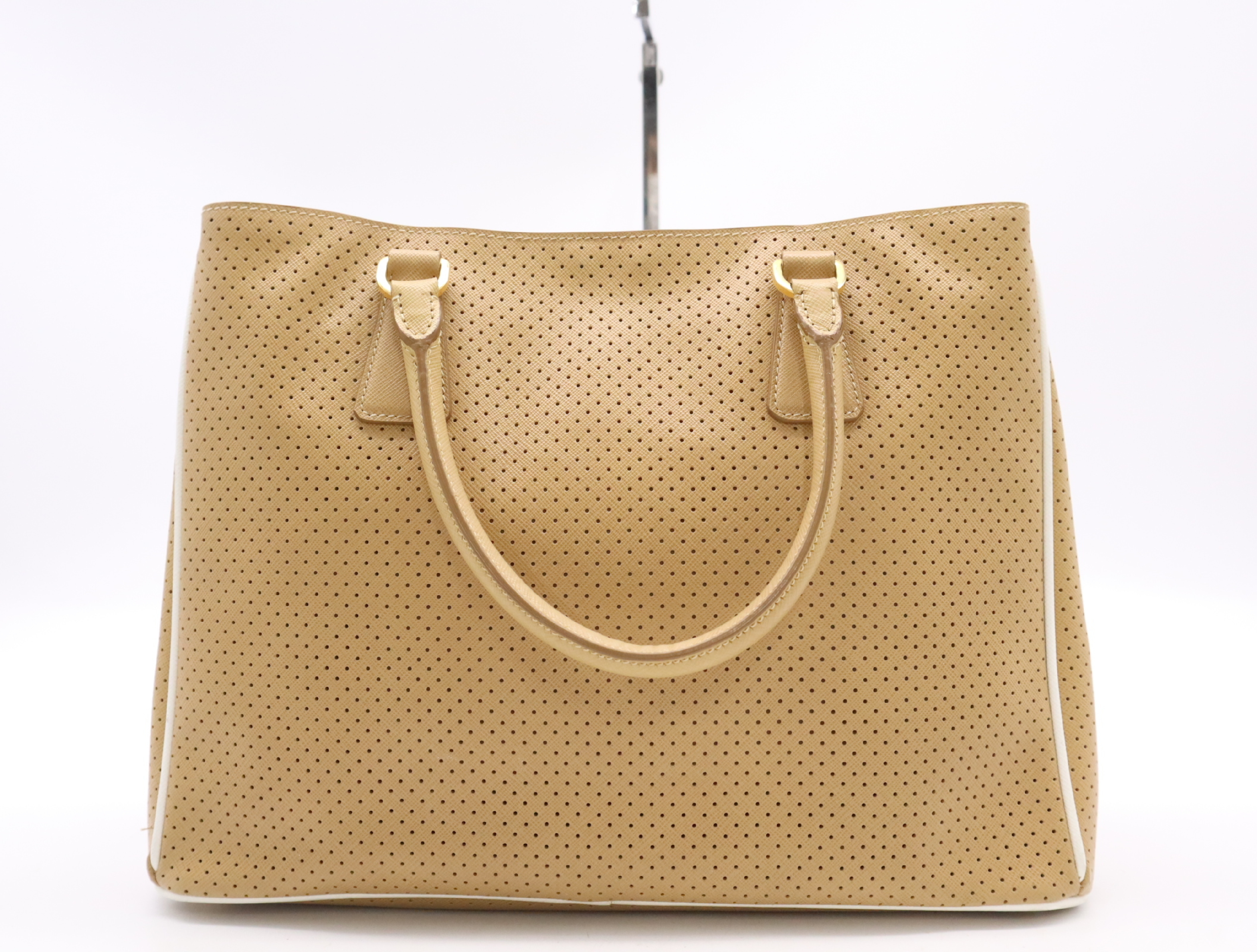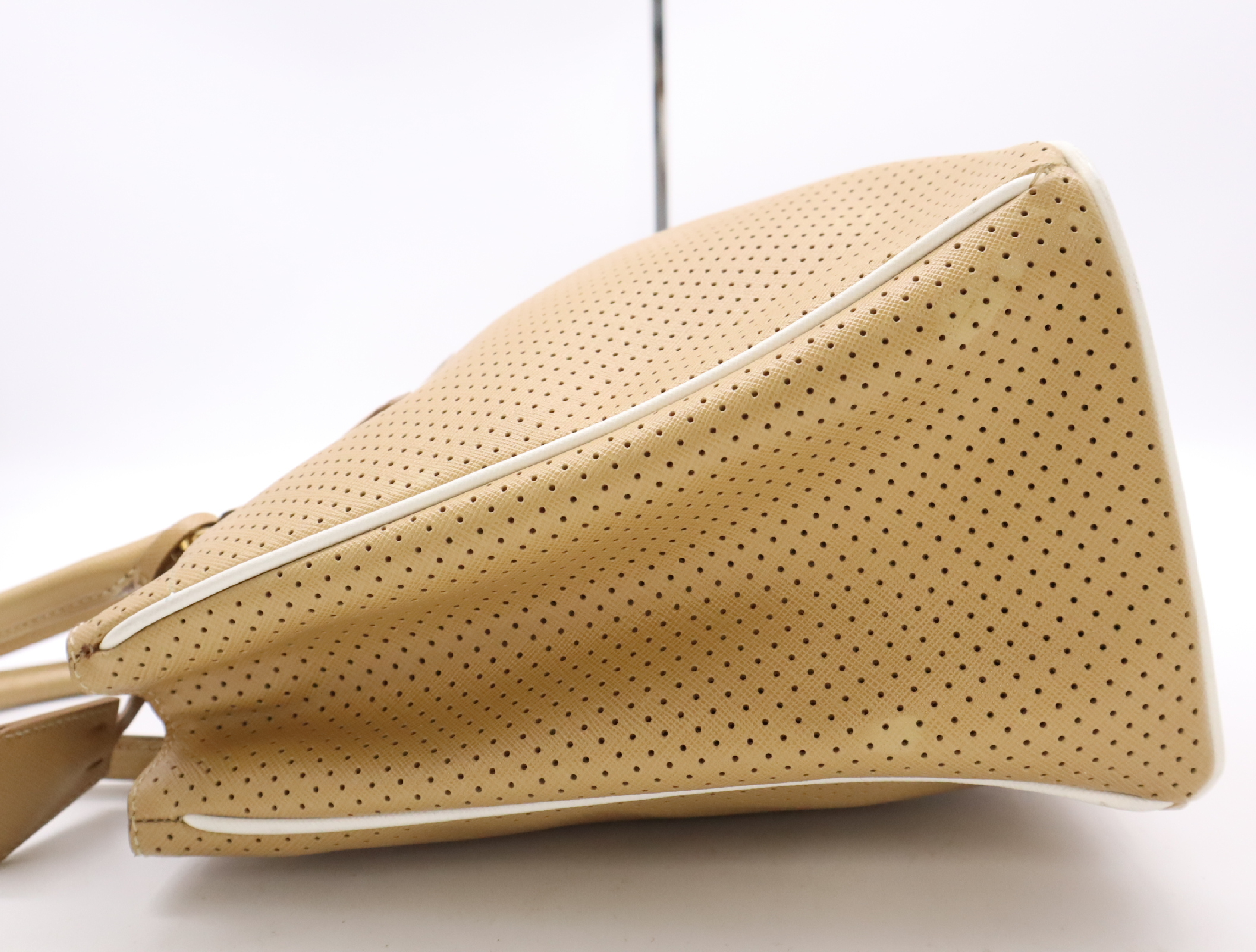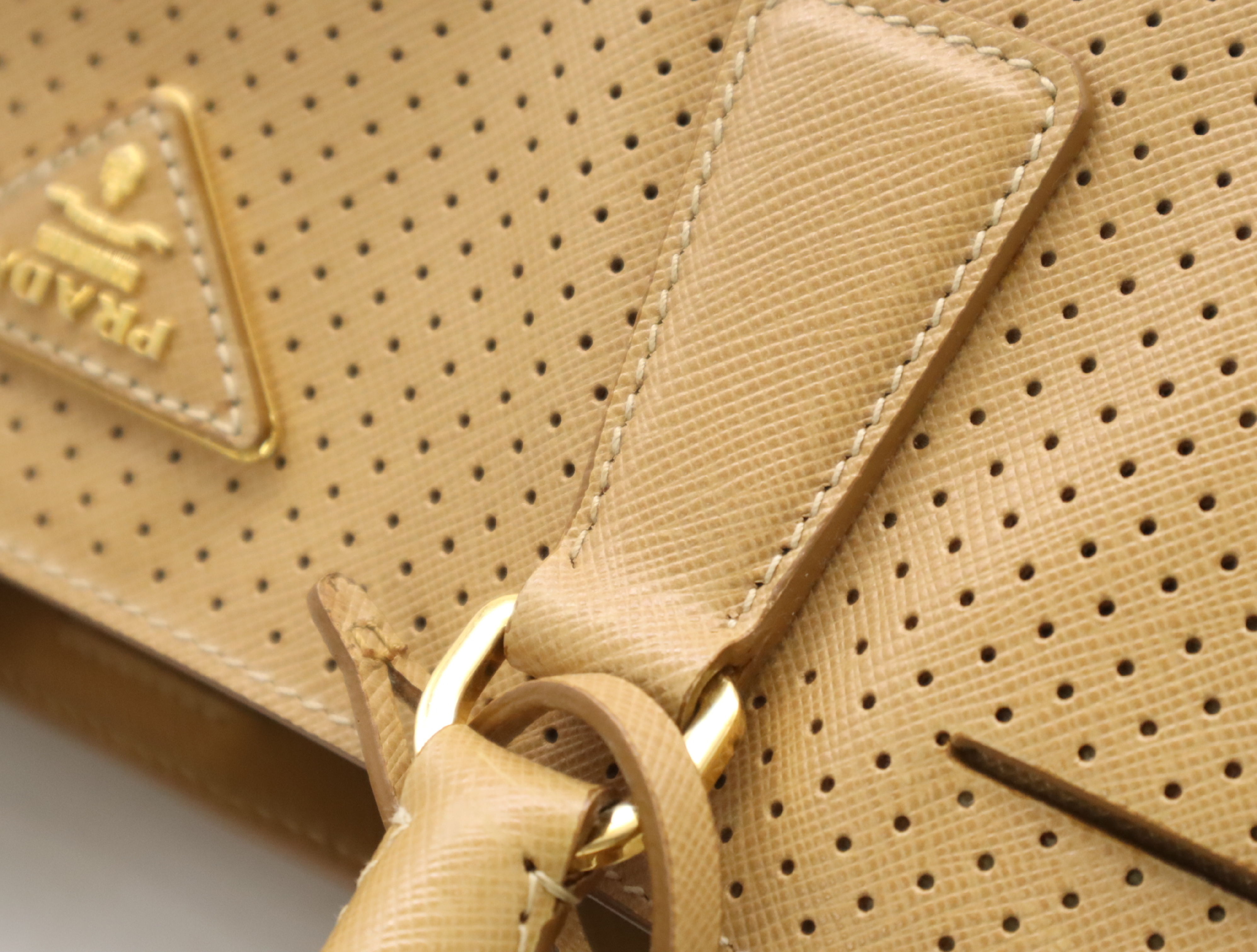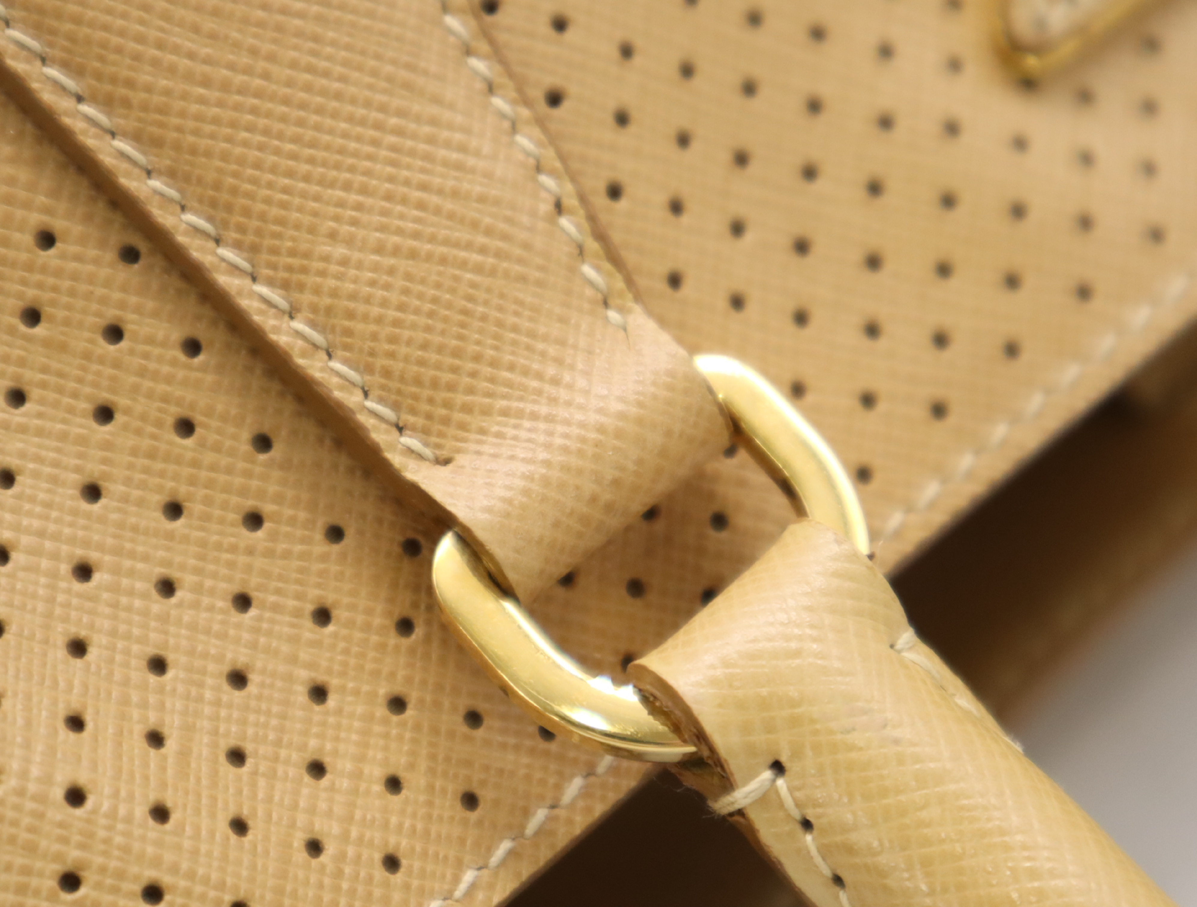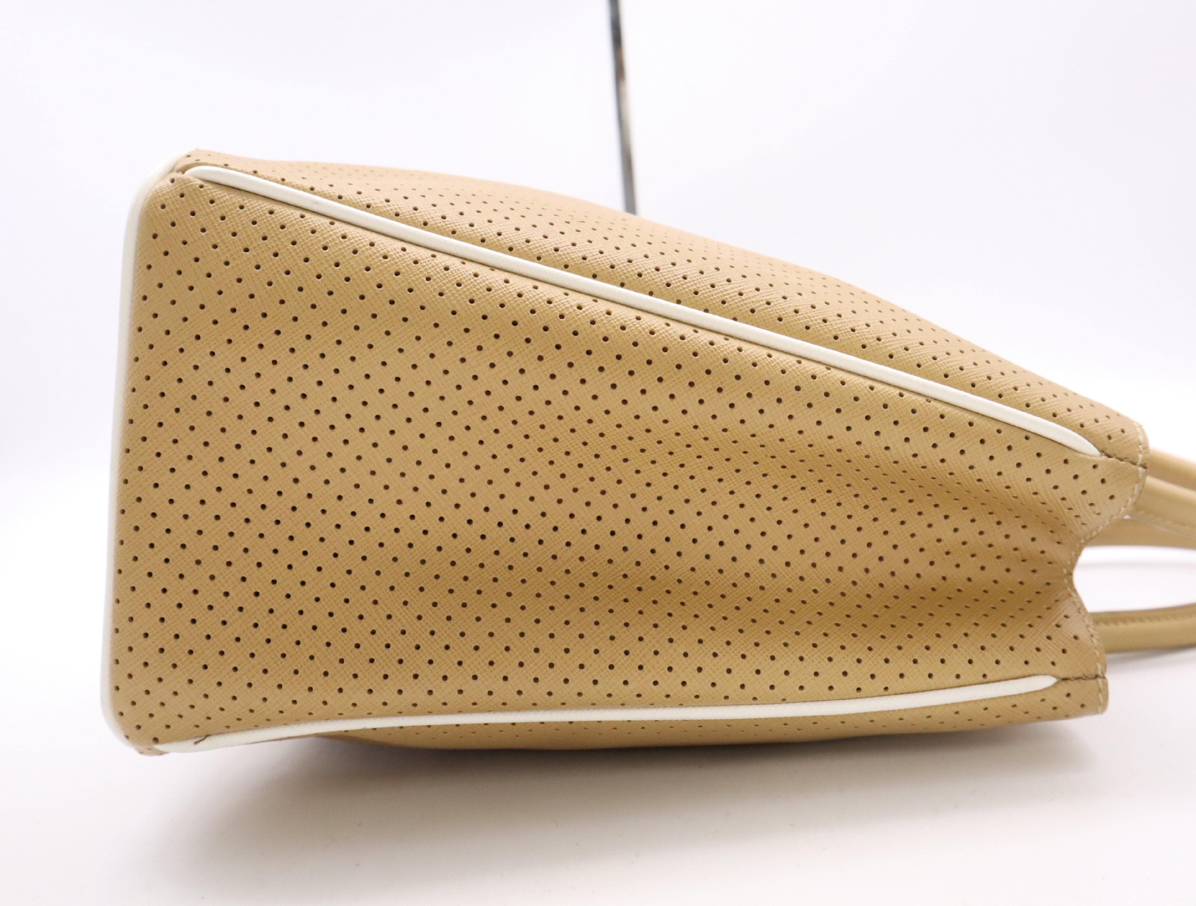 (F_0907)PRADA BN1875サフィアーノ パンチングレザー三角ロゴ ベージュ クロシェット・カード付 ハンドバッグ