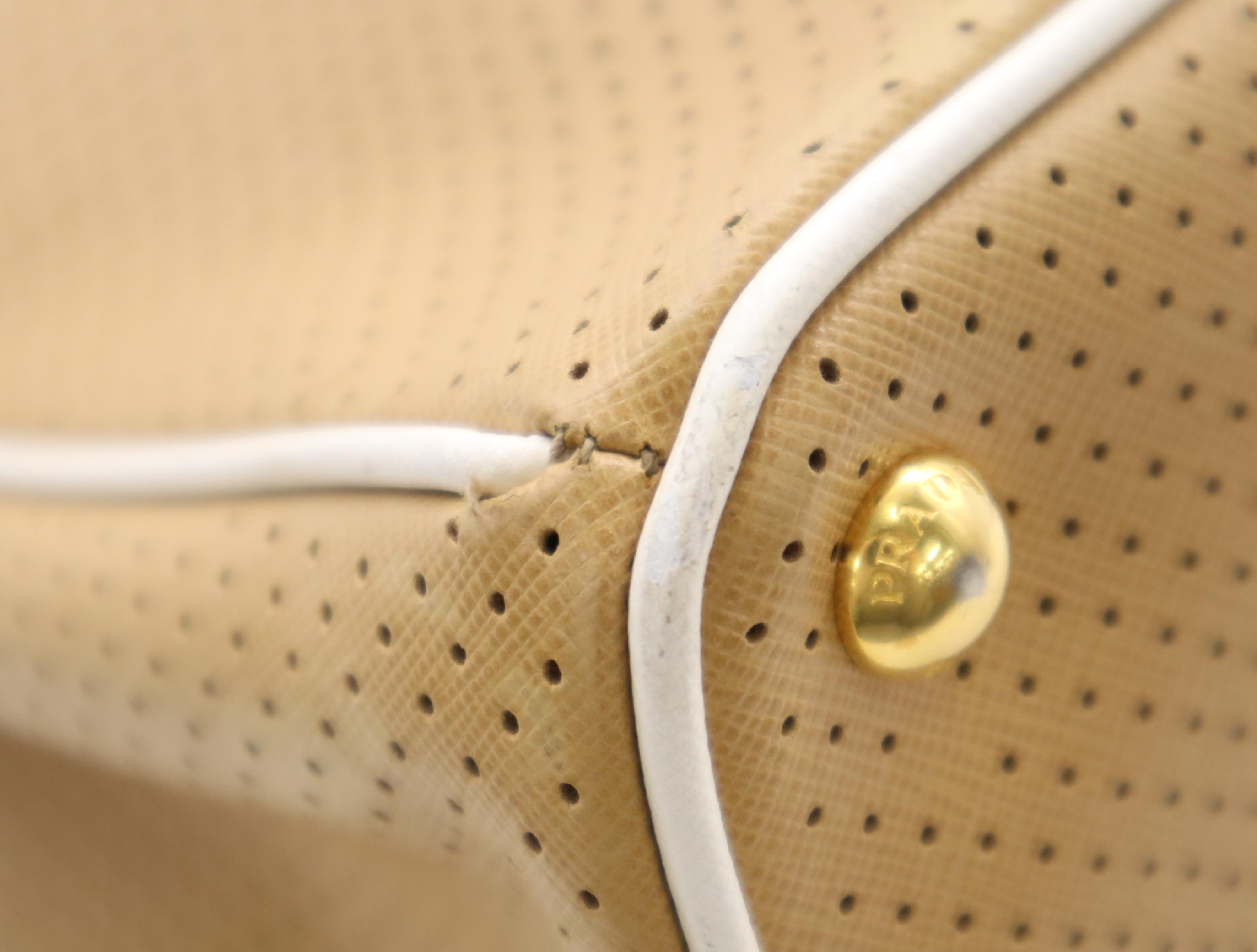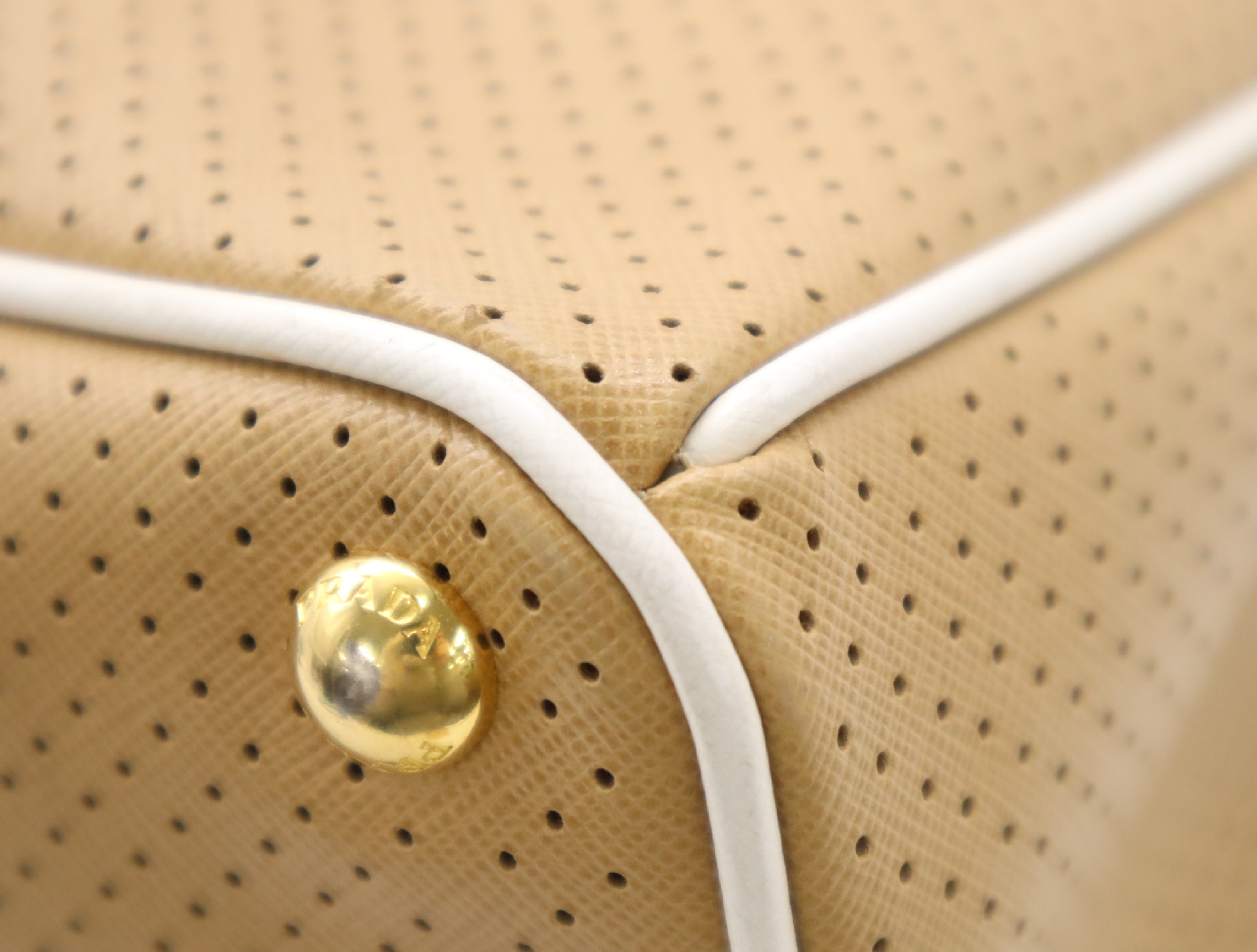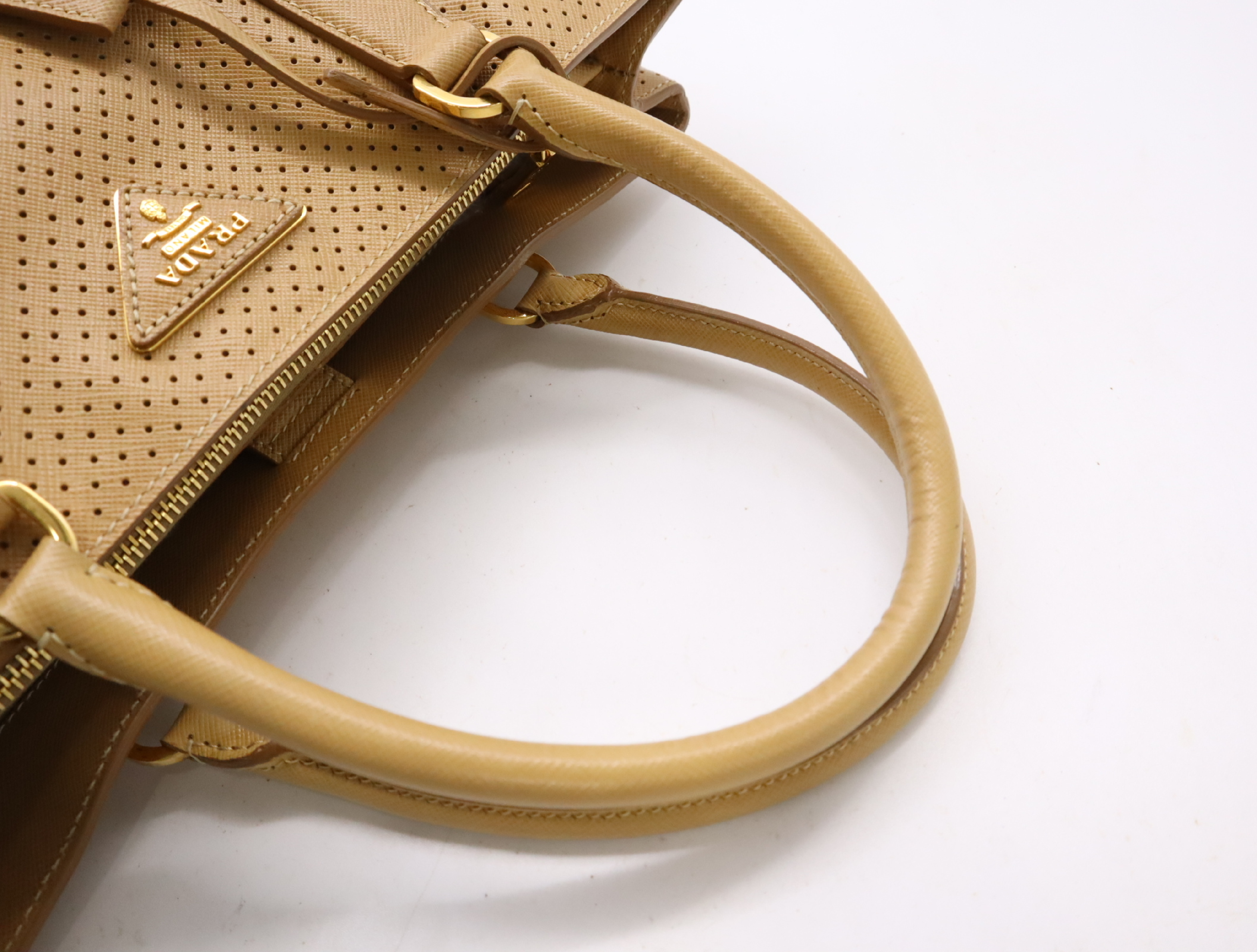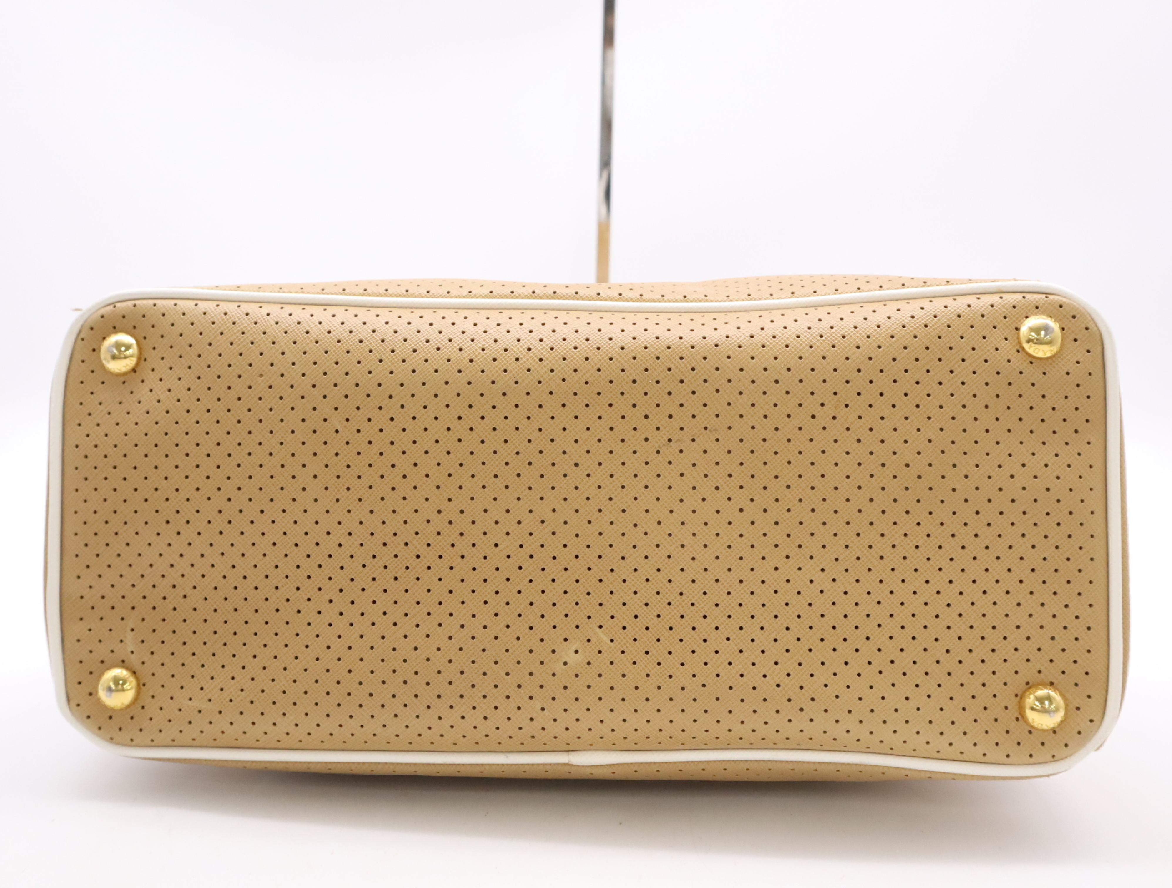 (F_0907)PRADA BN1875サフィアーノ パンチングレザー三角ロゴ ベージュ クロシェット・カード付 ハンドバッグ
