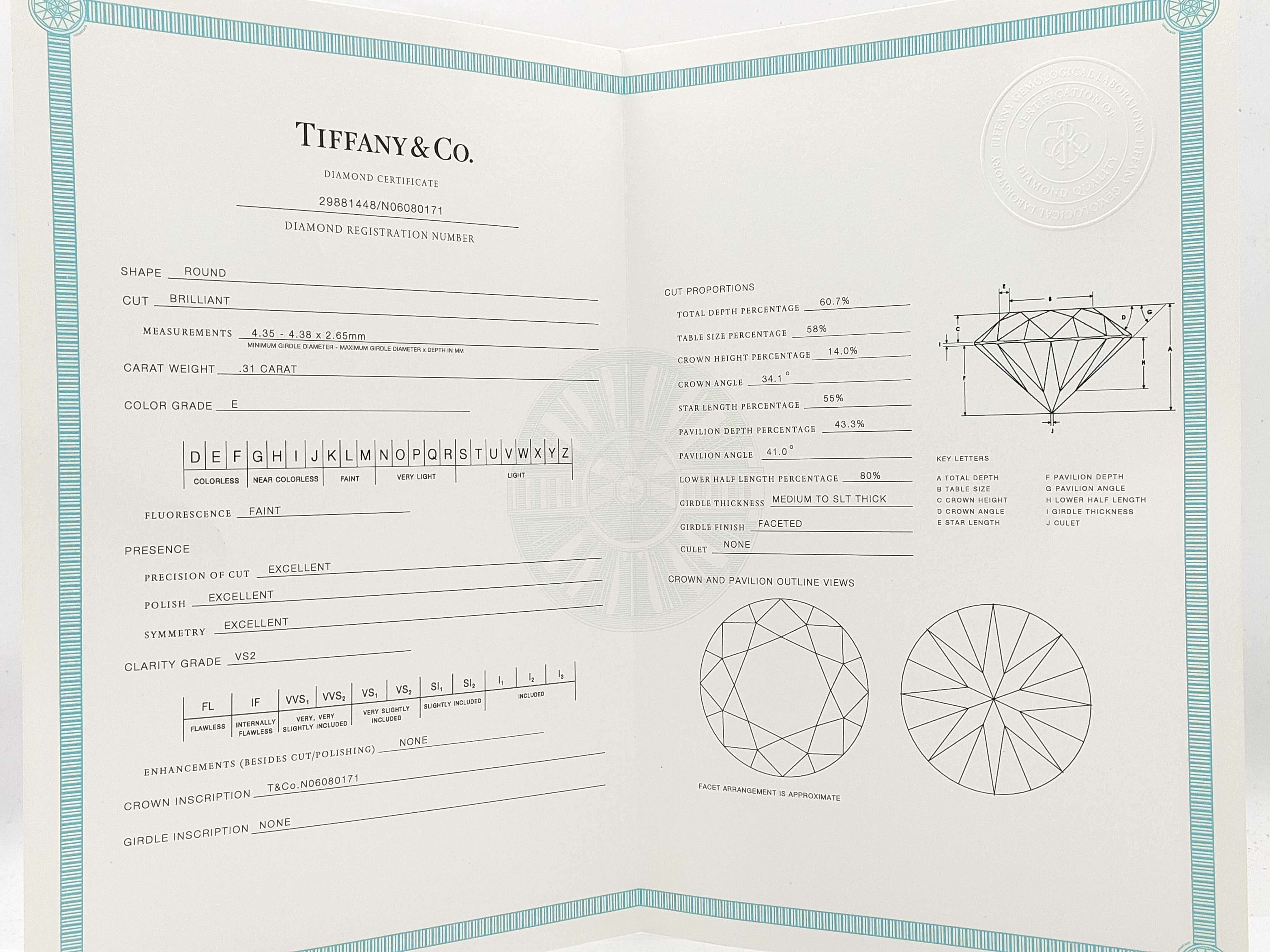 全体小傷あり. シリアル:29881448. ダイヤ評価=E-VS2-3EX-FAINT(Tiffany鑑参照). 【付属品