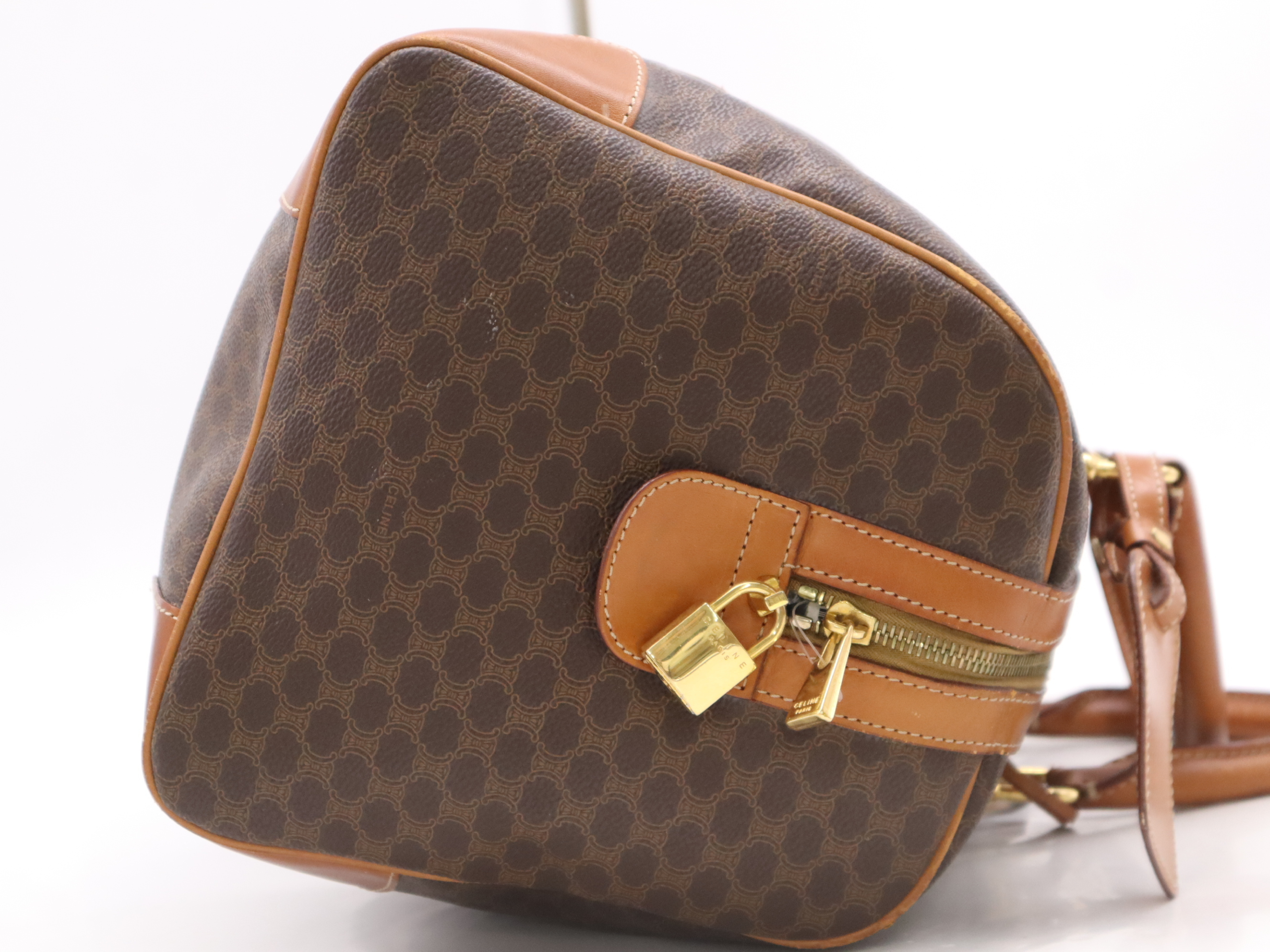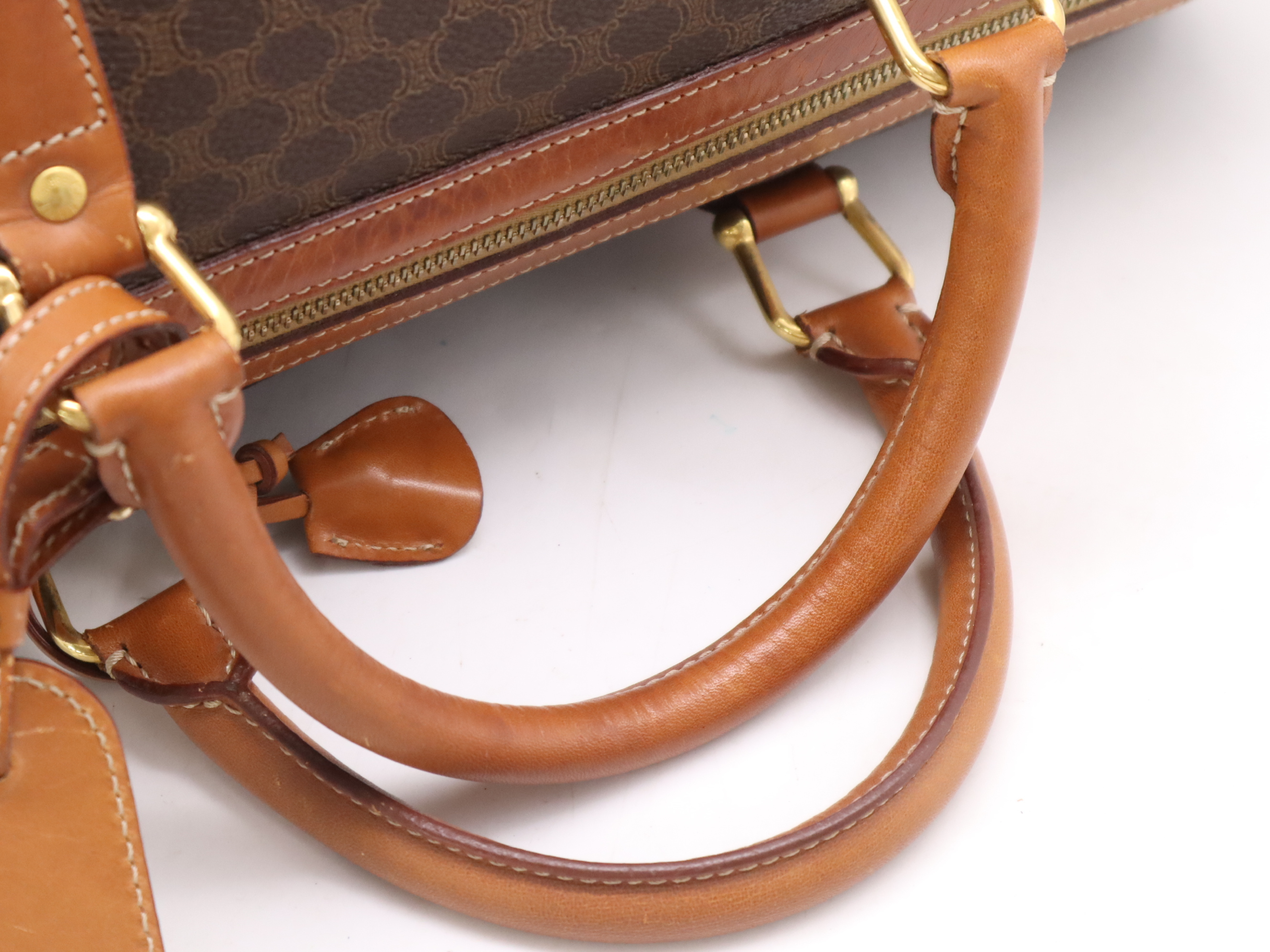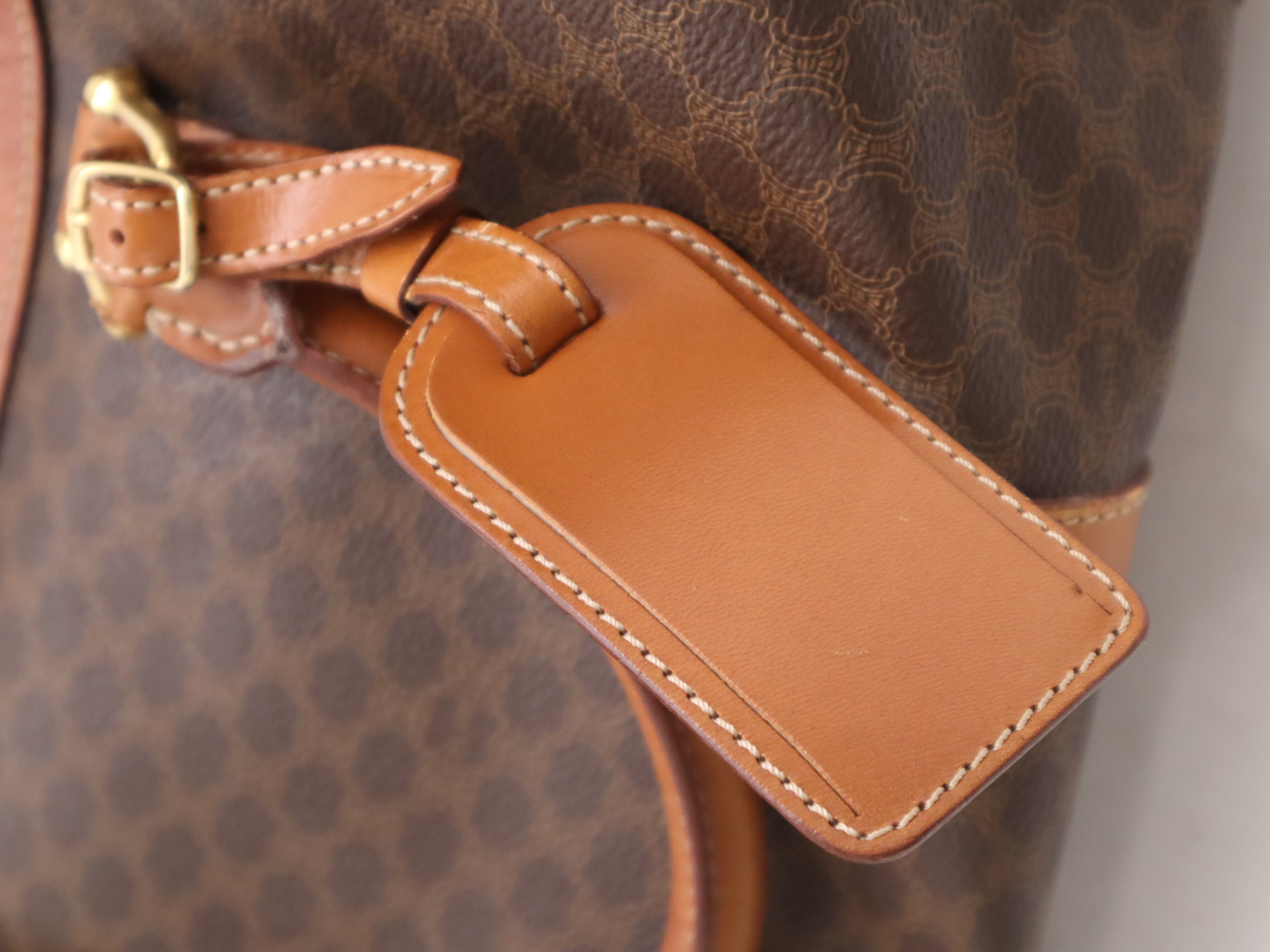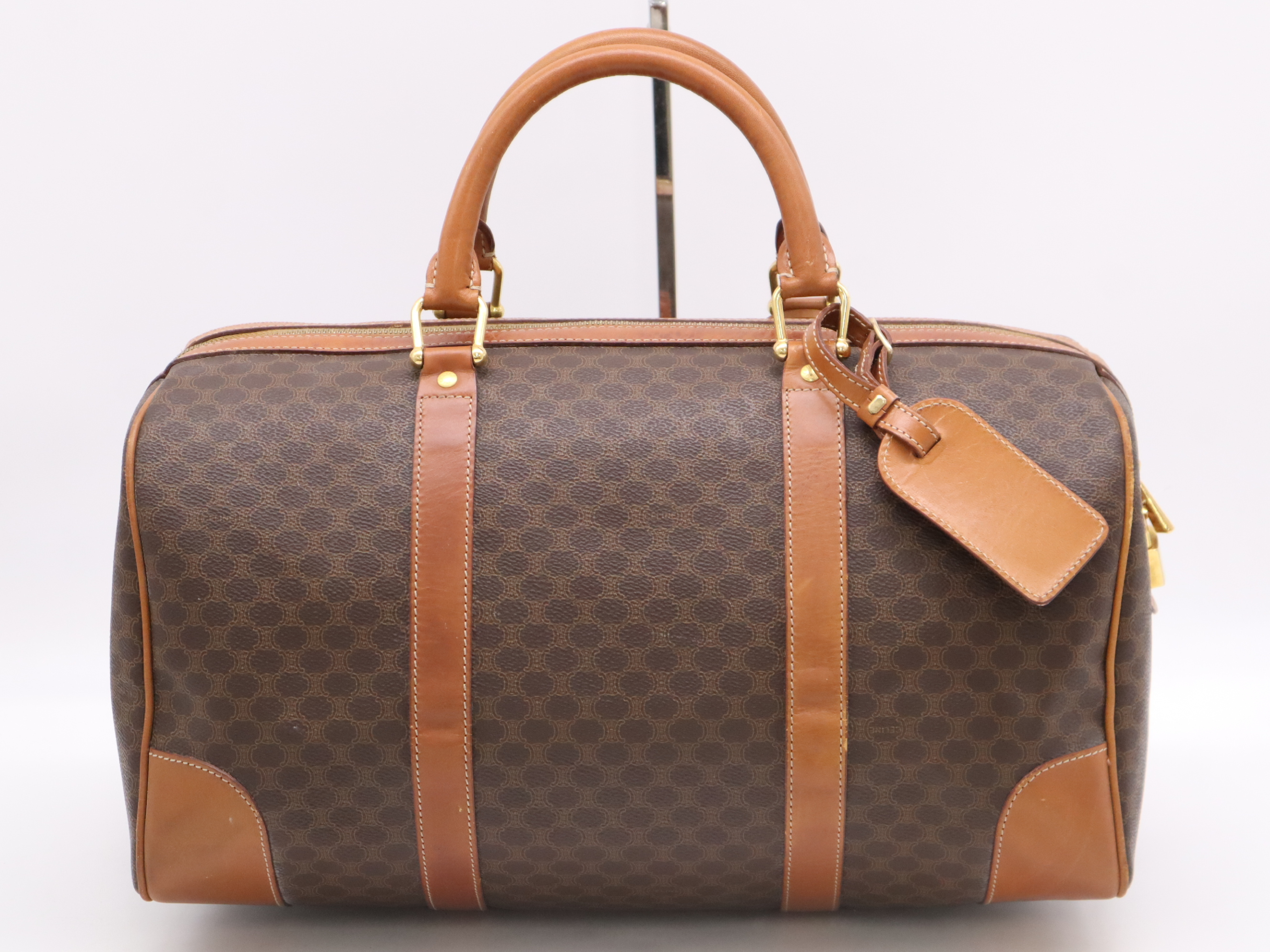 (10979_1586)CELINE PVC×レザーマカダム ボストンバッグ ブラウン カデナ・キー・ネームタグ・クロシェット付 ボストンバッグ