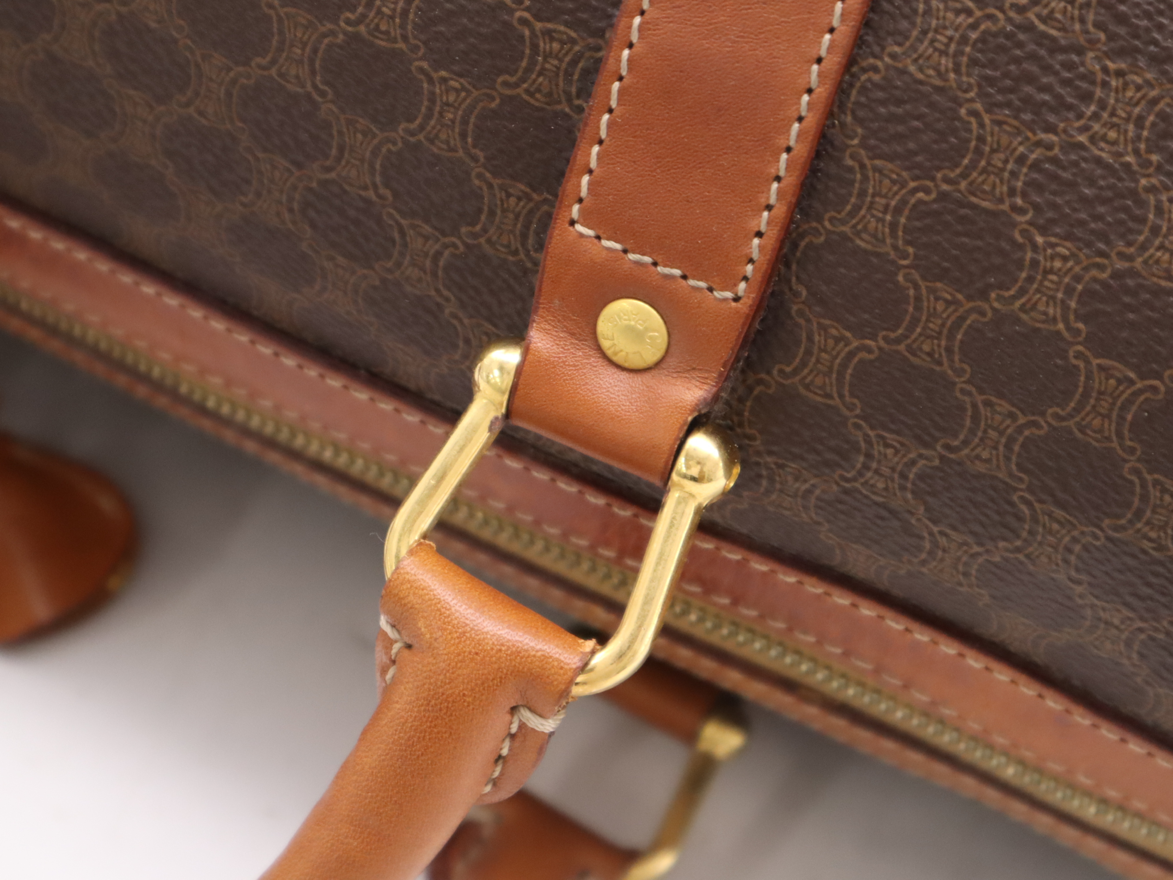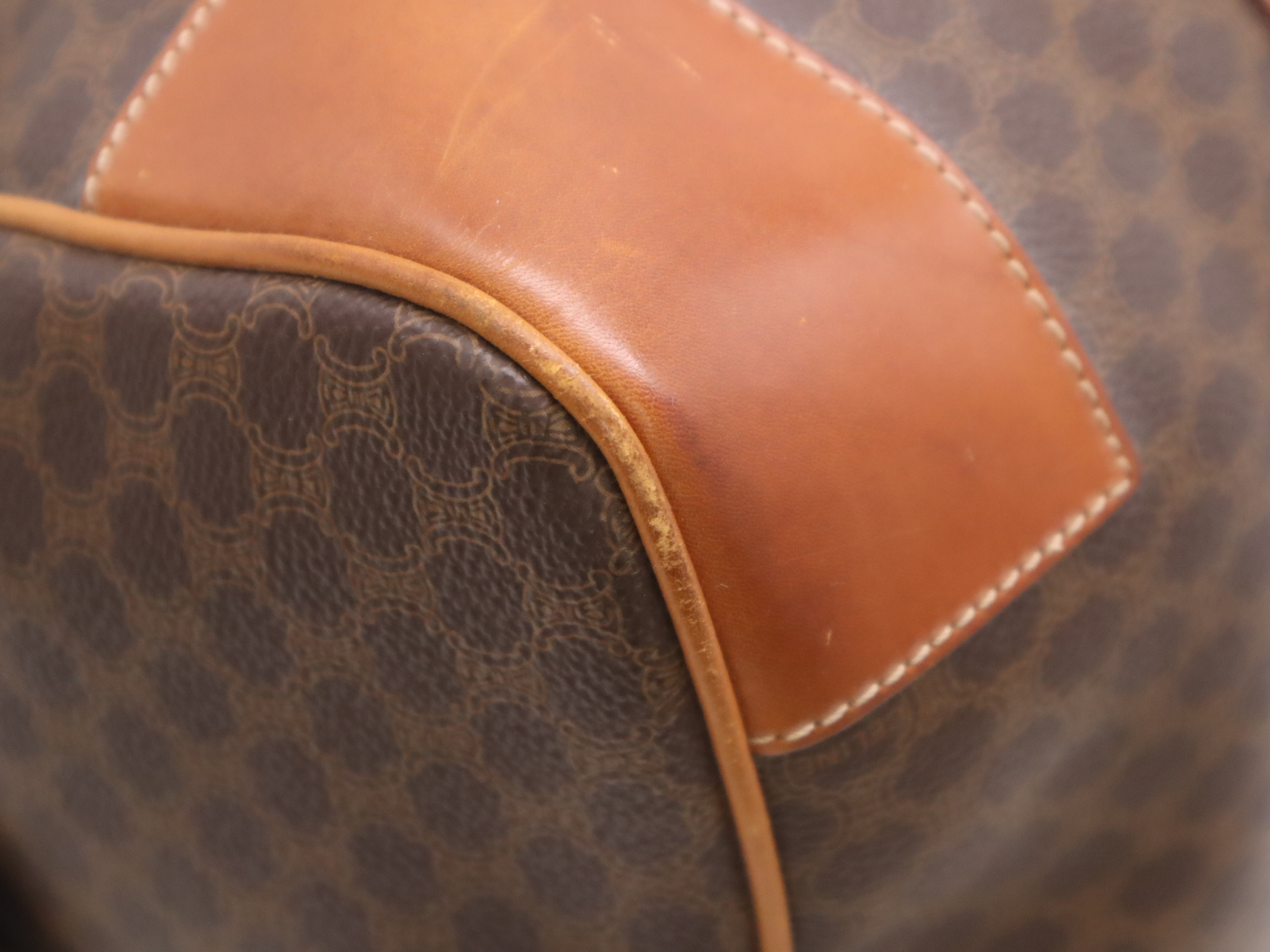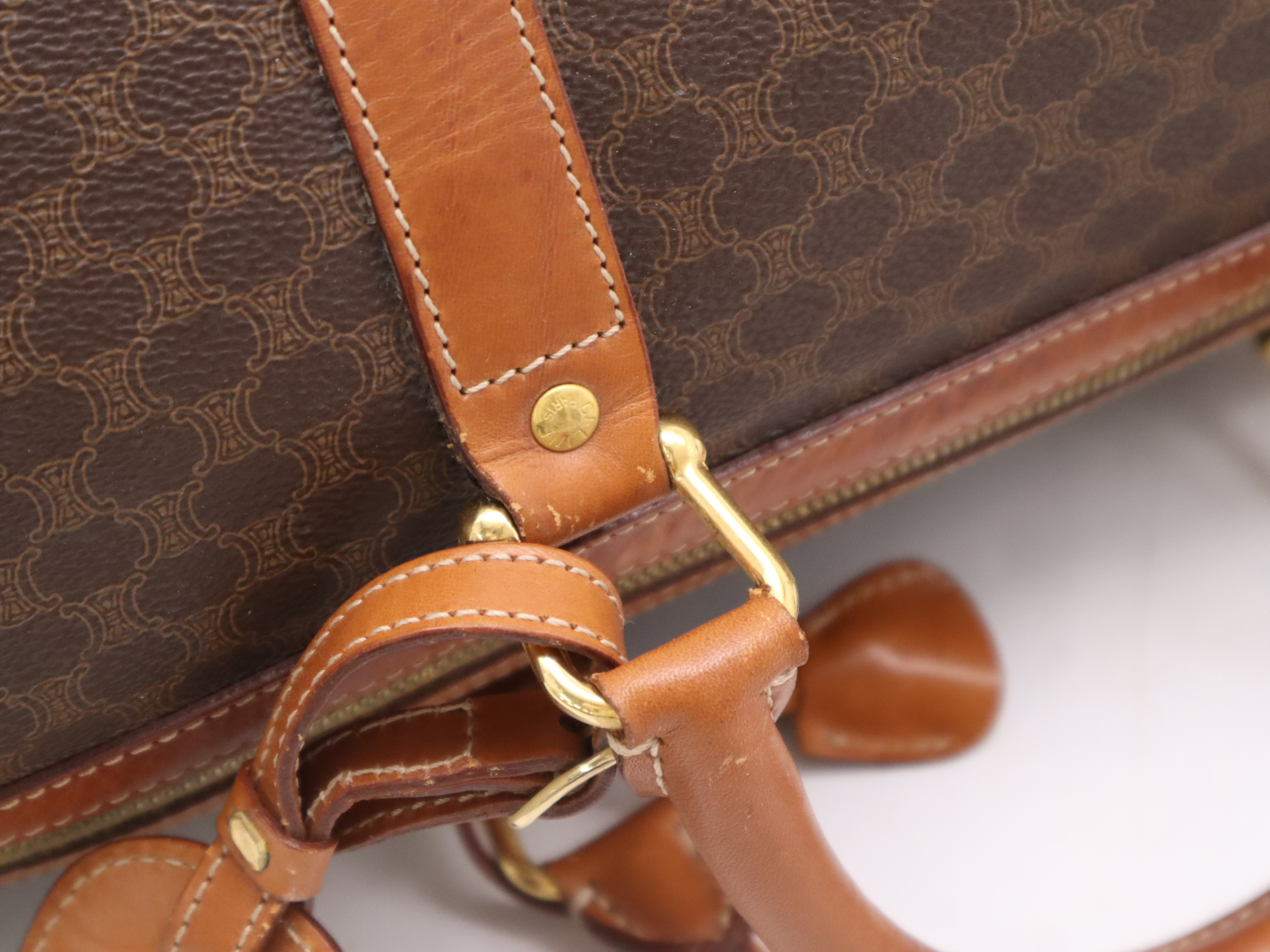 (10979_1586)CELINE PVC×レザーマカダム ボストンバッグ ブラウン カデナ・キー・ネームタグ・クロシェット付 ボストンバッグ
