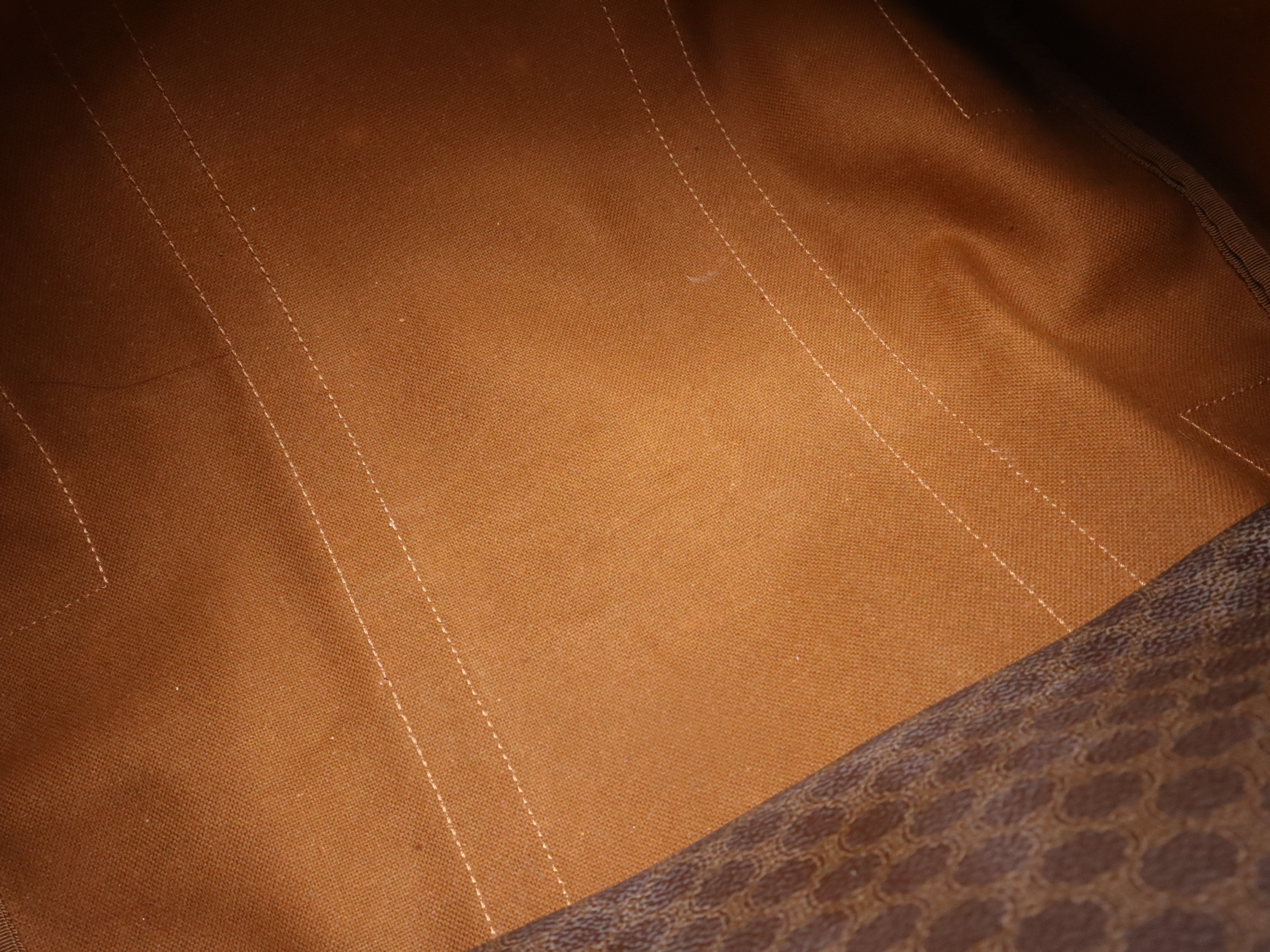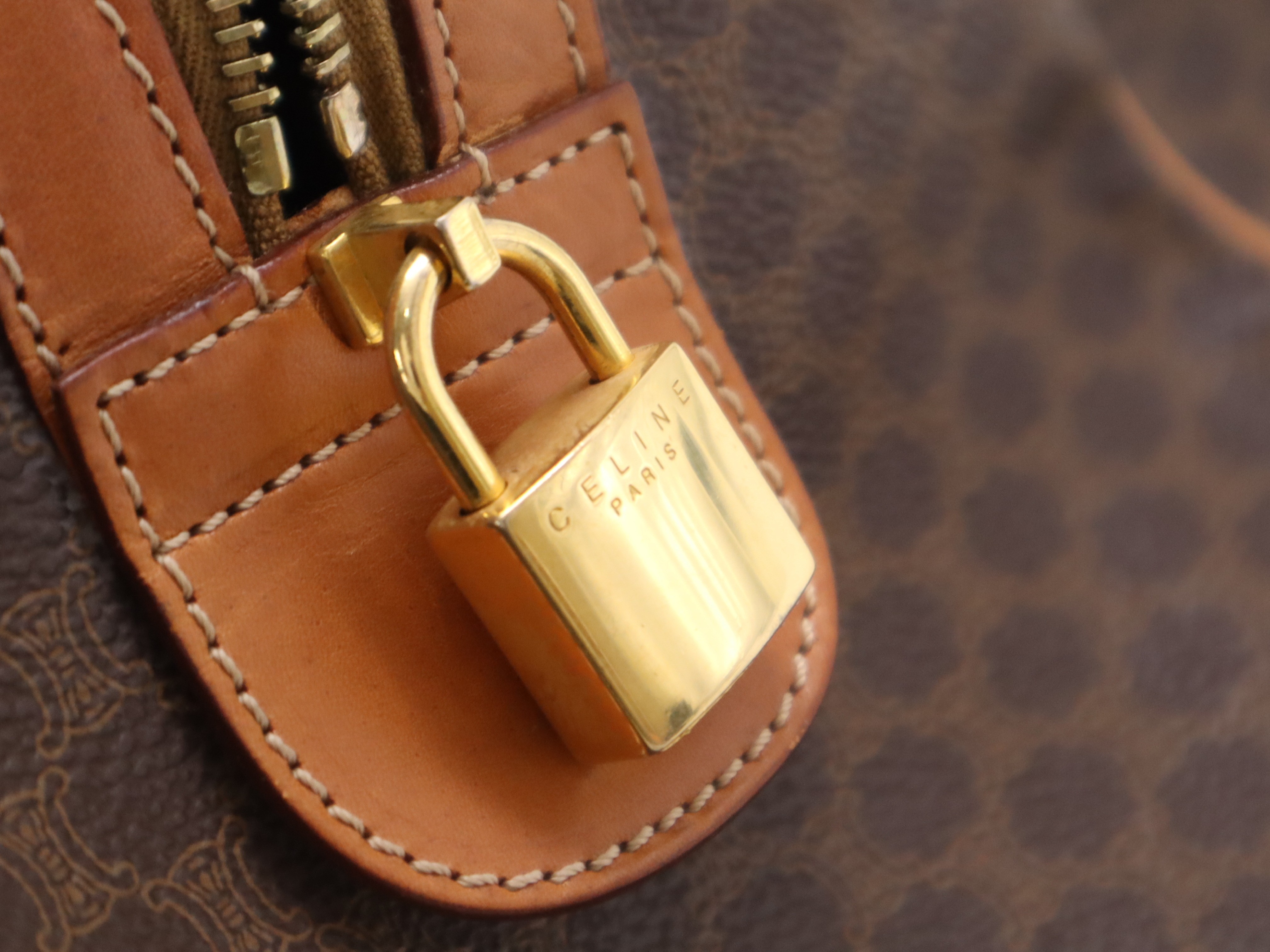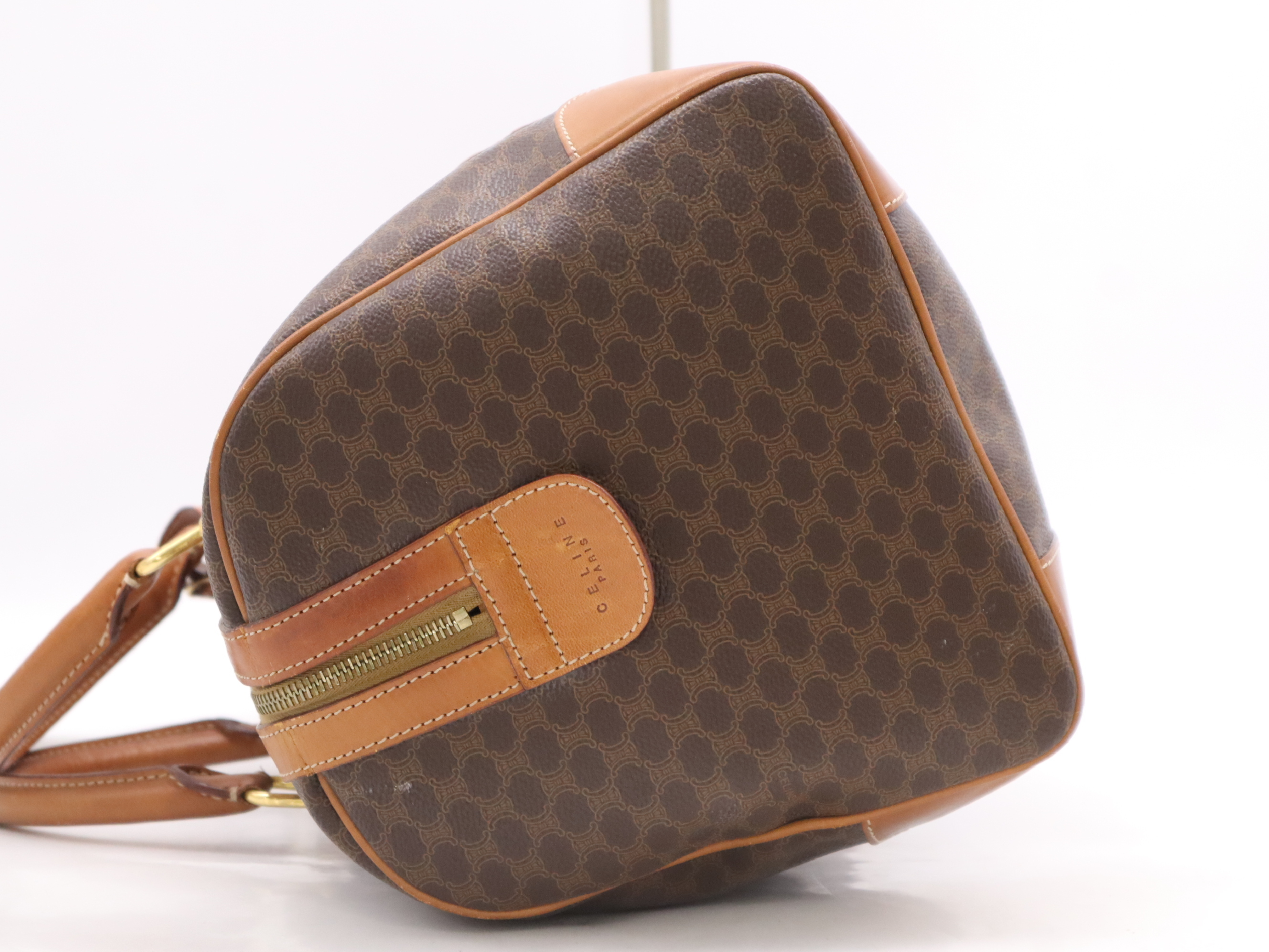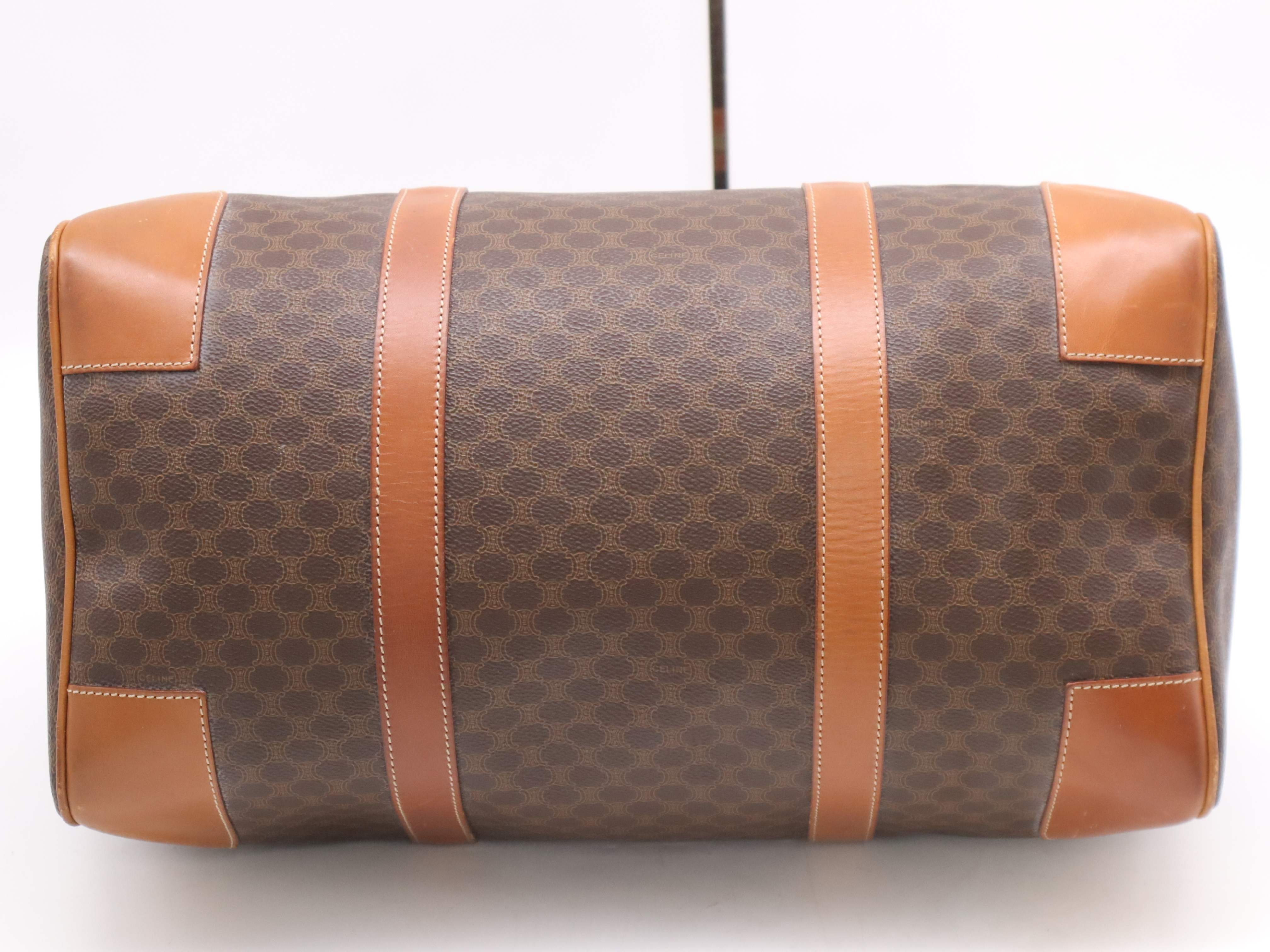 (10979_1586)CELINE PVC×レザーマカダム ボストンバッグ ブラウン カデナ・キー・ネームタグ・クロシェット付 ボストンバッグ