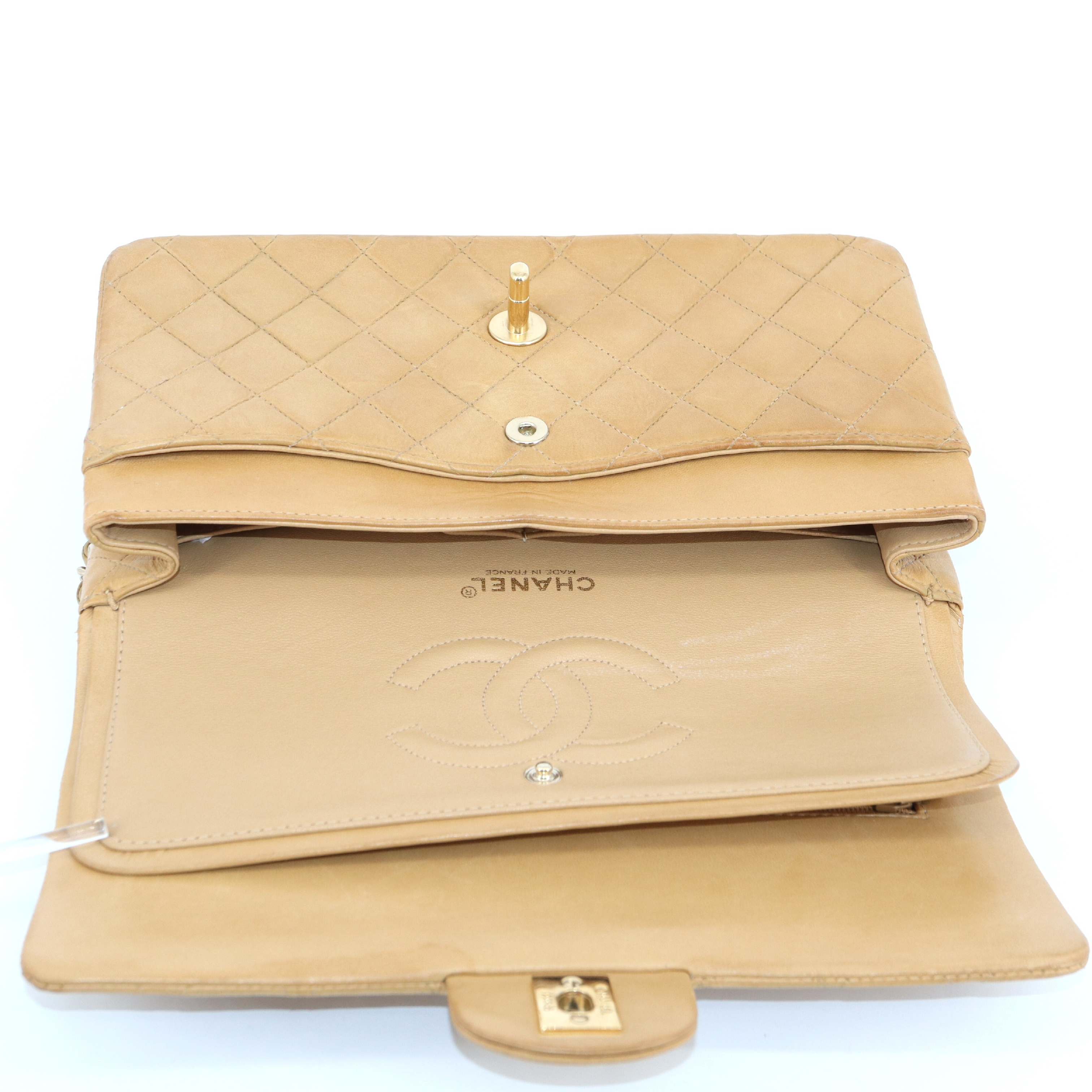 型崩れ(中) 補色有 全体ヤケ擦れ汚れ傷(中) 角擦れ(中) 金具擦れ傷(中) ショルダー擦れ汚れ(中) フラップ裏傷(中) 内側フラップ傷押し跡(中) 間口ヨレシワ(中) フラップ裏汚れ(中) 【シールカード有