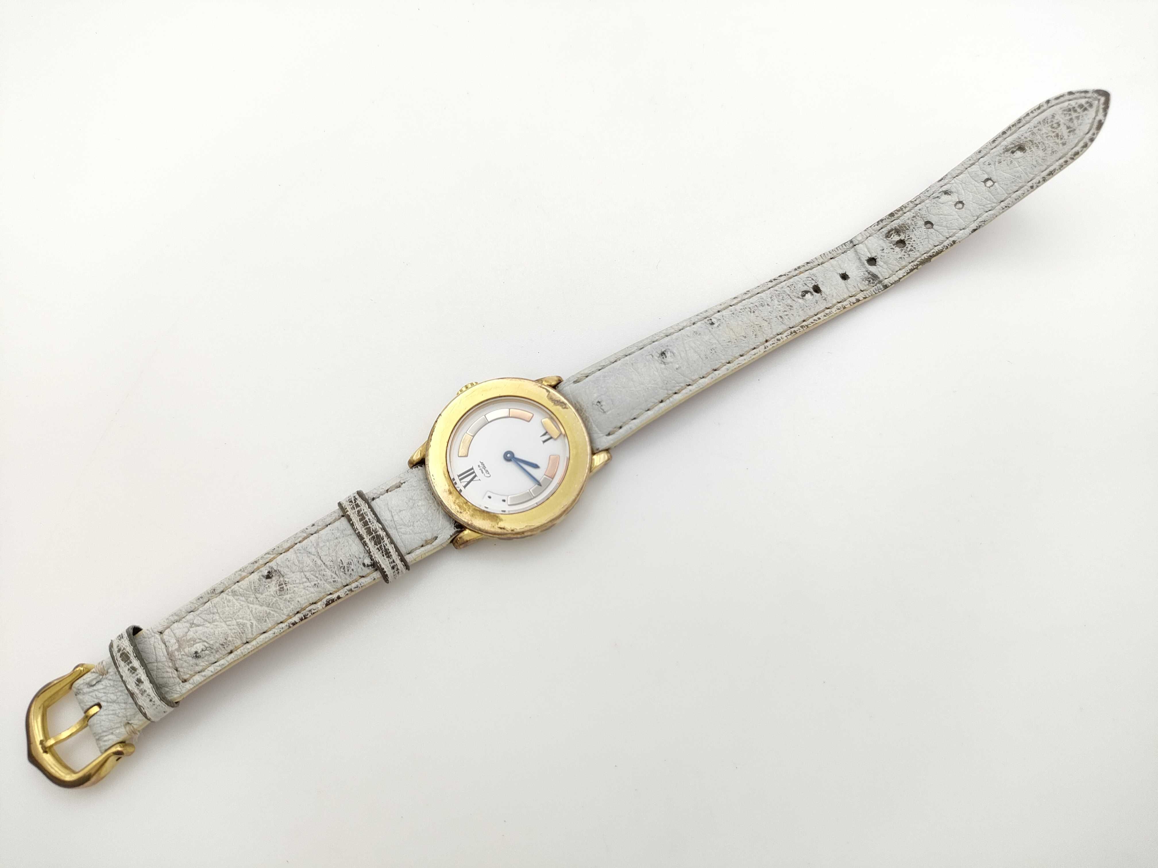 全体傷小 ガラス小傷あり 文字盤一部パーツ取れ ケース打痕傷小 リューズ石欠け傷中 ベルト劣化大・ロゴ確認できず 替えベルト付き(劣化中) ギャラあり(Refシリアル未記入)【付属品