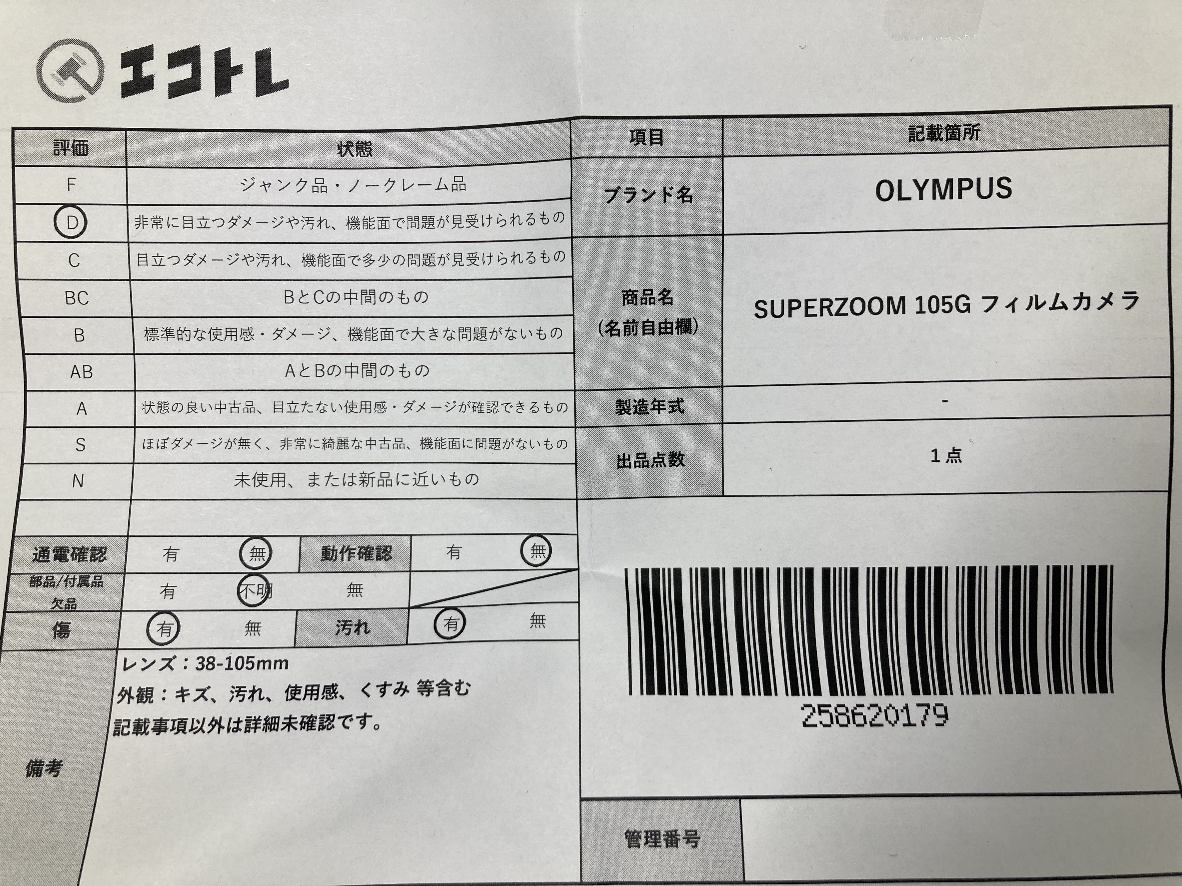 ▼SHIPPING TO JPN ONLY▼ OLYMPUS SUPERZOOM 105G フィルムカメラ","タイプライン":"","カテゴリ":"カメラ","形状コード":"カメラ","付属品コード":"","シリアル・シール・型番":""