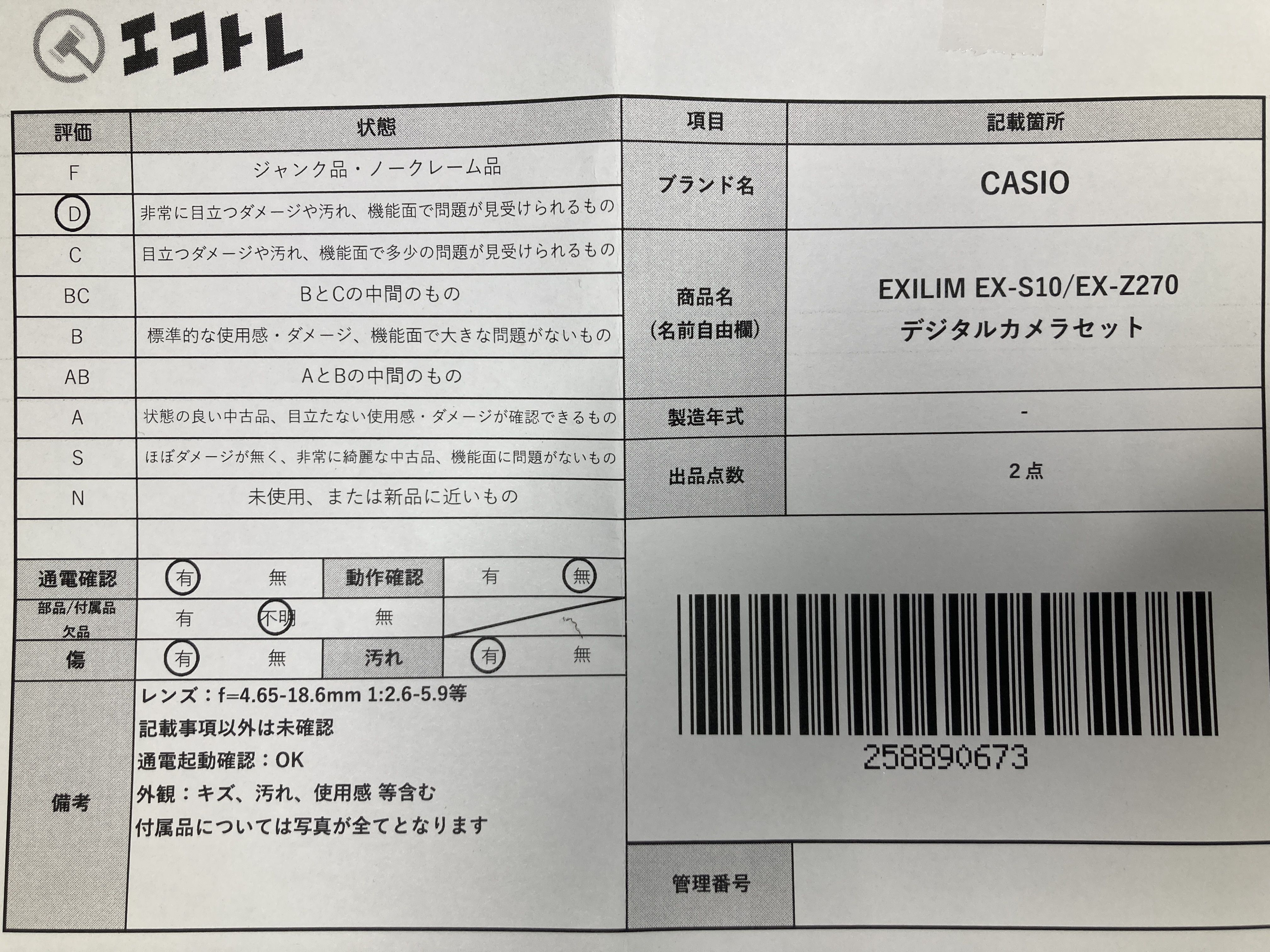 ▼SHIPPING TO JPN ONLY▼ CASIO EXILIM EX-S10/EX-Z270 デジタルカメラセット","タイプライン":"","カテゴリ":"カメラ","形状コード":"カメラ","付属品コード":"","シリアル・シール・型番":""