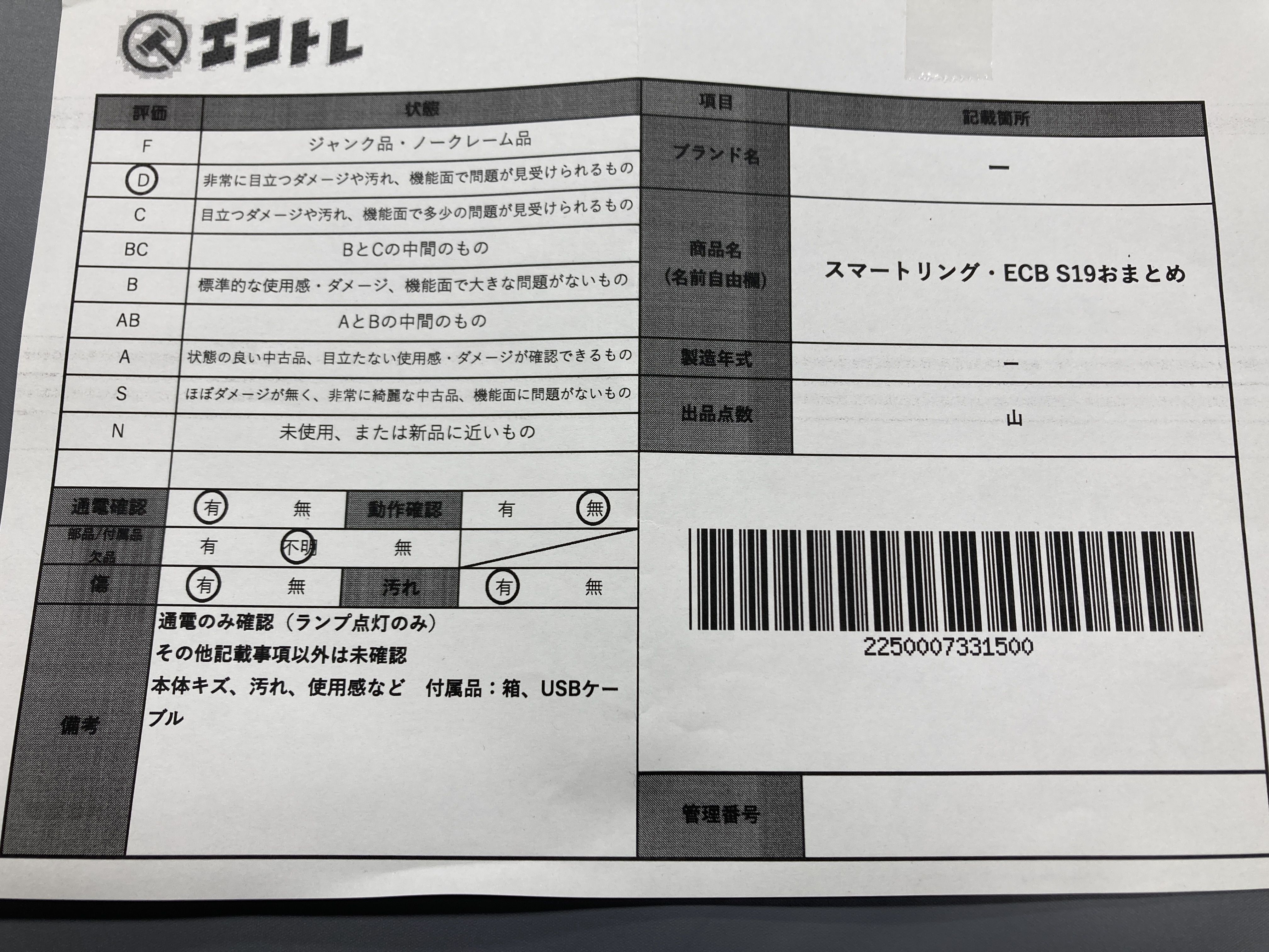 ▼SHIPPING TO JPN ONLY▼ スマートリング・ECB S19 4点まとめ","タイプライン":"","カテゴリ":"家電","形状コード":"その他家電","付属品コード":"","シリアル・シール・型番":""