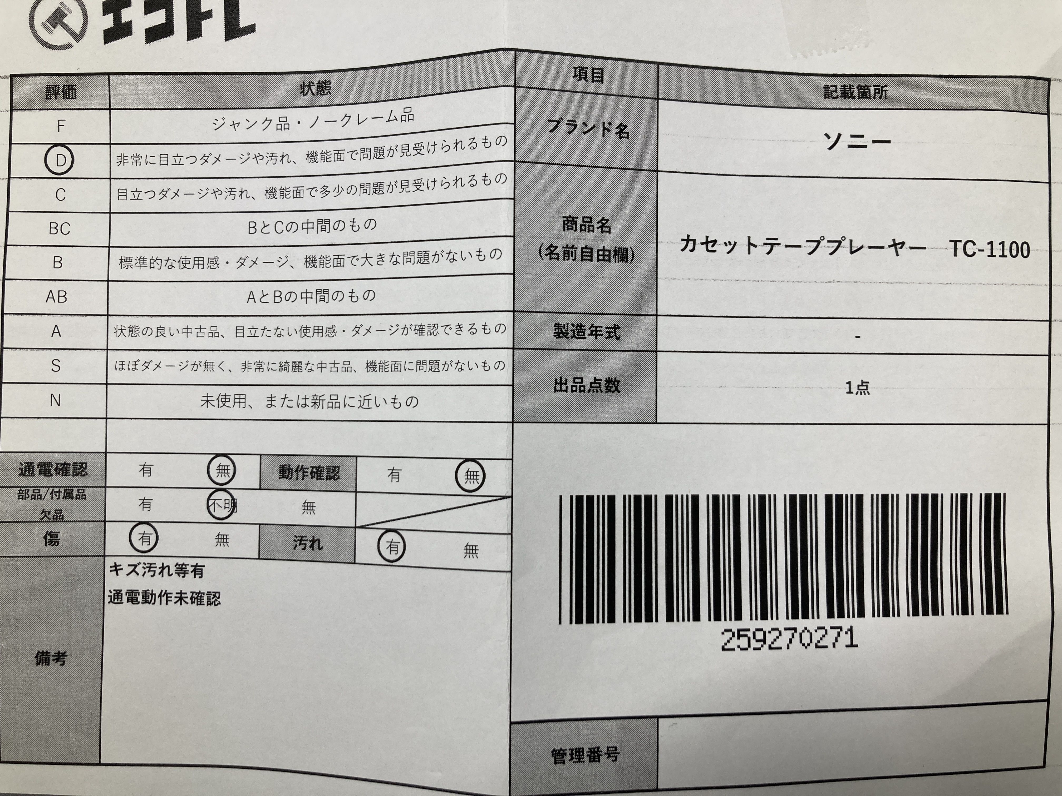 ▼SHIPPING TO JPN ONLY▼ ソニー SONY カセットテーフ゜フ゜レーヤー TC-1100","タイプライン":"","カテゴリ":"家電","形状コード":"その他家電","付属品コード":"","シリアル・シール・型番":""