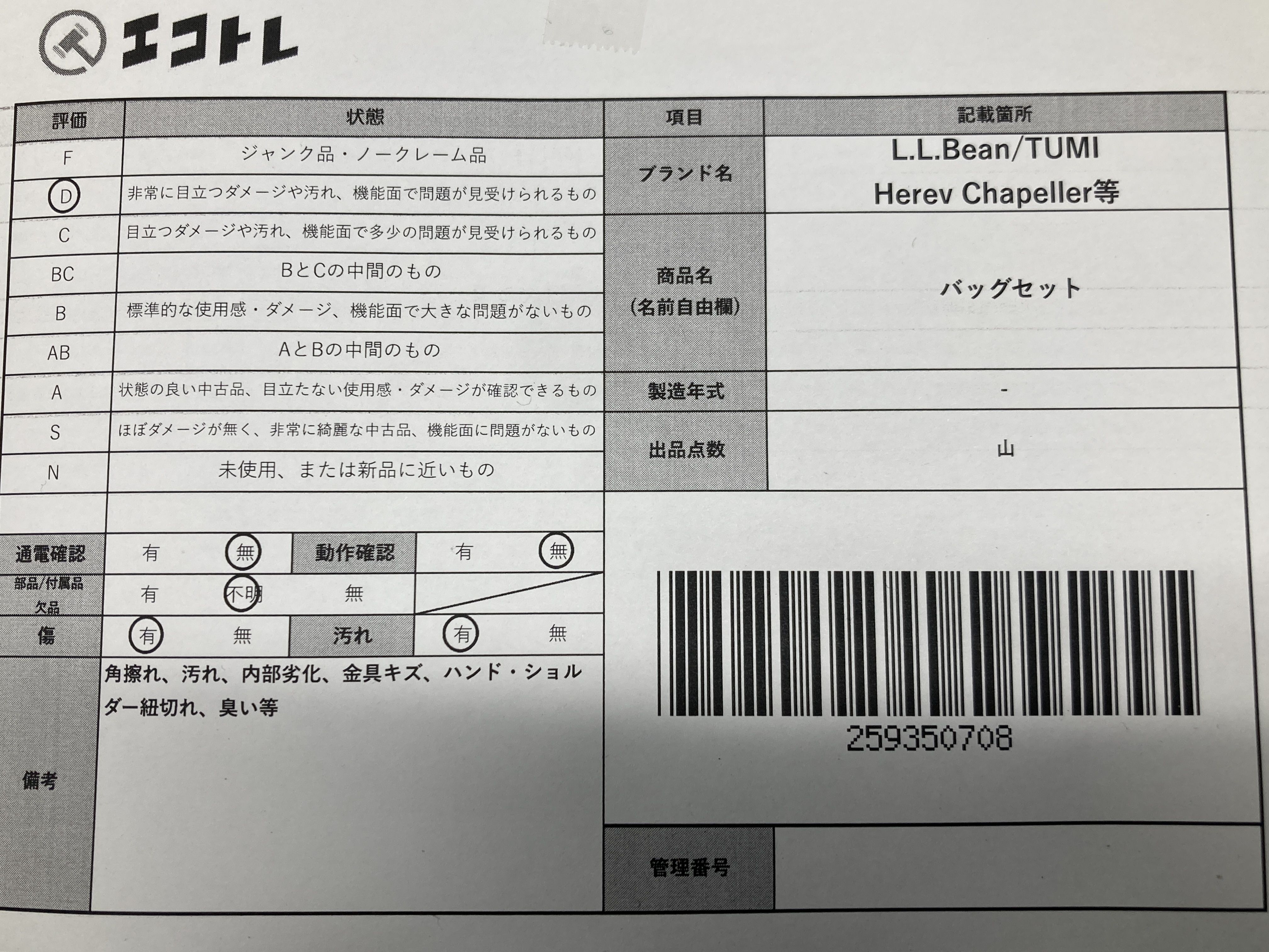 ▼SHIPPING TO JPN ONLY▼ L.L.Bean/TUMI/Herev Chapeller等 バッグセット","タイプライン":"","カテゴリ":"バッグ","形状コード":"バッグ","付属品コード":"","シリアル・シール・型番":""