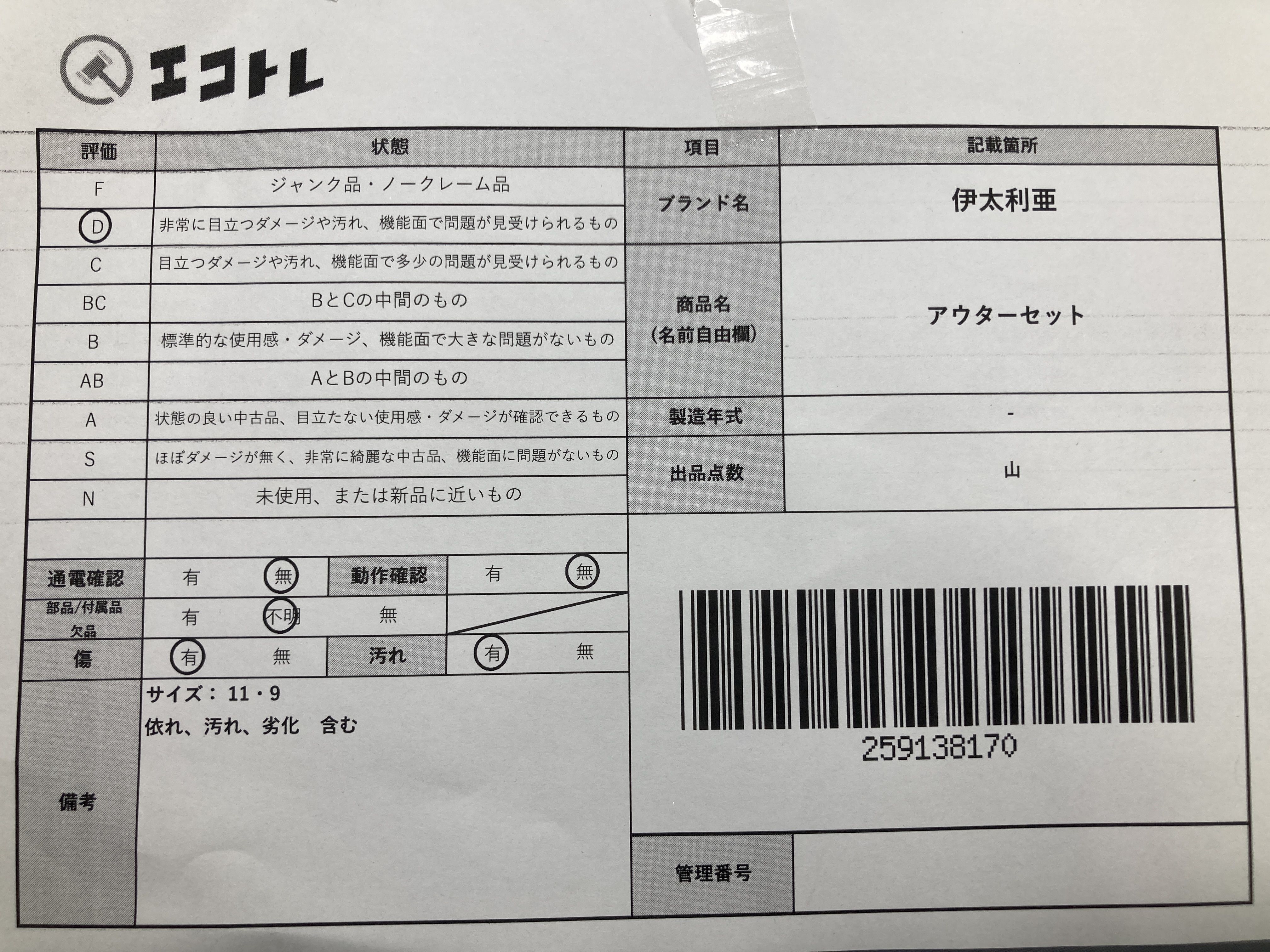 ▼SHIPPING TO JPN ONLY▼ 伊太利亜 アウターセット","タイプライン":"","カテゴリ":"アパレル","形状コード":"その他アパレル","付属品コード":"","シリアル・シール・型番":""