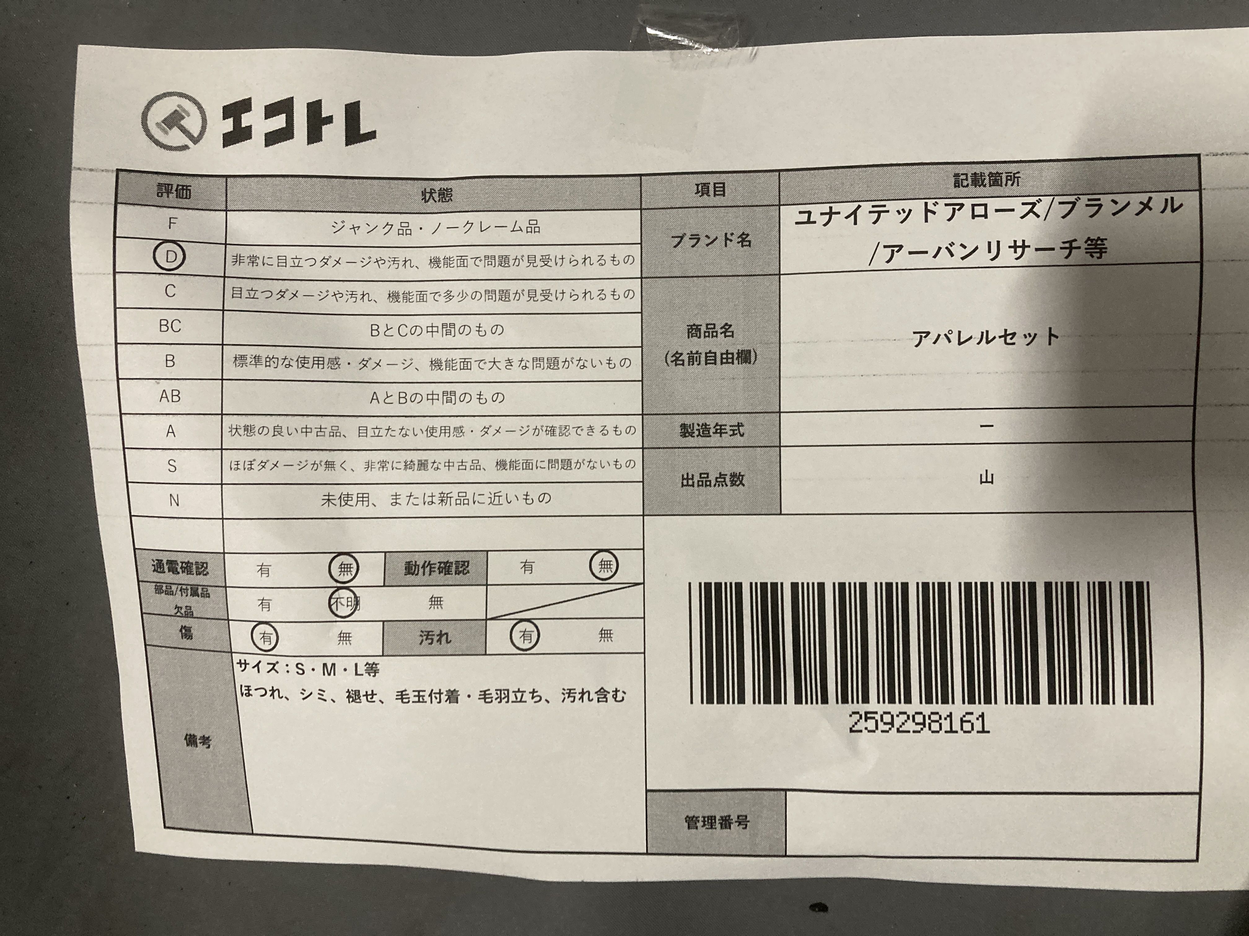 ▼SHIPPING TO JPN ONLY▼ ユナイテッドアローズ/ブランメル/アーバンリサーチ等 アパレルセット","タイプライン":"","カテゴリ":"アパレル","形状コード":"その他アパレル","付属品コード":"","シリアル・シール・型番":""