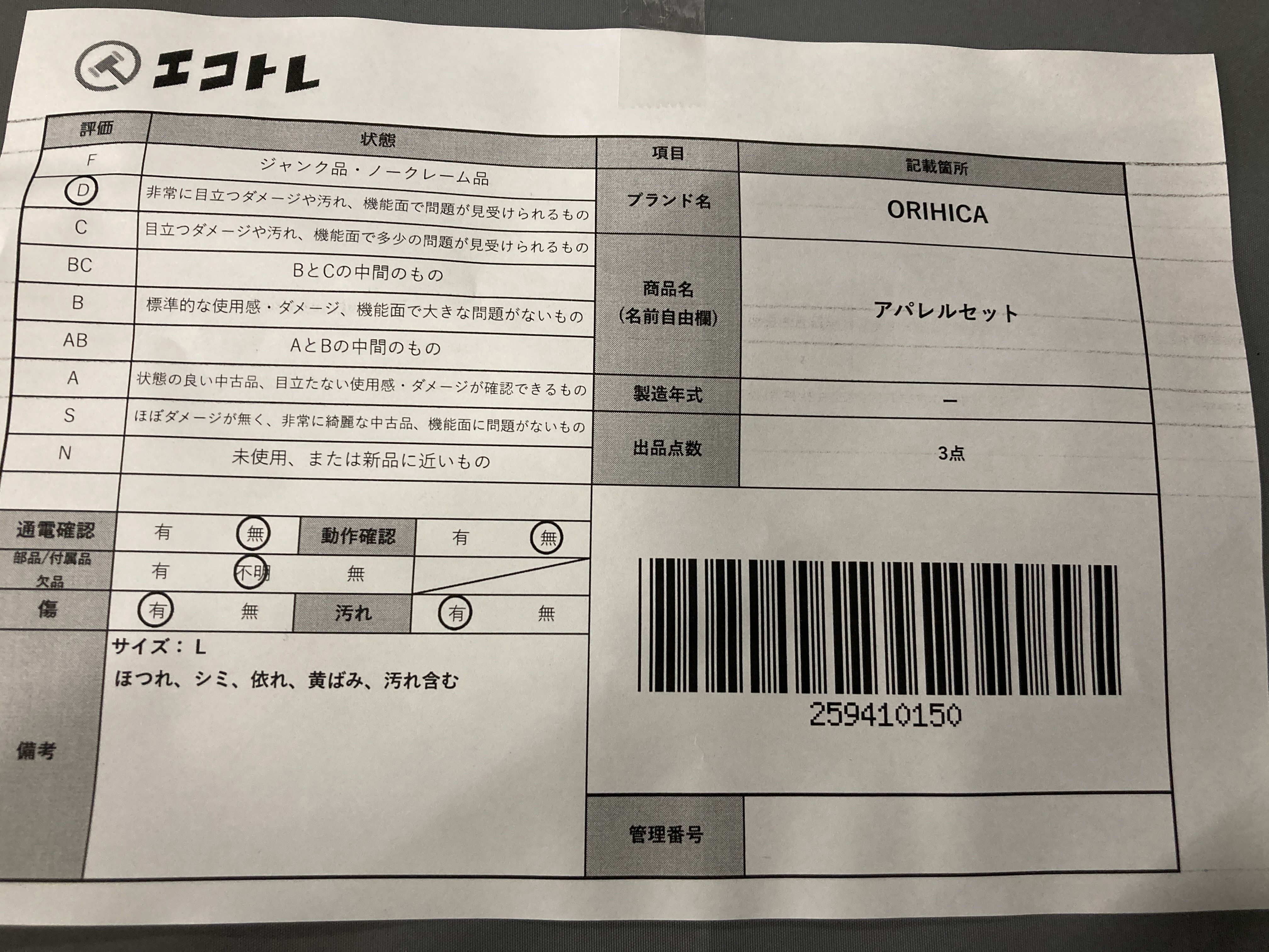 ▼SHIPPING TO JPN ONLY▼ ORIHICA アパレルセット","タイプライン":"","カテゴリ":"アパレル","形状コード":"その他アパレル","付属品コード":"","シリアル・シール・型番":""