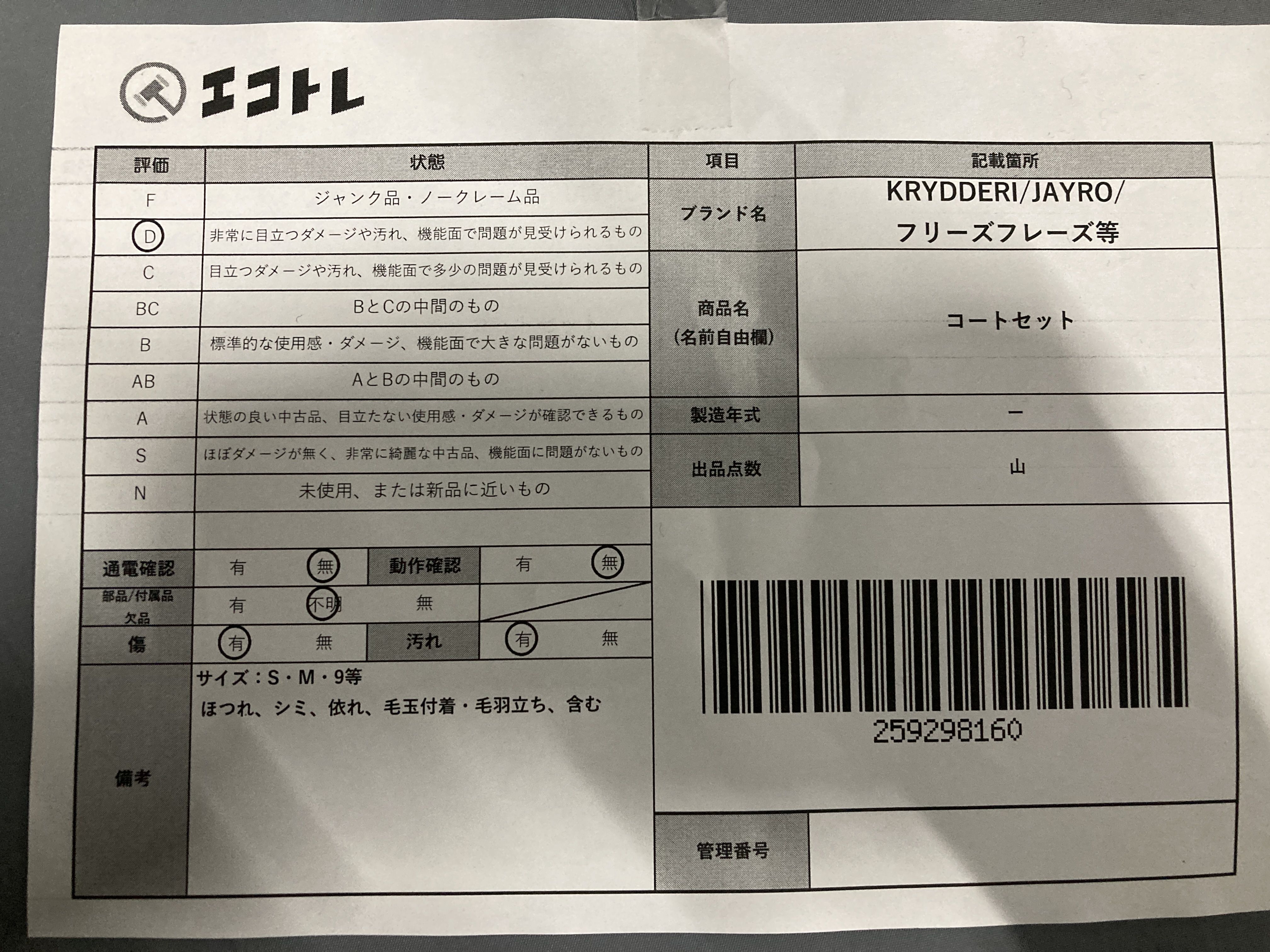 ▼SHIPPING TO JPN ONLY▼ KRYDDERI/JAYRO/フリーズフレーズ等 コートセット","タイプライン":"","カテゴリ":"アパレル","形状コード":"コート","付属品コード":"","シリアル・シール・型番":""