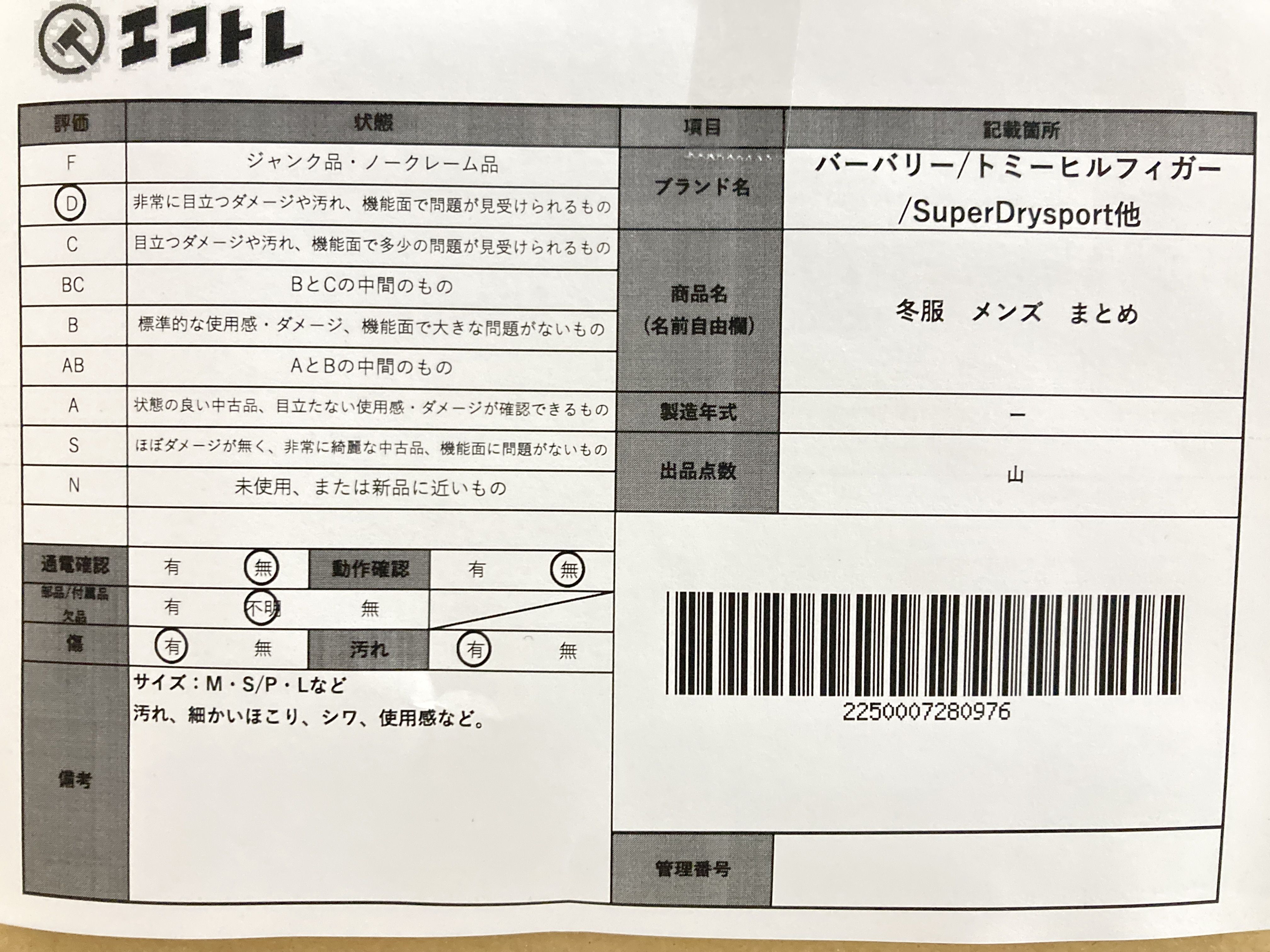 ▼SHIPPING TO JPN ONLY▼ 冬服 メンズ まとめ バーバリー等","タイプライン":"","カテゴリ":"アパレル","形状コード":"ジャケット","付属品コード":"","シリアル・シール・型番":""