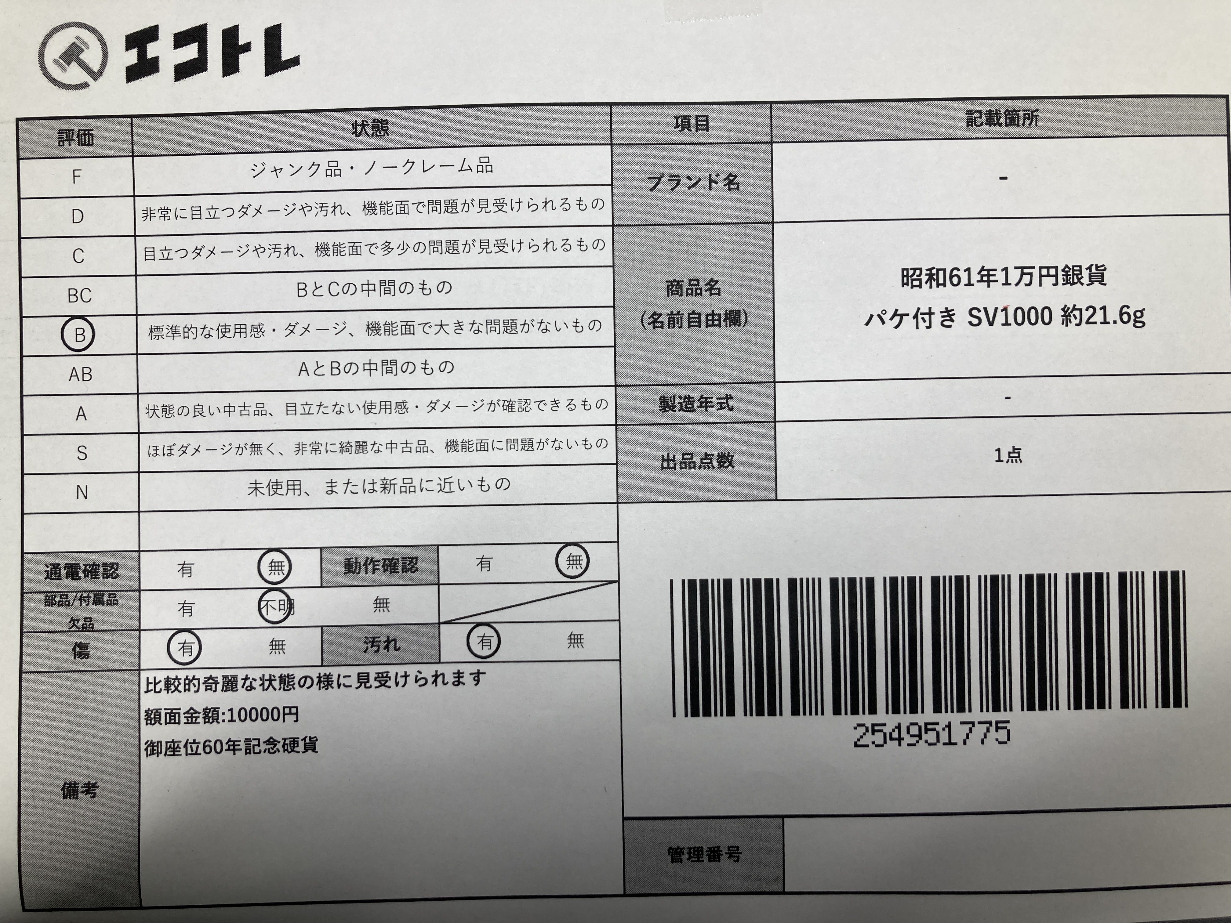 ▼SHIPPING TO JPN ONLY▼ 昭和61年1万円銀貨 パケ付き SV1000 約21.6g","タイプライン":"","カテゴリ":"貴金属","形状コード":"その他小物(貴金属)","付属品コード":"","シリアル・シール・型番":""