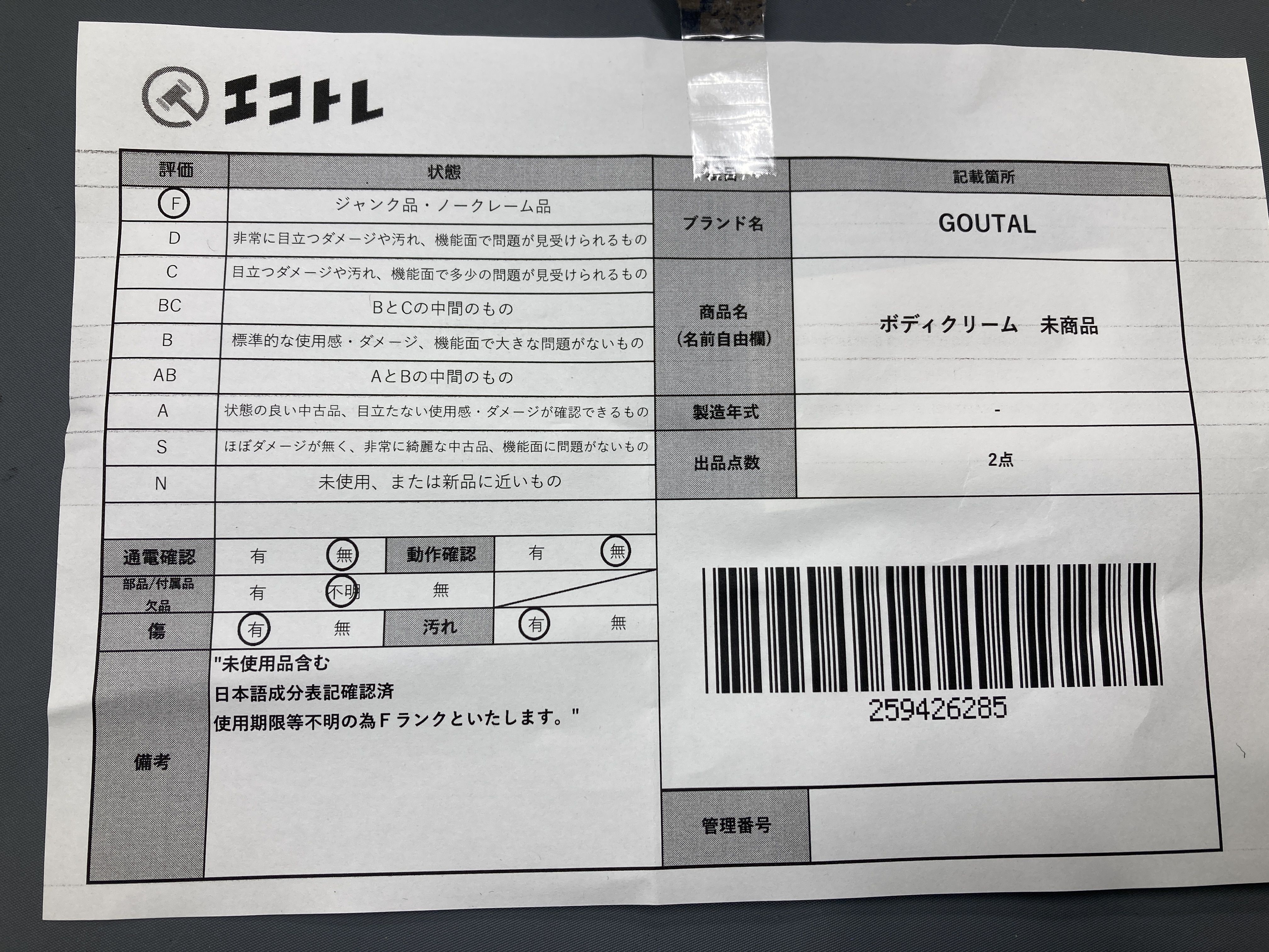 ▼SHIPPING TO JPN ONLY▼ GOUTALボディクリーム 未商品","タイプライン":"","カテゴリ":"消耗品","形状コード":"日用品","付属品コード":"","シリアル・シール・型番":""