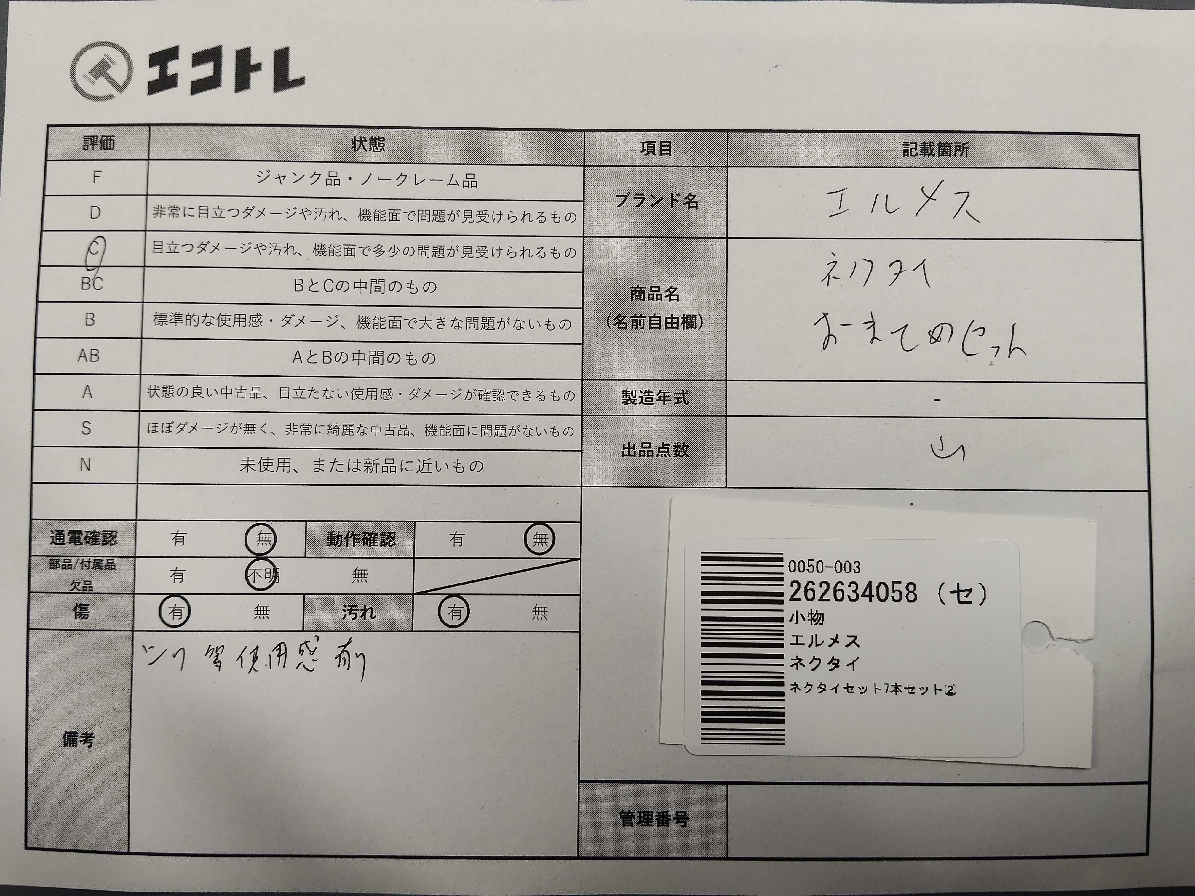 商品内容によって、JITBOXなどでの発送となる可能性がございます事ご理解下さい。年式などの商品情報詳細は写真にてご確認願います。※ご入札の際はご利用規約をよくお読みになってからのご参加お願いします。","タイプライン": "", "カテゴリ": "アパレル", "形状コード": "ネクタイ", "付属品コード": "", "シリアル・シール・型番": ""