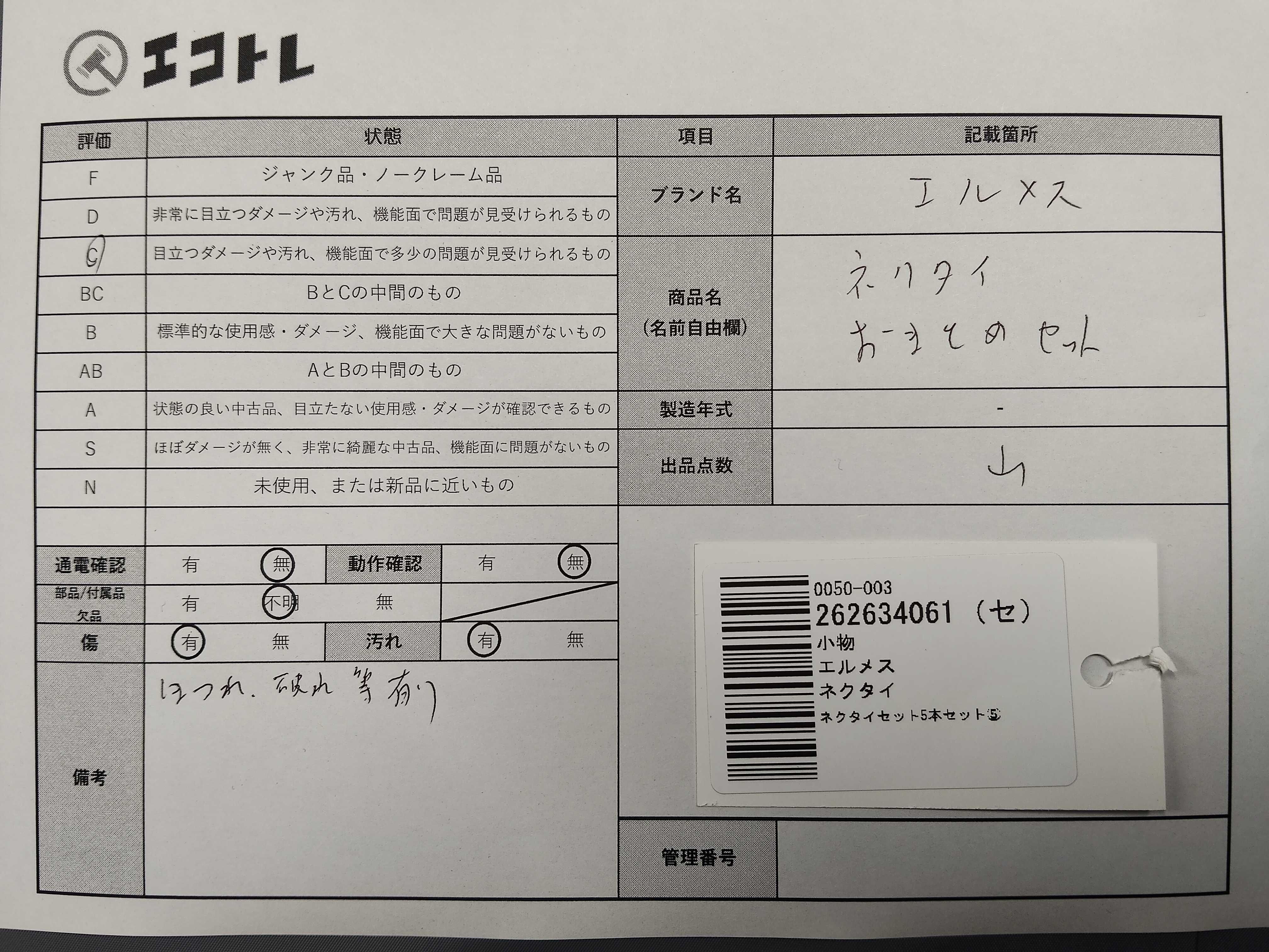 商品内容によって、JITBOXなどでの発送となる可能性がございます事ご理解下さい。年式などの商品情報詳細は写真にてご確認願います。※ご入札の際はご利用規約をよくお読みになってからのご参加お願いします。","タイプライン": "", "カテゴリ": "アパレル", "形状コード": "ネクタイ", "付属品コード": "", "シリアル・シール・型番": ""