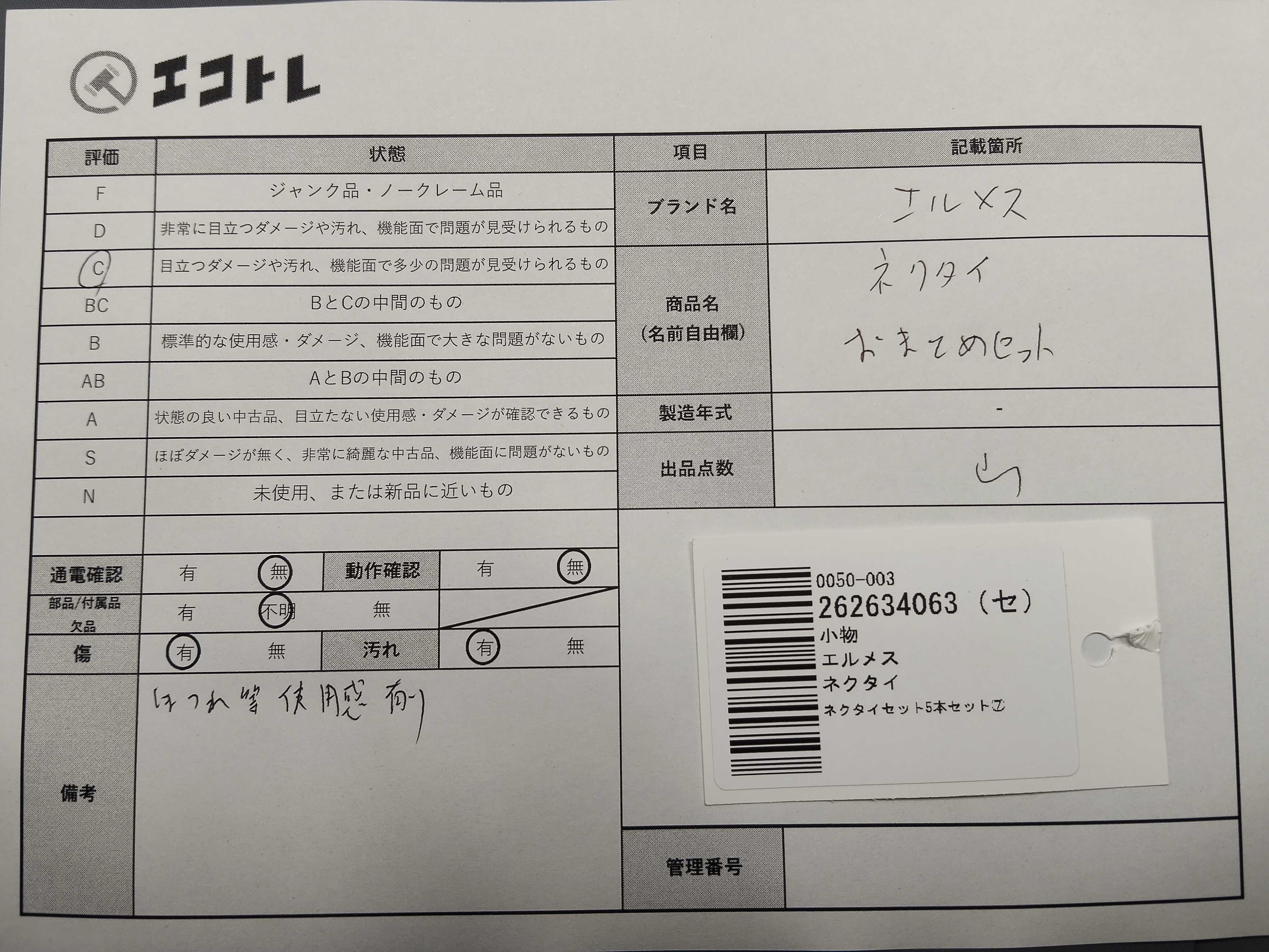 商品内容によって、JITBOXなどでの発送となる可能性がございます事ご理解下さい。年式などの商品情報詳細は写真にてご確認願います。※ご入札の際はご利用規約をよくお読みになってからのご参加お願いします。","タイプライン": "", "カテゴリ": "アパレル", "形状コード": "ネクタイ", "付属品コード": "", "シリアル・シール・型番": ""