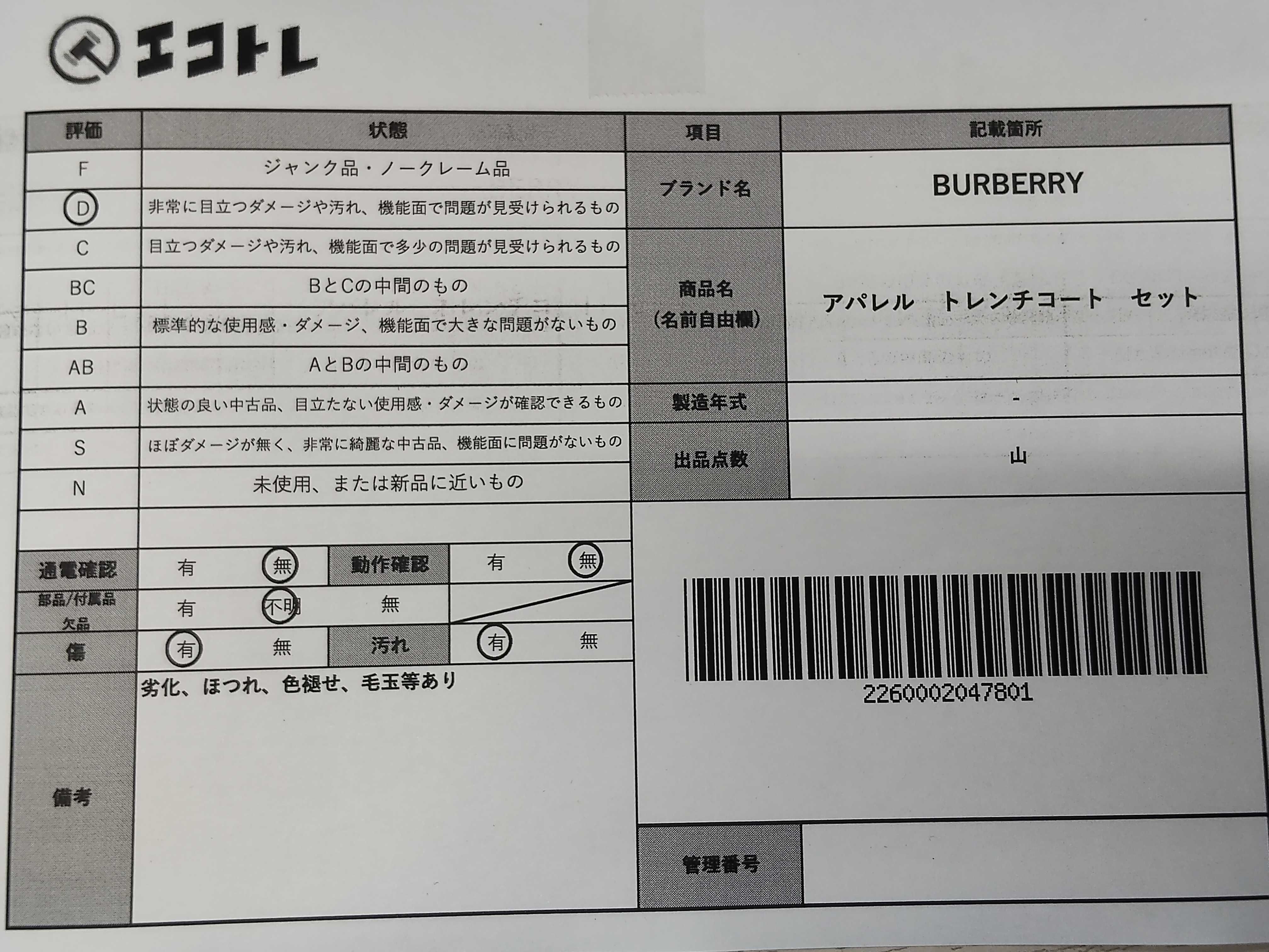商品内容によって、JITBOXなどでの発送となる可能性がございます事ご理解下さい。年式などの商品情報詳細は写真にてご確認願います。※ご入札の際はご利用規約をよくお読みになってからのご参加お願いします。","タイプライン": "", "カテゴリ": "アパレル", "形状コード": "その他アパレル", "付属品コード": "", "シリアル・シール・型番": ""
