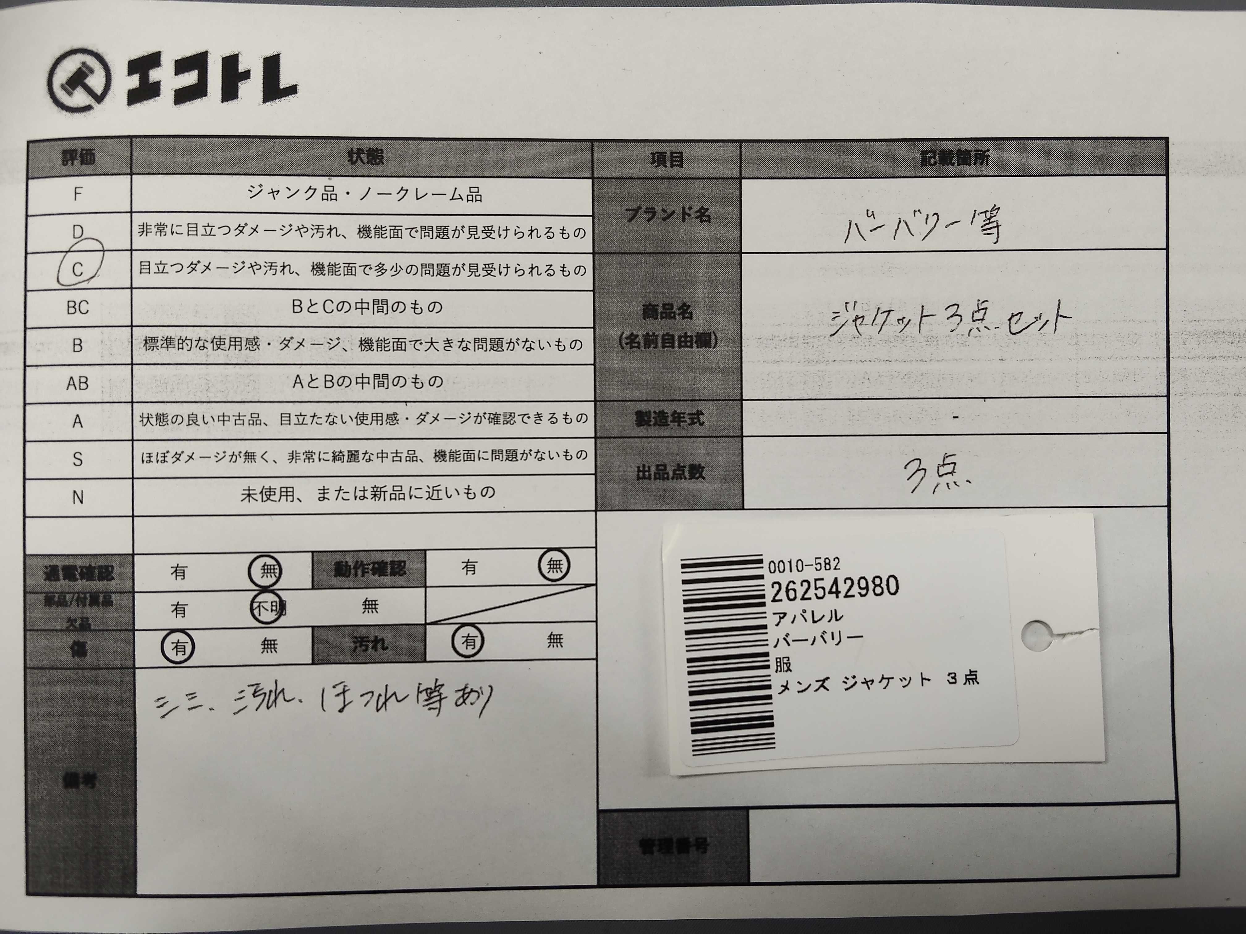 商品内容によって、JITBOXなどでの発送となる可能性がございます事ご理解下さい。年式などの商品情報詳細は写真にてご確認願います。※ご入札の際はご利用規約をよくお読みになってからのご参加お願いします。","タイプライン": "", "カテゴリ": "アパレル", "形状コード": "ジャケット", "付属品コード": "", "シリアル・シール・型番": ""