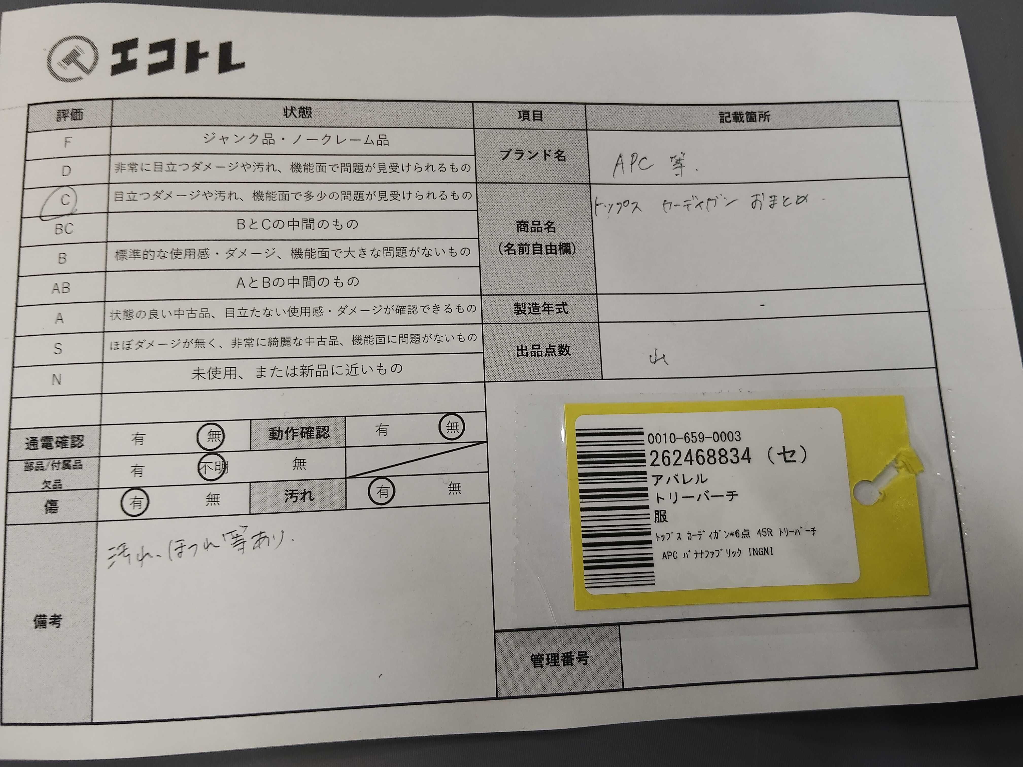 商品内容によって、JITBOXなどでの発送となる可能性がございます事ご理解下さい。年式などの商品情報詳細は写真にてご確認願います。※ご入札の際はご利用規約をよくお読みになってからのご参加お願いします。","タイプライン": "", "カテゴリ": "アパレル", "形状コード": "トップス", "付属品コード": "", "シリアル・シール・型番": ""