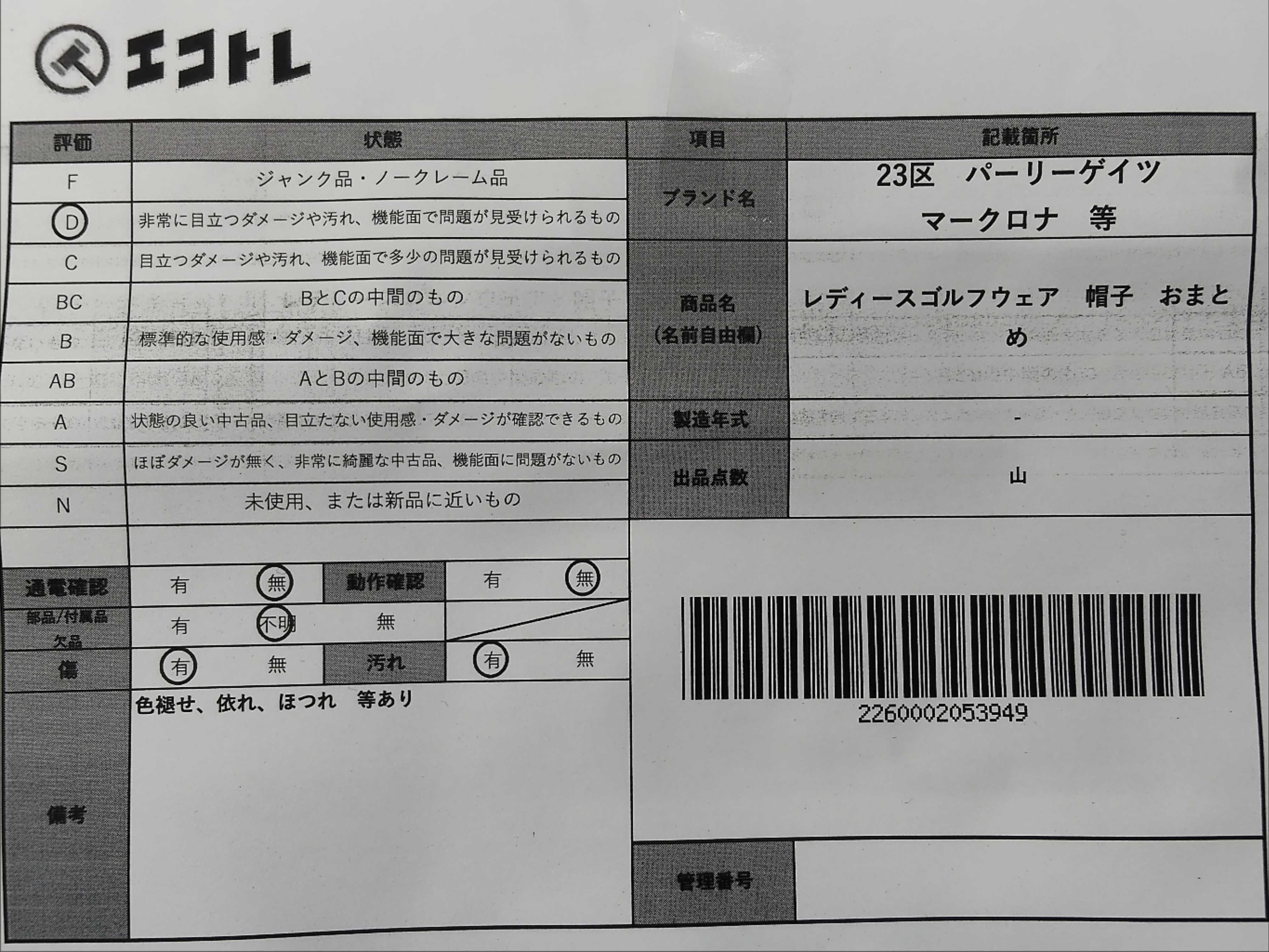 商品内容によって、JITBOXなどでの発送となる可能性がございます事ご理解下さい。年式などの商品情報詳細は写真にてご確認願います。※ご入札の際はご利用規約をよくお読みになってからのご参加お願いします。","タイプライン": "", "カテゴリ": "アパレル", "形状コード": "その他アパレル", "付属品コード": "", "シリアル・シール・型番": ""
