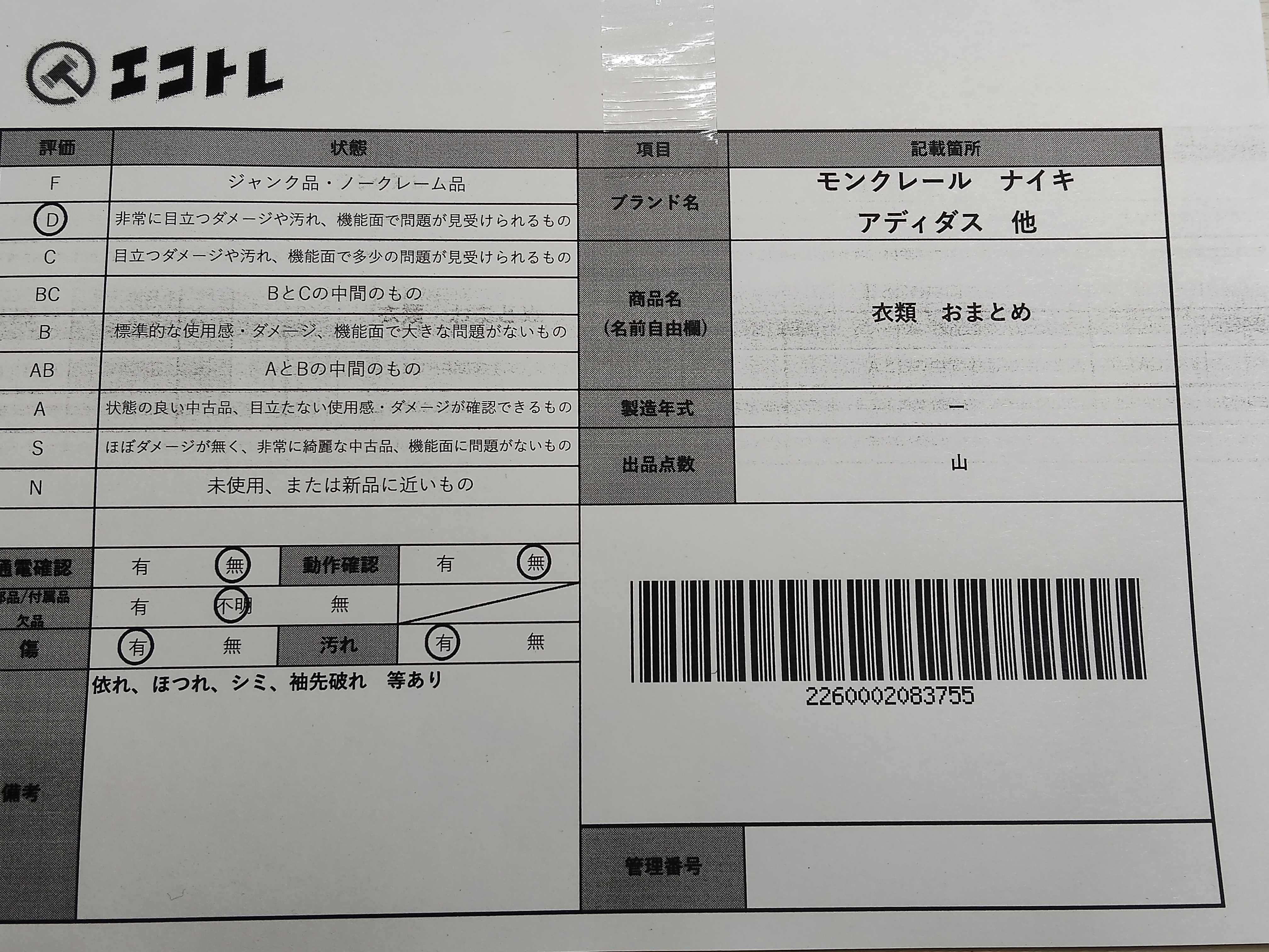 (11946_0104)▼モンクレール ナイキ アディダス 他衣類 おまとめ その他アパレル
