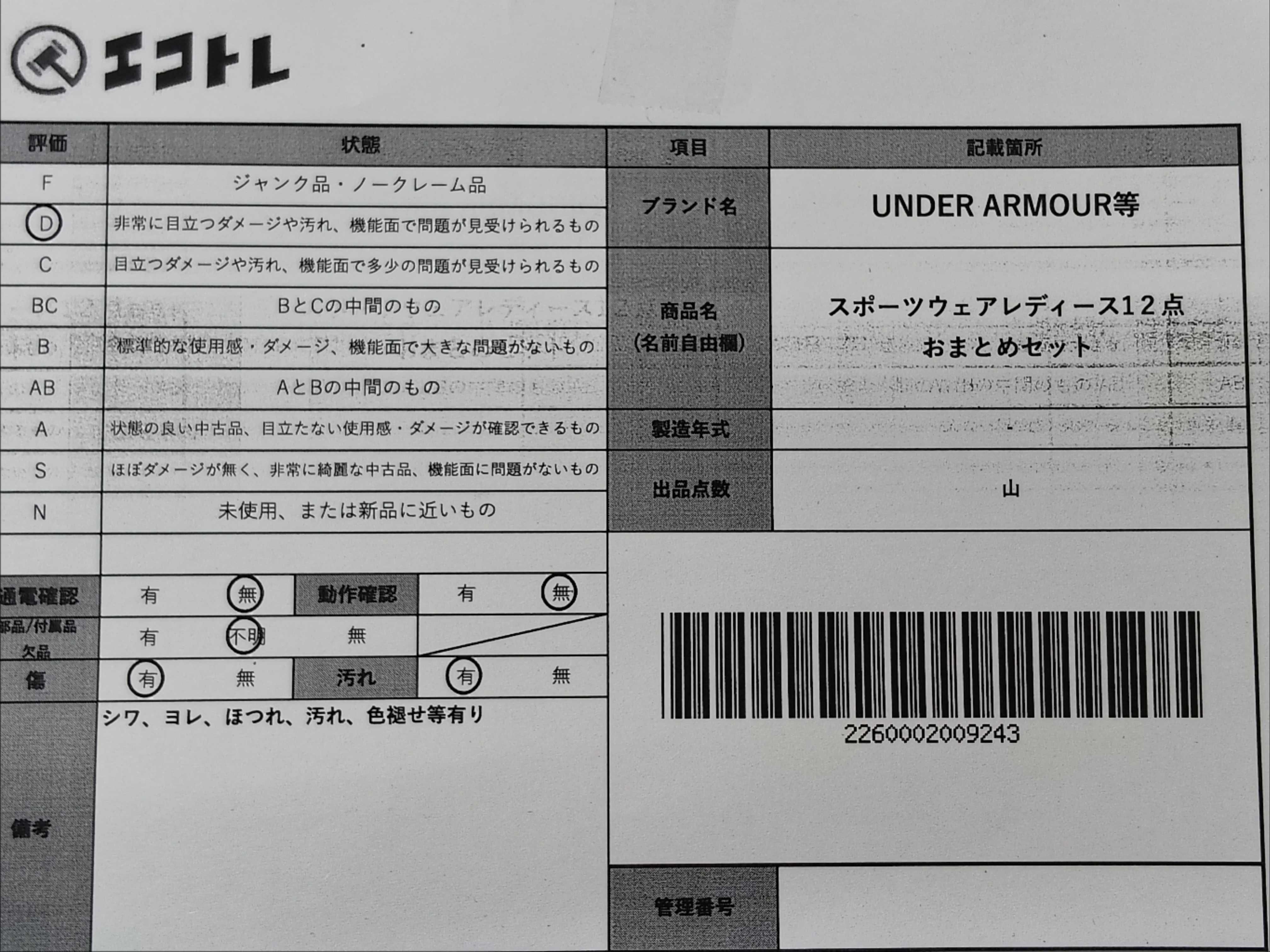 商品内容によって、JITBOXなどでの発送となる可能性がございます事ご理解下さい。年式などの商品情報詳細は写真にてご確認願います。※ご入札の際はご利用規約をよくお読みになってからのご参加お願いします。","タイプライン": "", "カテゴリ": "アパレル", "形状コード": "その他アパレル", "付属品コード": "", "シリアル・シール・型番": ""