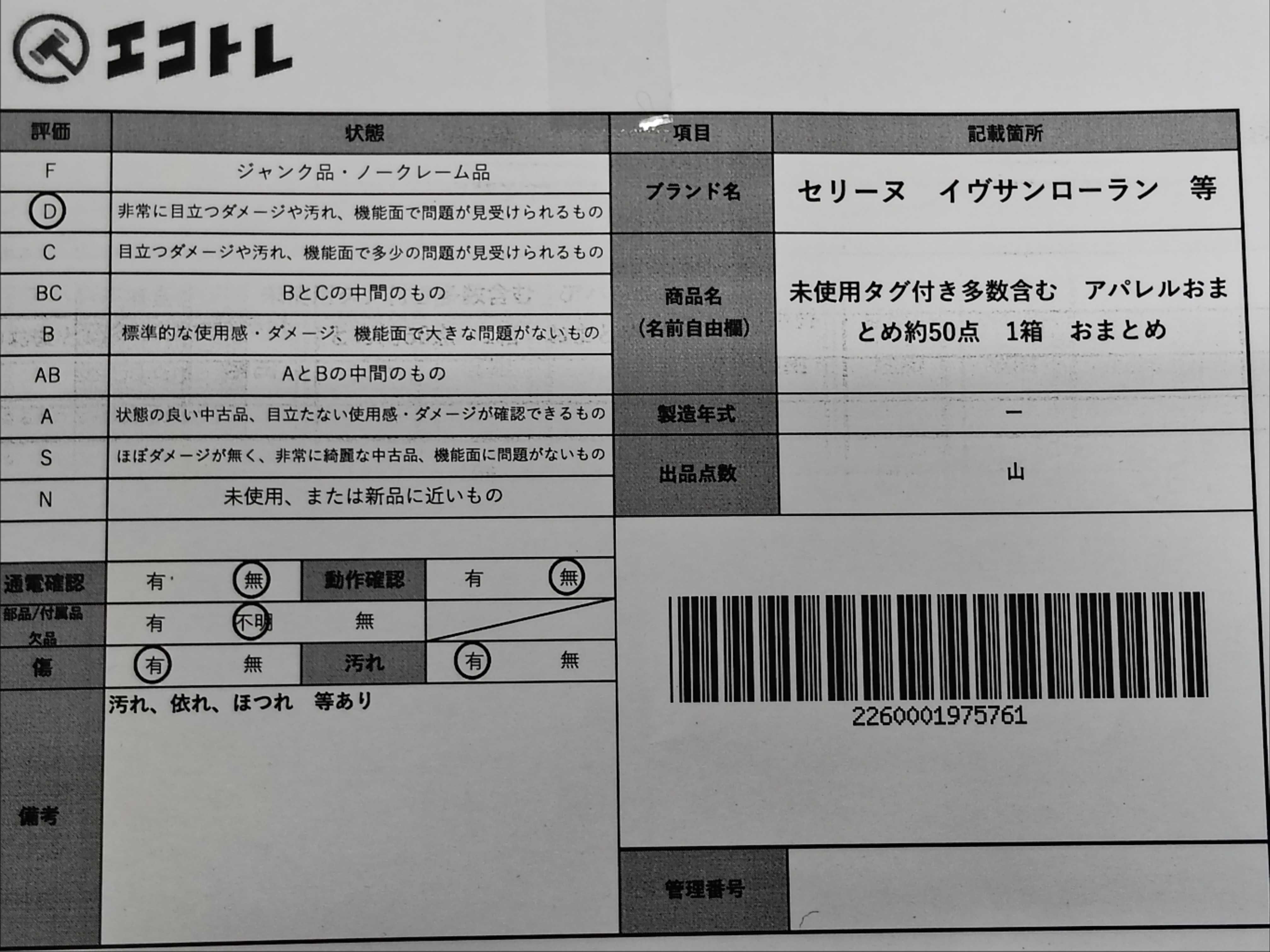 商品内容によって、JITBOXなどでの発送となる可能性がございます事ご理解下さい。年式などの商品情報詳細は写真にてご確認願います。※ご入札の際はご利用規約をよくお読みになってからのご参加お願いします。","タイプライン": "", "カテゴリ": "アパレル", "形状コード": "その他アパレル", "付属品コード": "", "シリアル・シール・型番": ""
