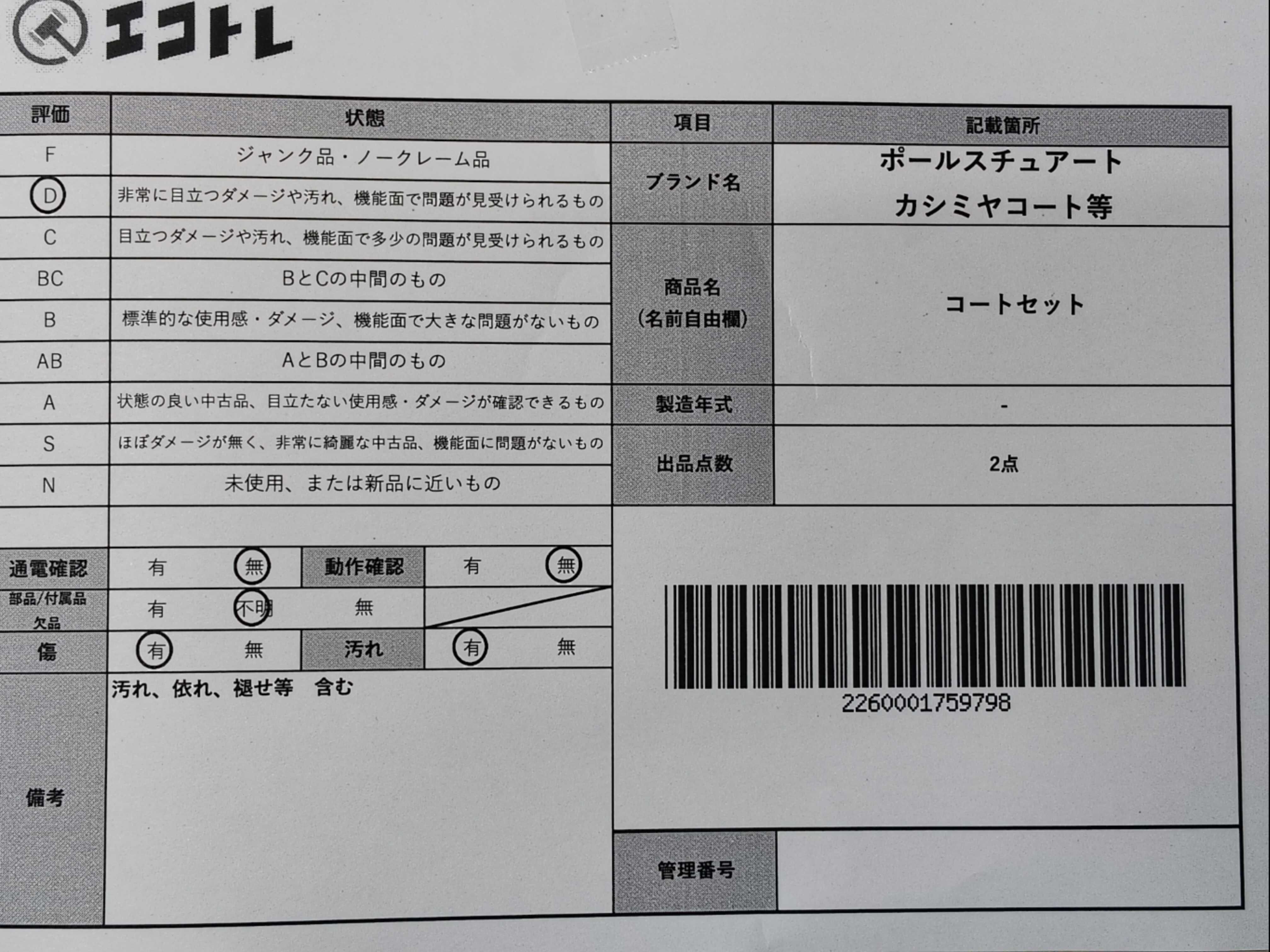 商品内容によって、JITBOXなどでの発送となる可能性がございます事ご理解下さい。年式などの商品情報詳細は写真にてご確認願います。※ご入札の際はご利用規約をよくお読みになってからのご参加お願いします。","タイプライン": "", "カテゴリ": "アパレル", "形状コード": "コート", "付属品コード": "", "シリアル・シール・型番": ""
