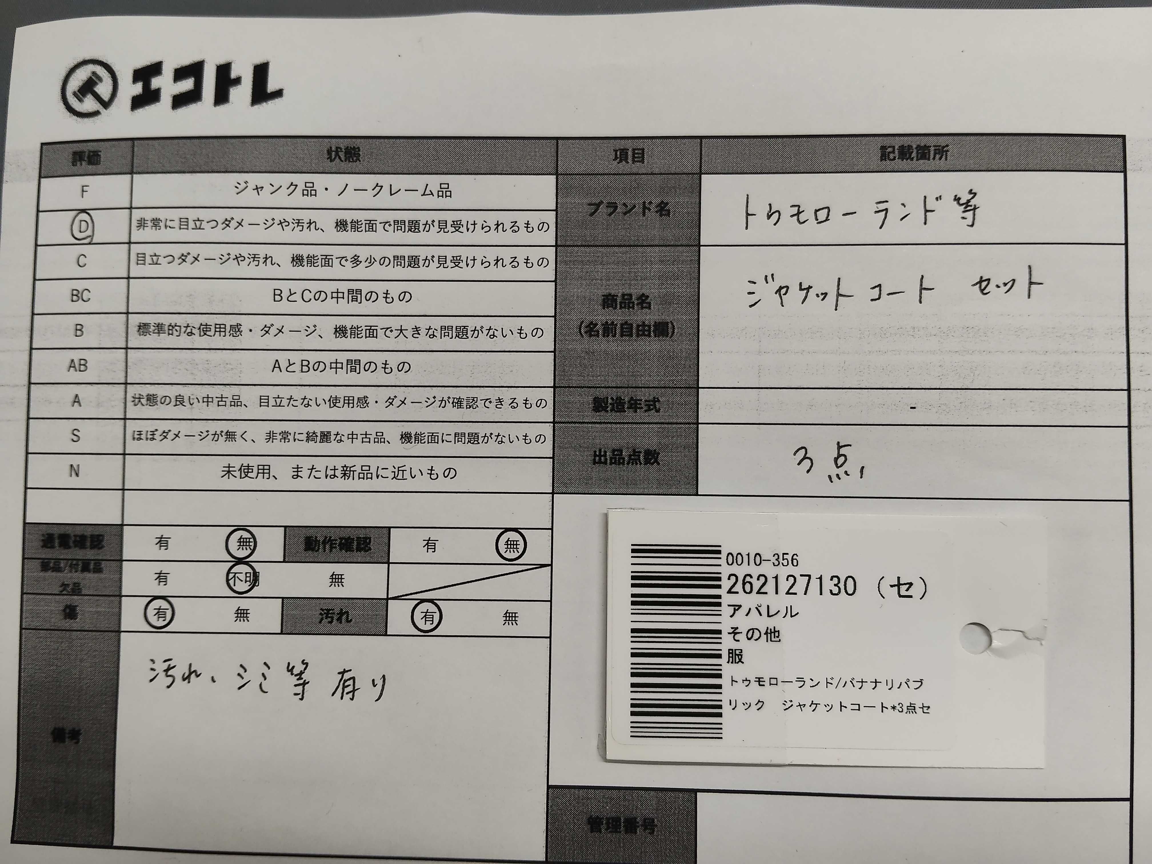 商品内容によって、JITBOXなどでの発送となる可能性がございます事ご理解下さい。年式などの商品情報詳細は写真にてご確認願います。※ご入札の際はご利用規約をよくお読みになってからのご参加お願いします。","タイプライン": "", "カテゴリ": "アパレル", "形状コード": "ジャケット", "付属品コード": "", "シリアル・シール・型番": ""